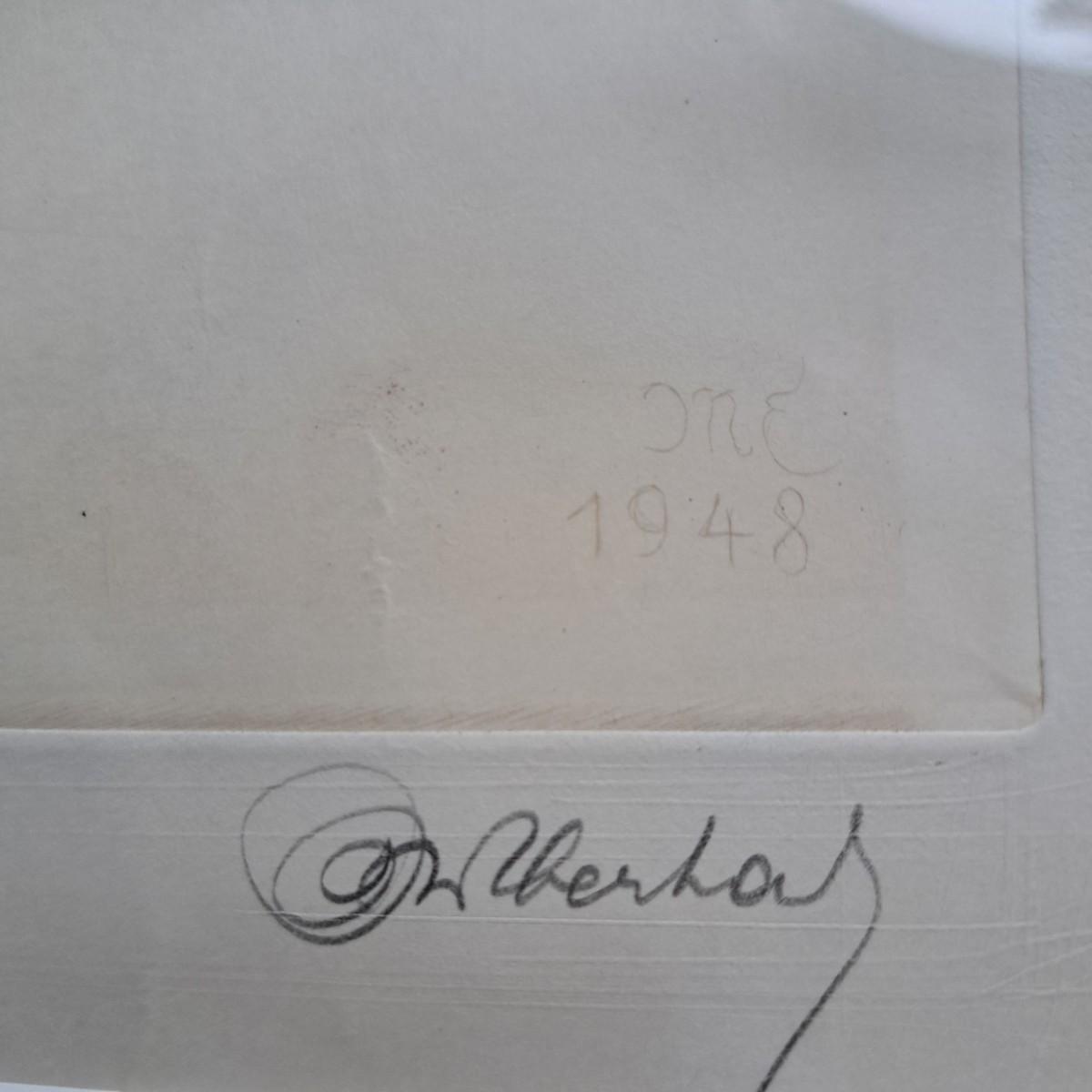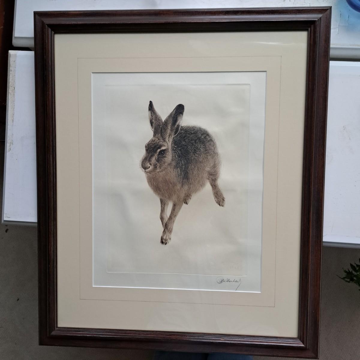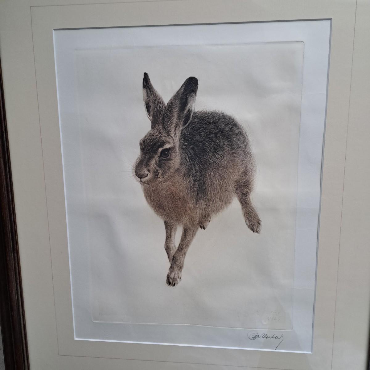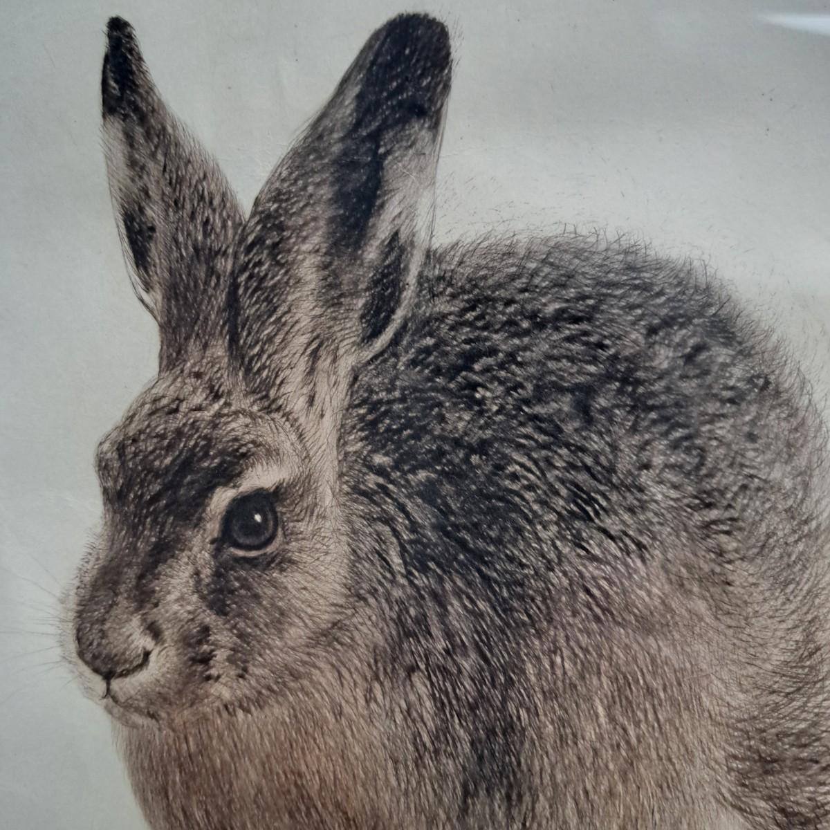 This appears to be a print of a copper plate etching of a hare by Kurt Meyer-Eberhardt (1895-1977). Matted, under glass and set in a simple wooden frame, 21.5" x 25.5H. Image area is 12.5 x 16"H. Artist's signature is signed in pencil at lower right with initials "KME 1948" above signature (*1948 date of printing). A watermark can be partially seen in lower left corner. Print appears to be in very good condition with several very faint, small surface creases and slight buckling of print as shown. Shipping available. Shipping can be costly. We suggest contacting our preferred local shipping provider, Postage Express, with dimensions and getting an estimate before bidding: (828) 255-9250 or shipping@postageexpressnc.com.