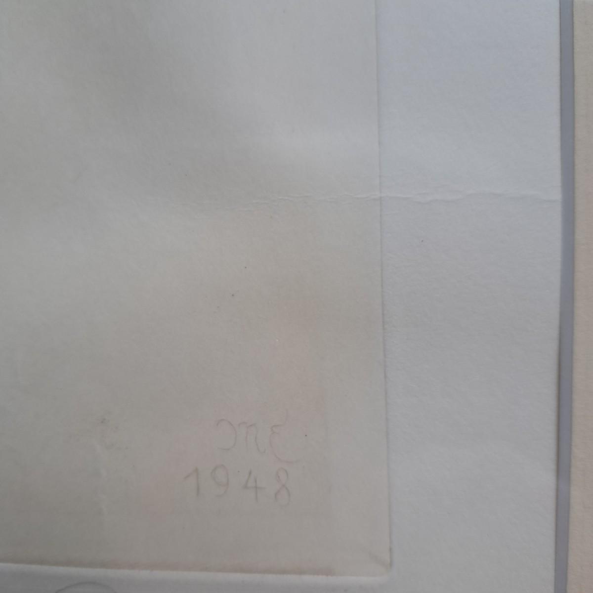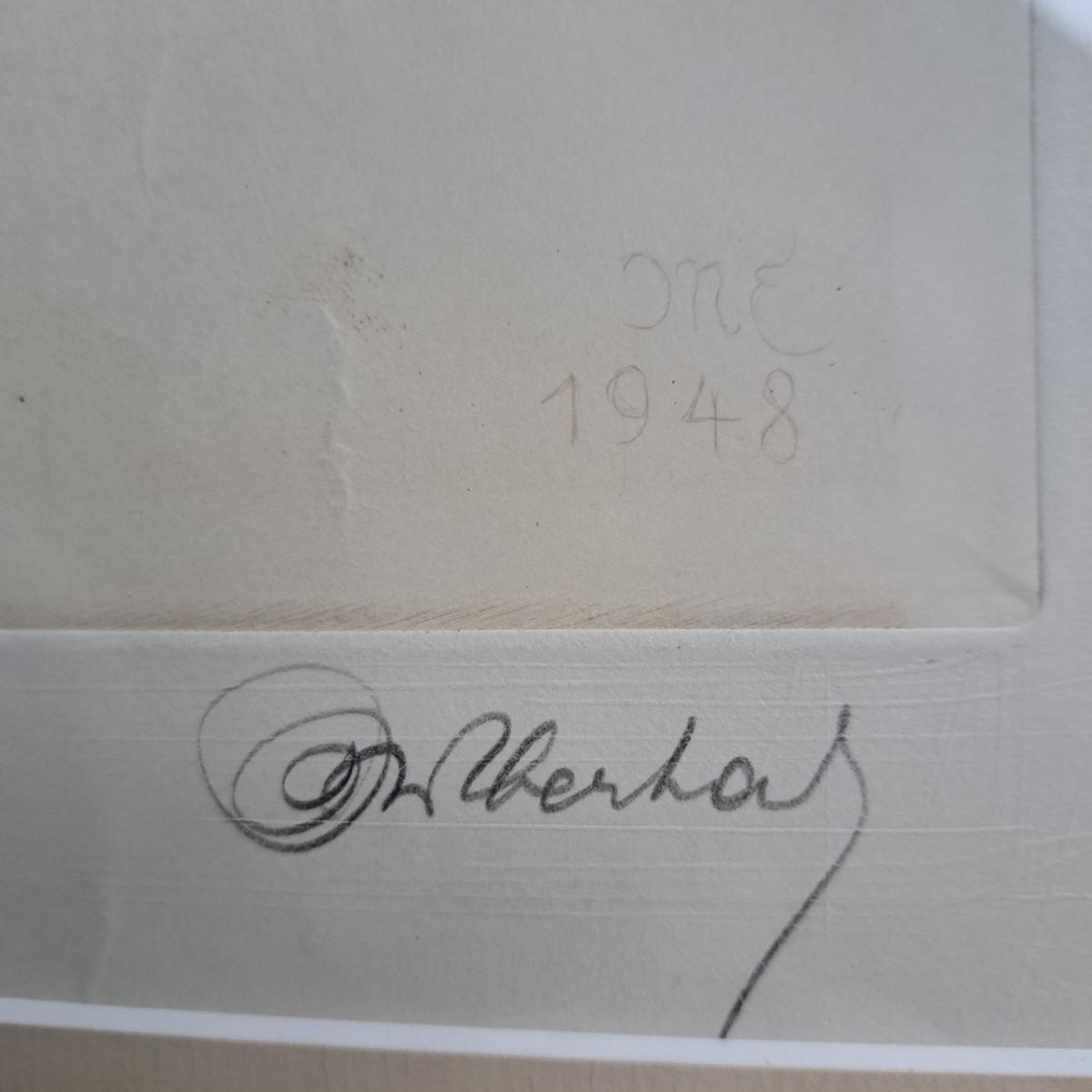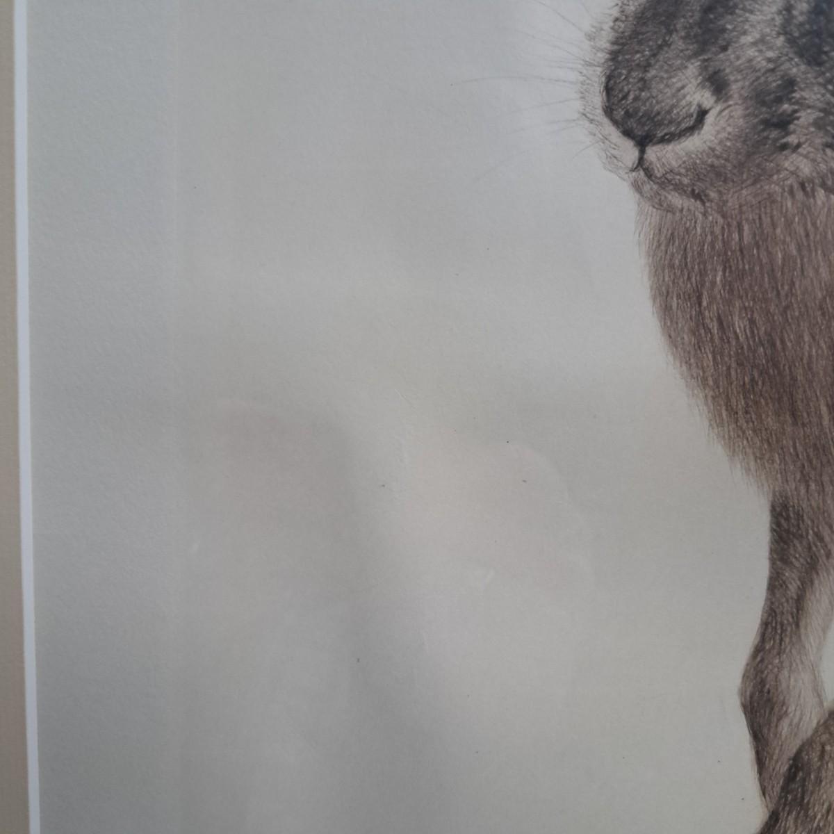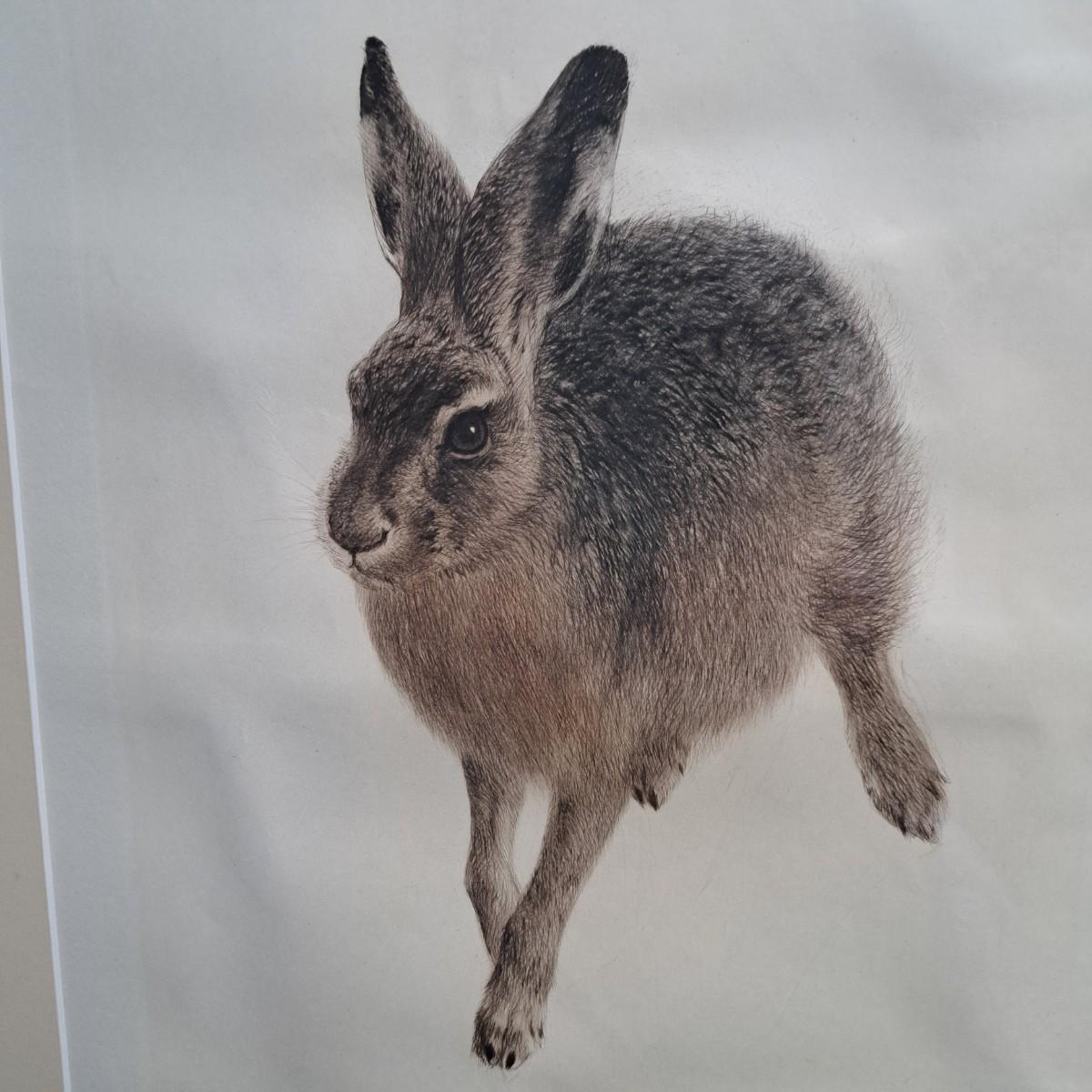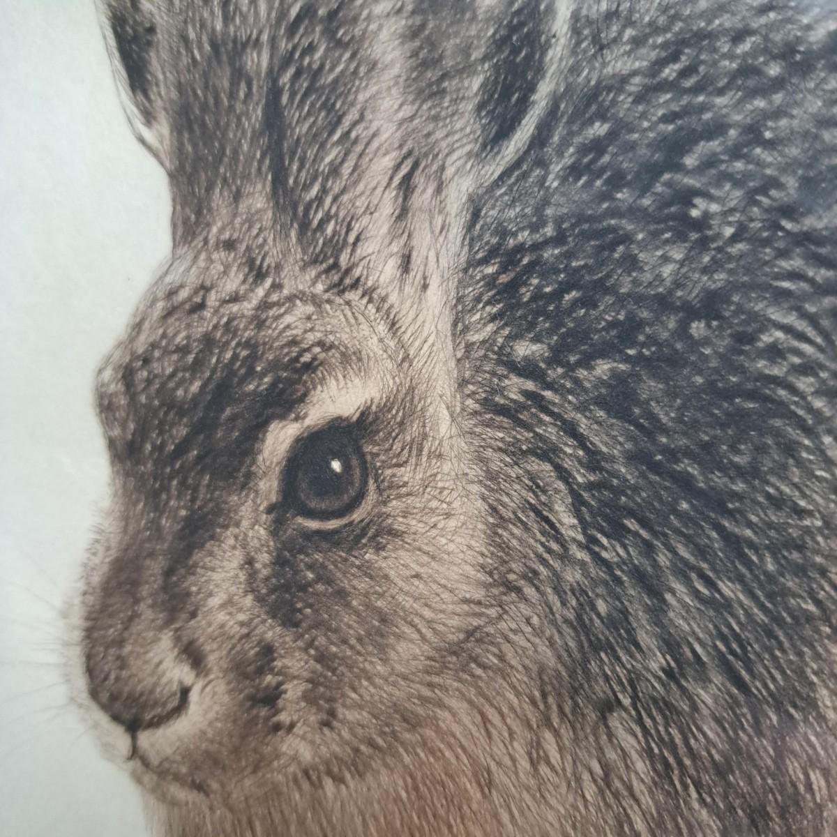 This appears to be a print of a copper plate etching of a hare by Kurt Meyer-Eberhardt (1895-1977). Matted, under glass and set in a simple wooden frame, 21.5" x 25.5H. Image area is 12.5 x 16"H. Artist's signature is signed in pencil at lower right with initials "KME 1948" above signature (*1948 date of printing). A watermark can be partially seen in lower left corner. Print appears to be in very good condition with several very faint, small surface creases and slight buckling of print as shown. Shipping available. Shipping can be costly. We suggest contacting our preferred local shipping provider, Postage Express, with dimensions and getting an estimate before bidding: (828) 255-9250 or shipping@postageexpressnc.com.