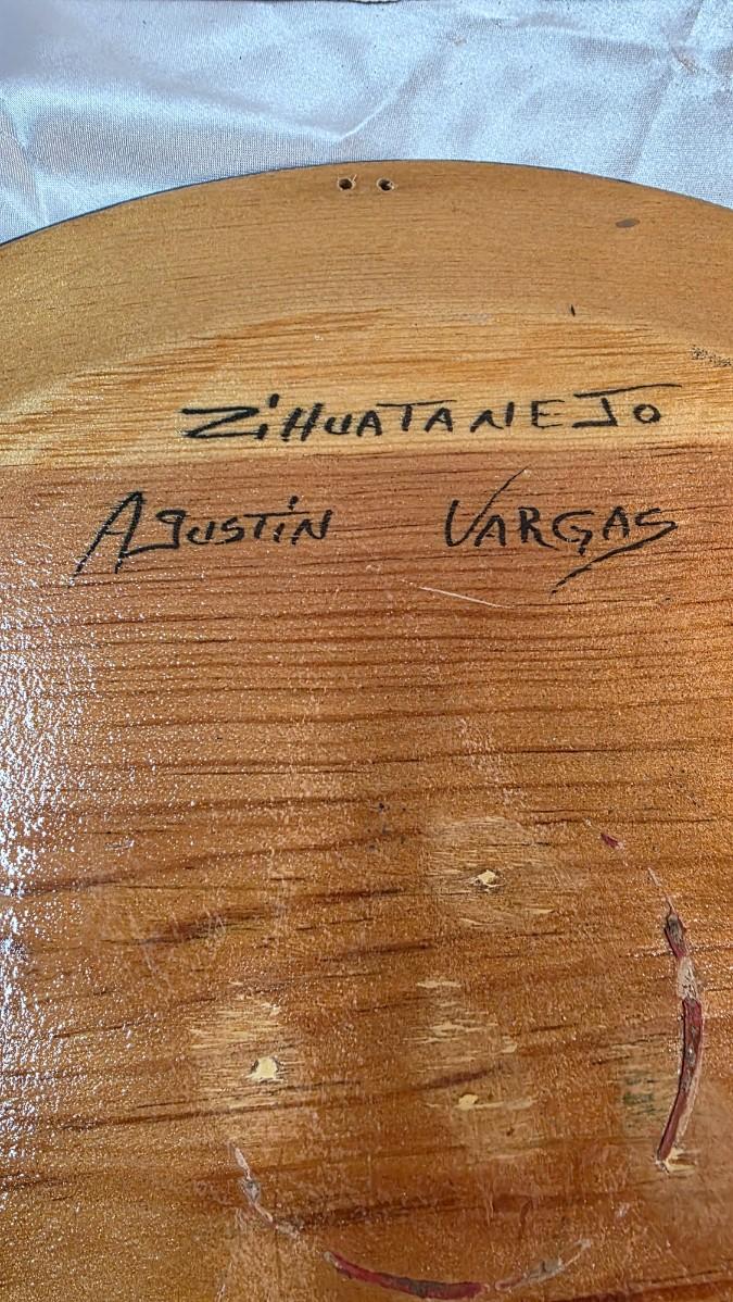Crafted on a solid wood base and finished with a high-gloss lacquer, the platter exhibits the hallmarks of authentic Mexican folk art: confident brushwork, layered color fields, and rhythmic patterning that gives the composition both movement and warmth. The reverse bears Vargas’s hand-written signature, confirming authorship and elevating the piece beyond decorative craft into collectible folk fine art.