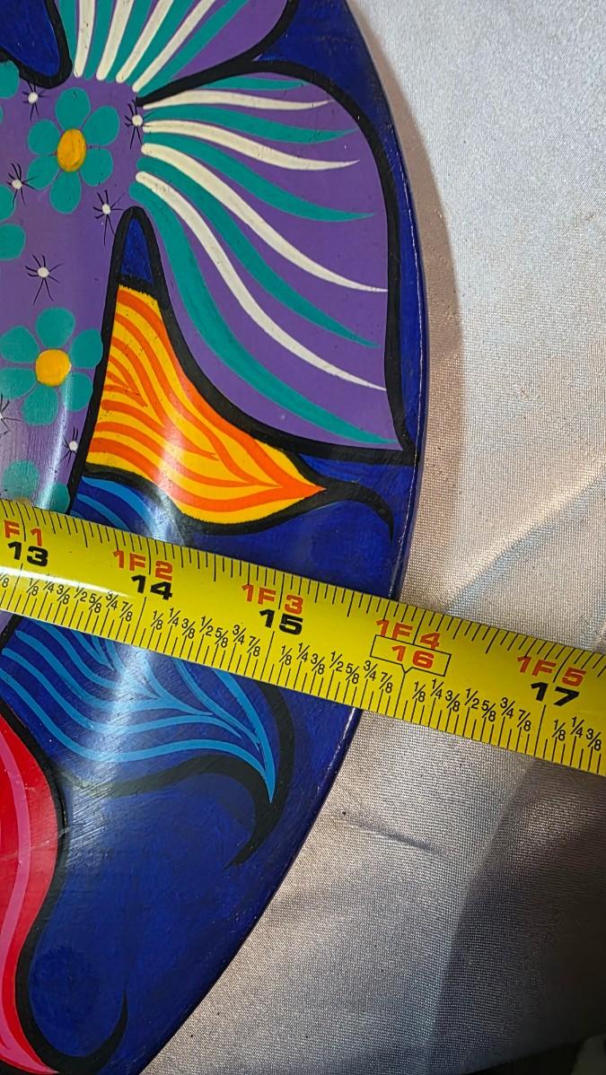 With a diameter measuring approximately 16 inches, this piece is ideally suited for wall display as statement décor, while also functioning as a sculptural platter or tabletop accent. The surface shows minor age-consistent wear on the back, consistent with vintage handmade works, while the front presentation remains vivid and visually striking.