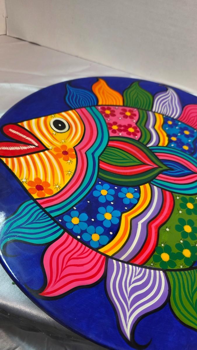 This vibrant and expressive Mexican folk art platter is an original hand-painted work by Agustin Vargas, a noted Mexican architect and fine artist trained at the National Autonomous University of Mexico (UNAM) and the historic Academy of San Carlos. The piece features a boldly stylized fish rendered in saturated cobalt blue, emerald green, turquoise, crimson, violet, and golden yellow, unified by flowing lines and floral motifs that reflect traditional Mexican decorative symbolism.