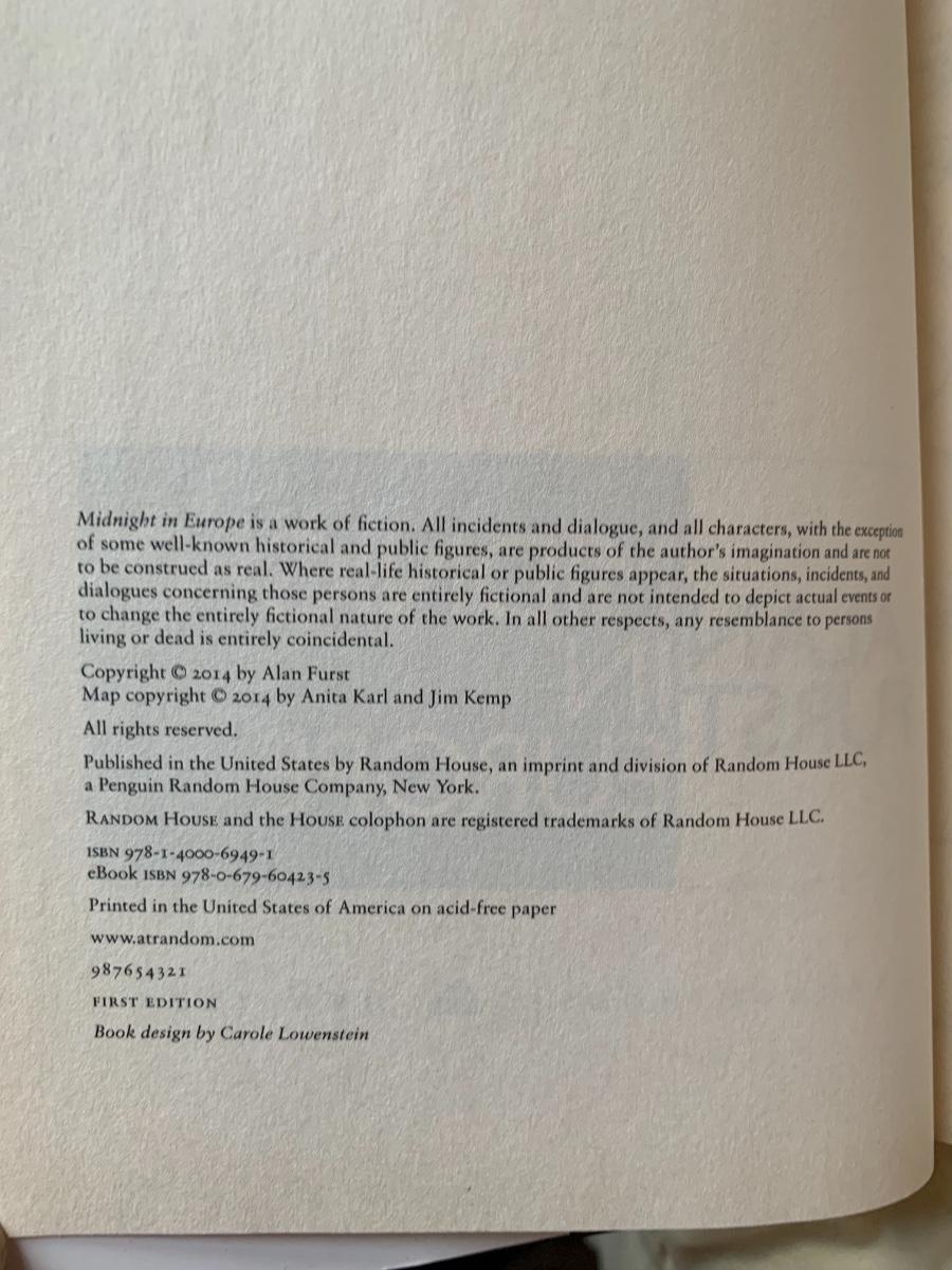 SIgned first edition of Midnight in Europe by Alan Furst.