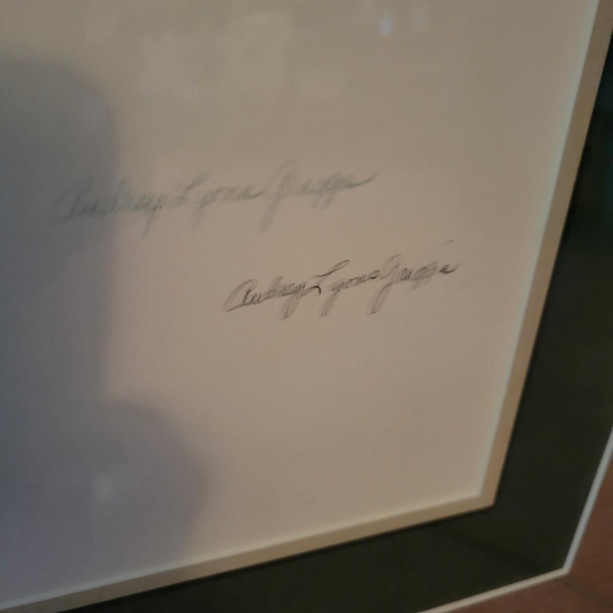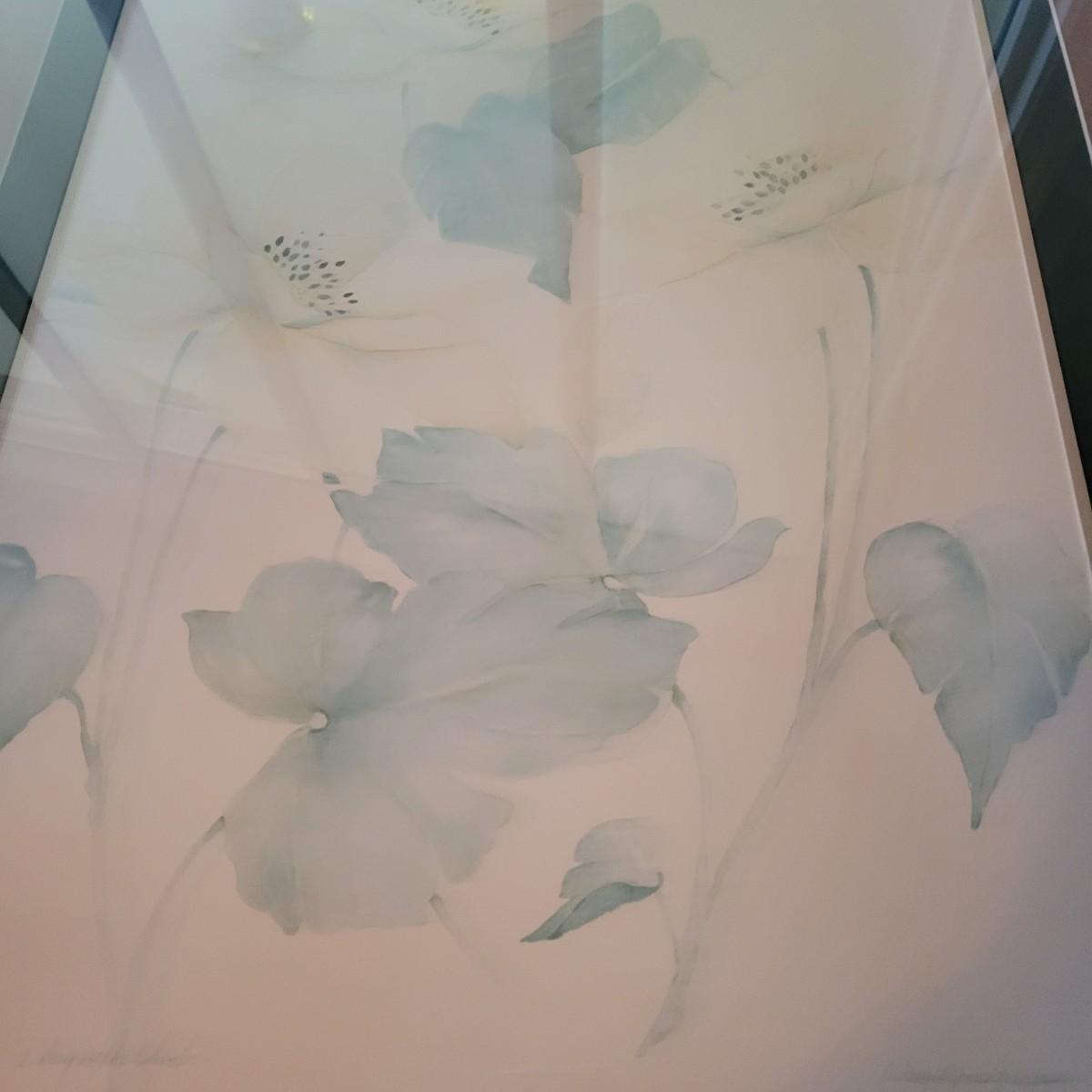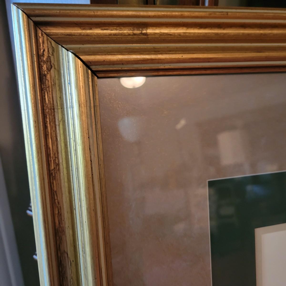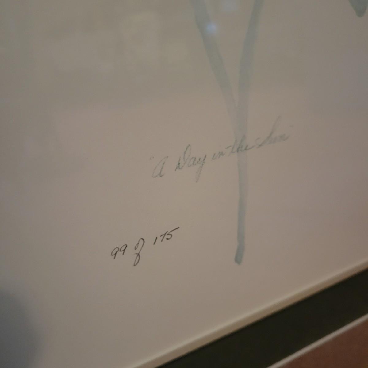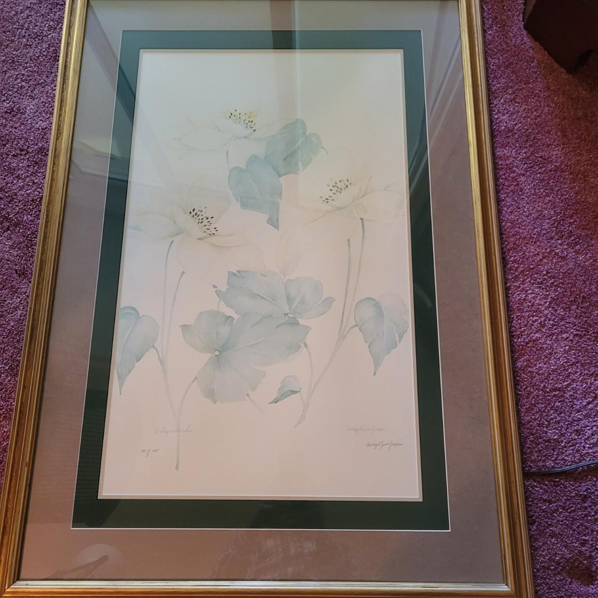 This signed and numbered print is in good condition with one corner of the frame gaping. It appears to be pencil signed by artist and numbered the same way. This piece is by Audrey Lyons Griggs and is numbered 99 of 175 titled "A Day in the Sun" and is a floral print of a water color. Tastefully framed in a wood, gold leaf frame with a triple mat. Measures approximately 31" x43.5" x 1.5". Shipping available. Shipping Art can be costly please call UPS store at 828-252-6930 for quote