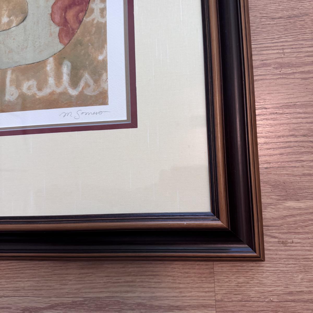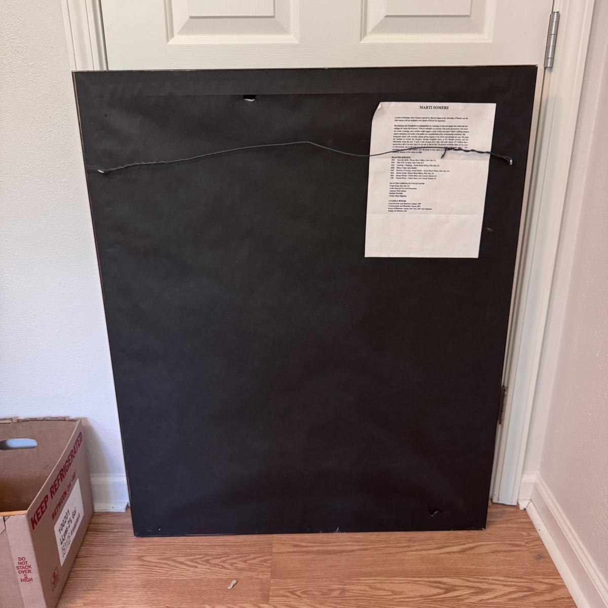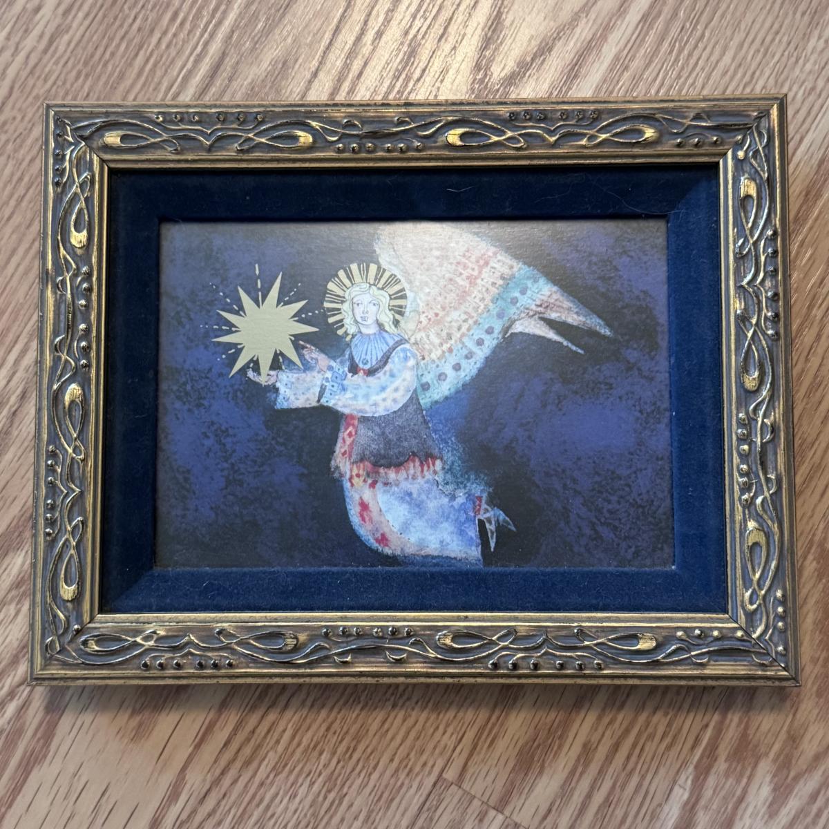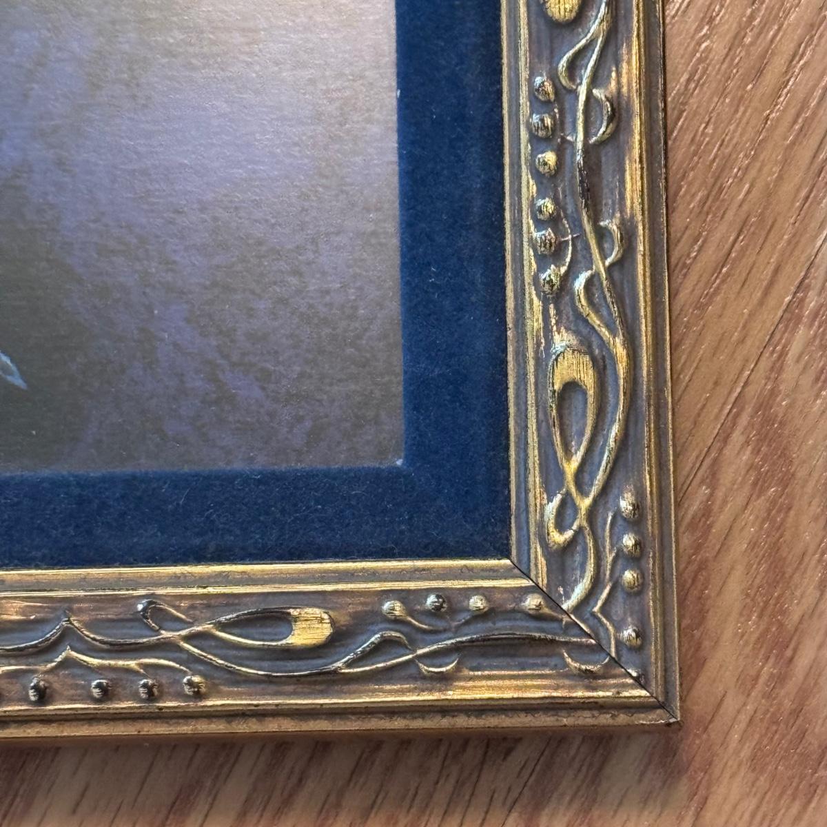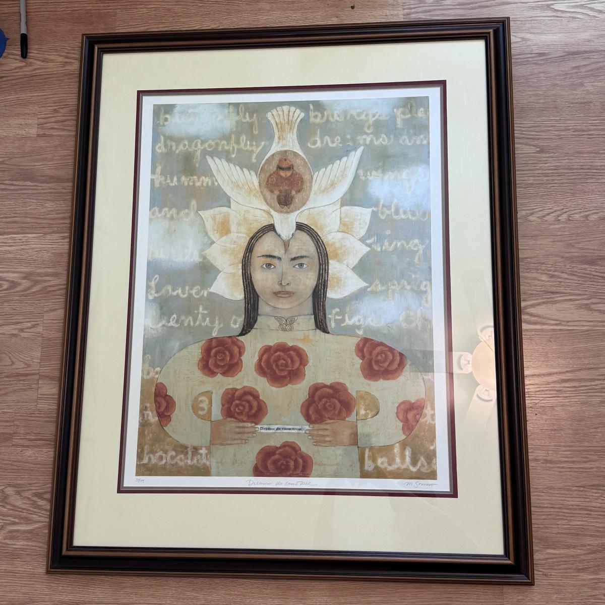 Lot includes one very large, pencil signed and numbered print titled “Dreams do come true” by Marti Somers. It is numbered with 33/95. Also included is a small piece of art with a similar style to the larger. It involves an angel holding a star. The art is protected in an ornate wooden frame that has been painted gold, blue velvet matting, and a sheet of glass. The Marti Somers print is protected with a wooden frame, sheet of glass, and has been matted five times. On the back of the frame, there is a small rip in the paper about the size of a nickle - see picture included. The frame measures 32” x 39”H and the smaller frame measures 9.5” x 7.5”H. Shipping available.Shipping available. Shipping can be costly. We suggest contacting our preferred local shipping provider, Postage Express, with dimensions and getting an estimate before bidding: (828) 255-9250 or shipping@postageexpressnc.com.
