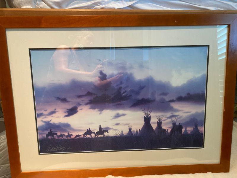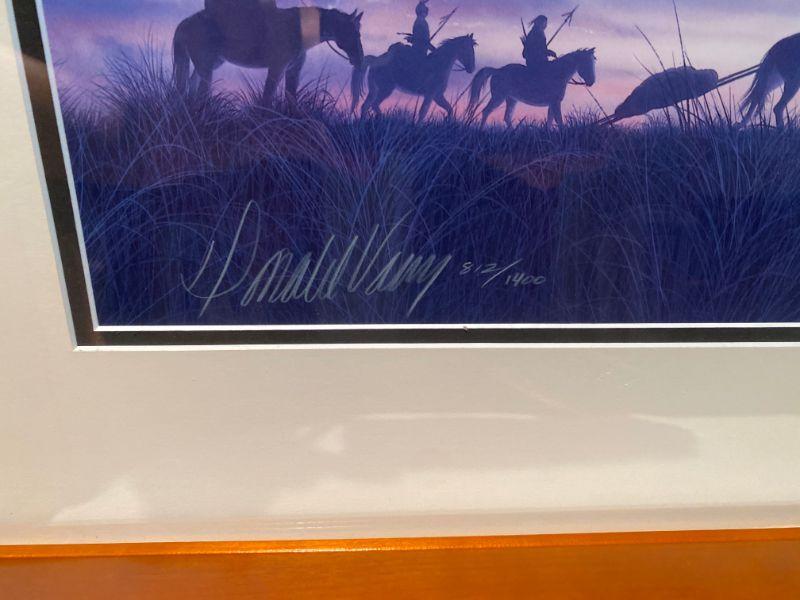 Signed and Numbered Print by David Vann" Returning with the Prize" # 812/1400depicting silhouetted Indians on horseback and Tee-Pees against sunset sky signed lower left measuring 3' wide x 25.75" tall