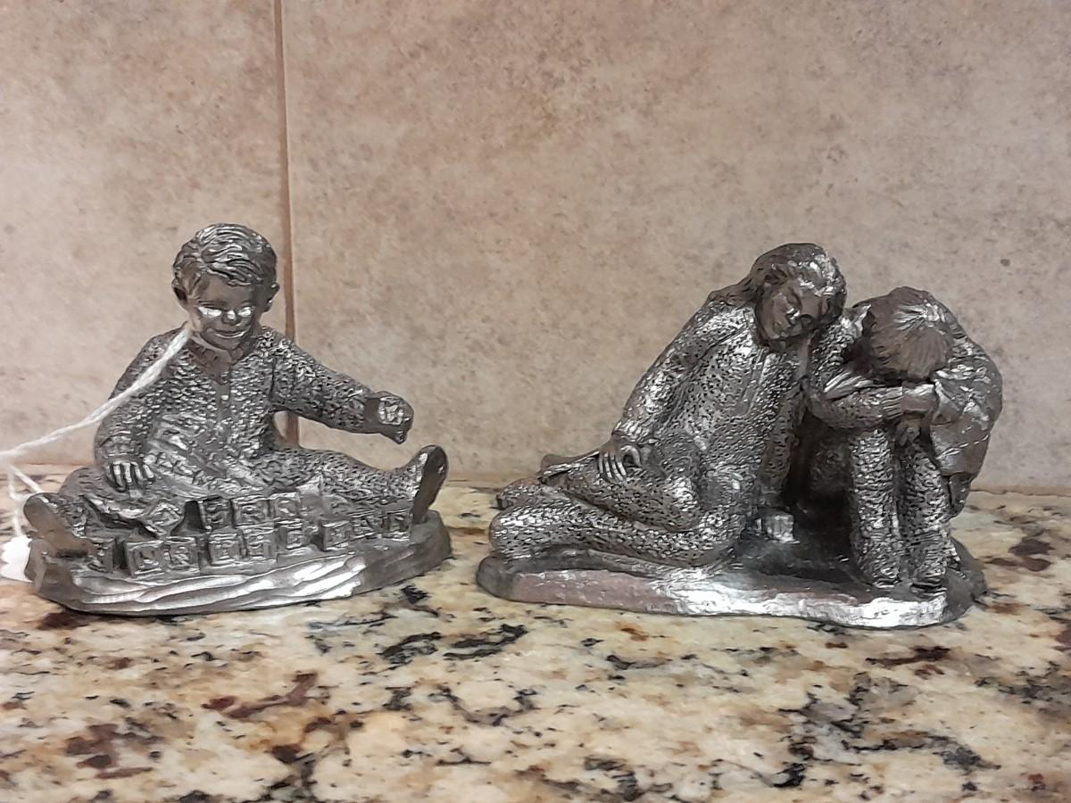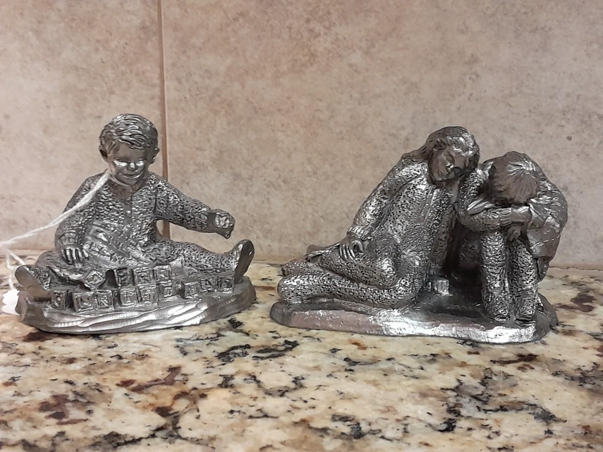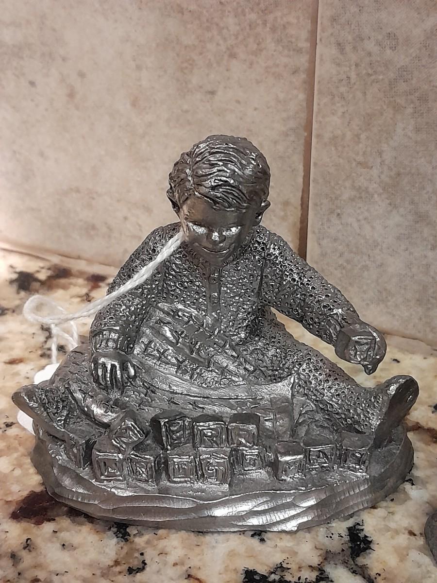 SIGNED AND NUMBERED RICKER PEWTER COLLECTABLES GIRL AND BOY SITTING AND BOY WITH BLOCKS