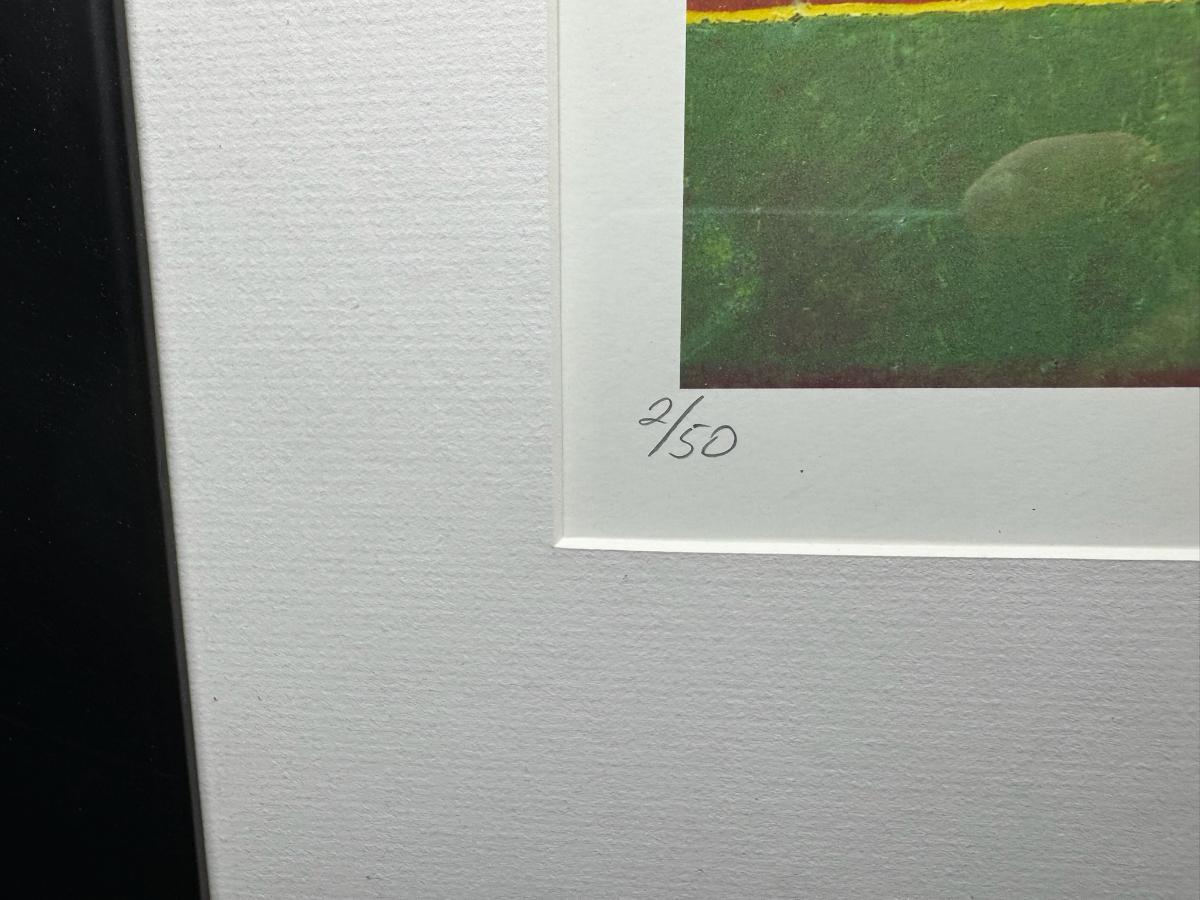 This serigraph is believed to be mid-century modern. It has vibrant greens and yellows, with hints of red and orange. Numbered 2/50. Measurement: 19”H x 23”W (framed). Pre-auction estimate: $50-$100. [JL]