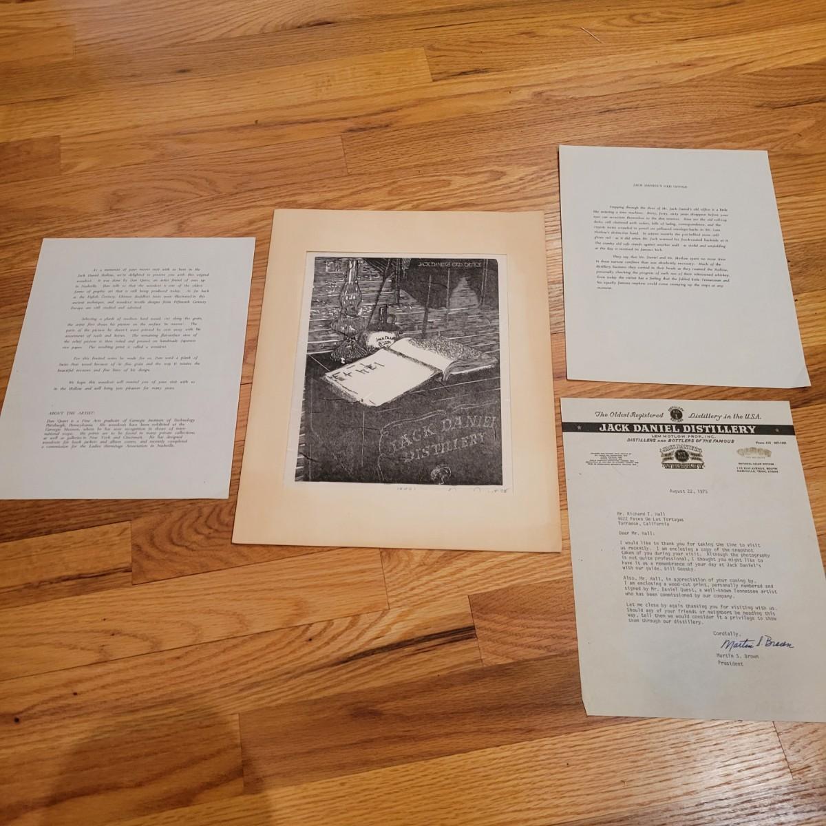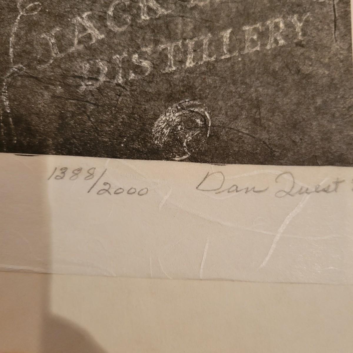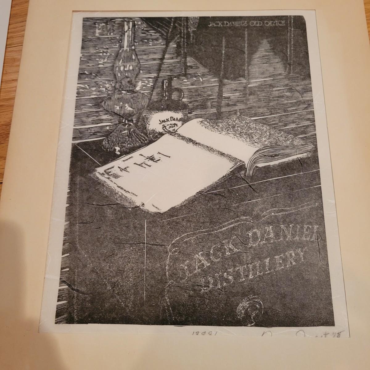 A pencil signed and numbered woodblock print by Dan Quest of Jack Daniel's old office. This piece is pressed onto a piece of handmade Japanese rice paper and is # 1388/2000. Included are two pieces of printed paper about the subject, the woodblock process and the artist. It also includes a letter from the president of Jack Daniel's to the consignee commemorating his visit. Measures approximately 11" x 14". Shipping available.