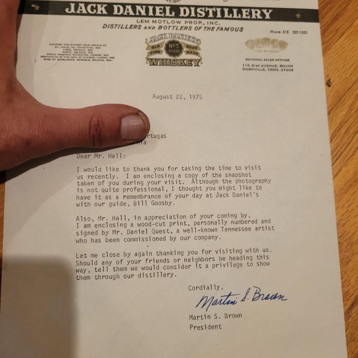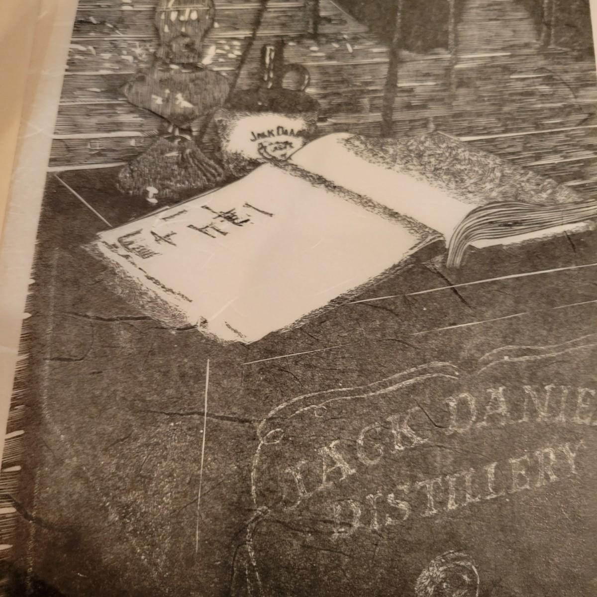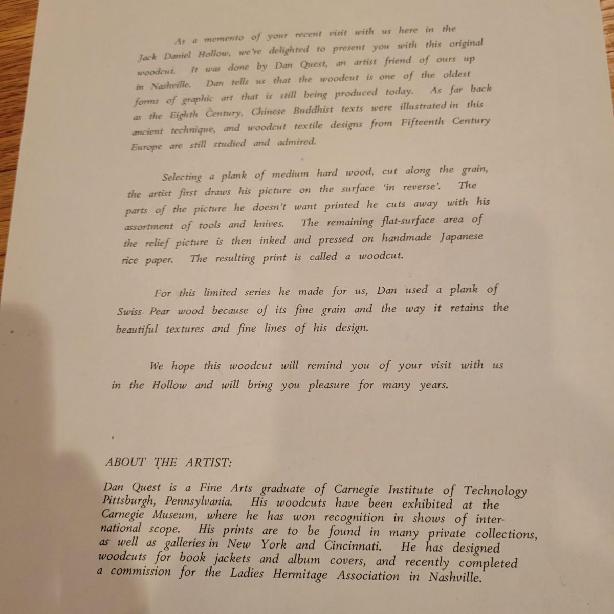 A pencil signed and numbered woodblock print by Dan Quest of Jack Daniel's old office. This piece is pressed onto a piece of handmade Japanese rice paper and is # 1388/2000. Included are two pieces of printed paper about the subject, the woodblock process and the artist. It also includes a letter from the president of Jack Daniel's to the consignee commemorating his visit. Measures approximately 11" x 14". Shipping available.