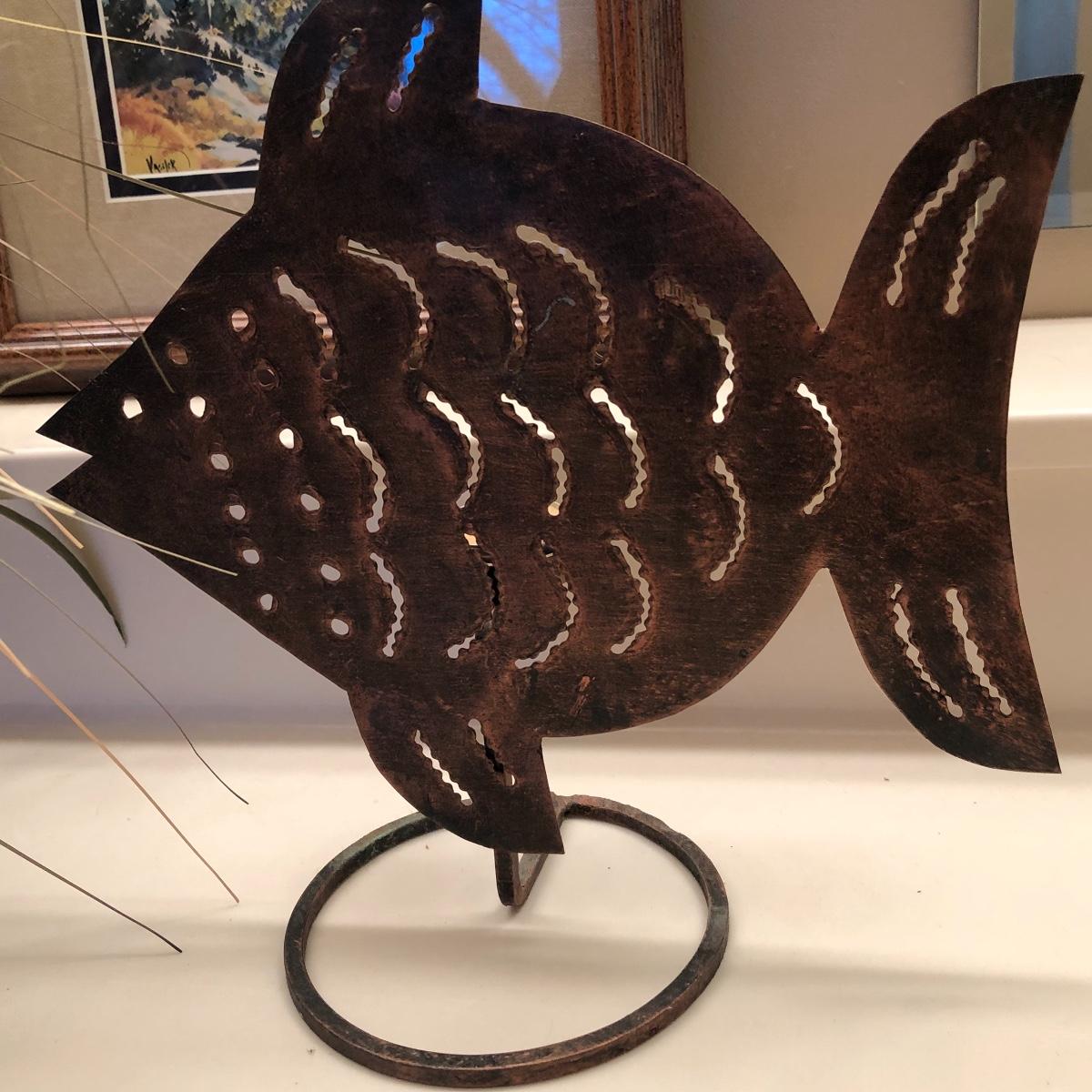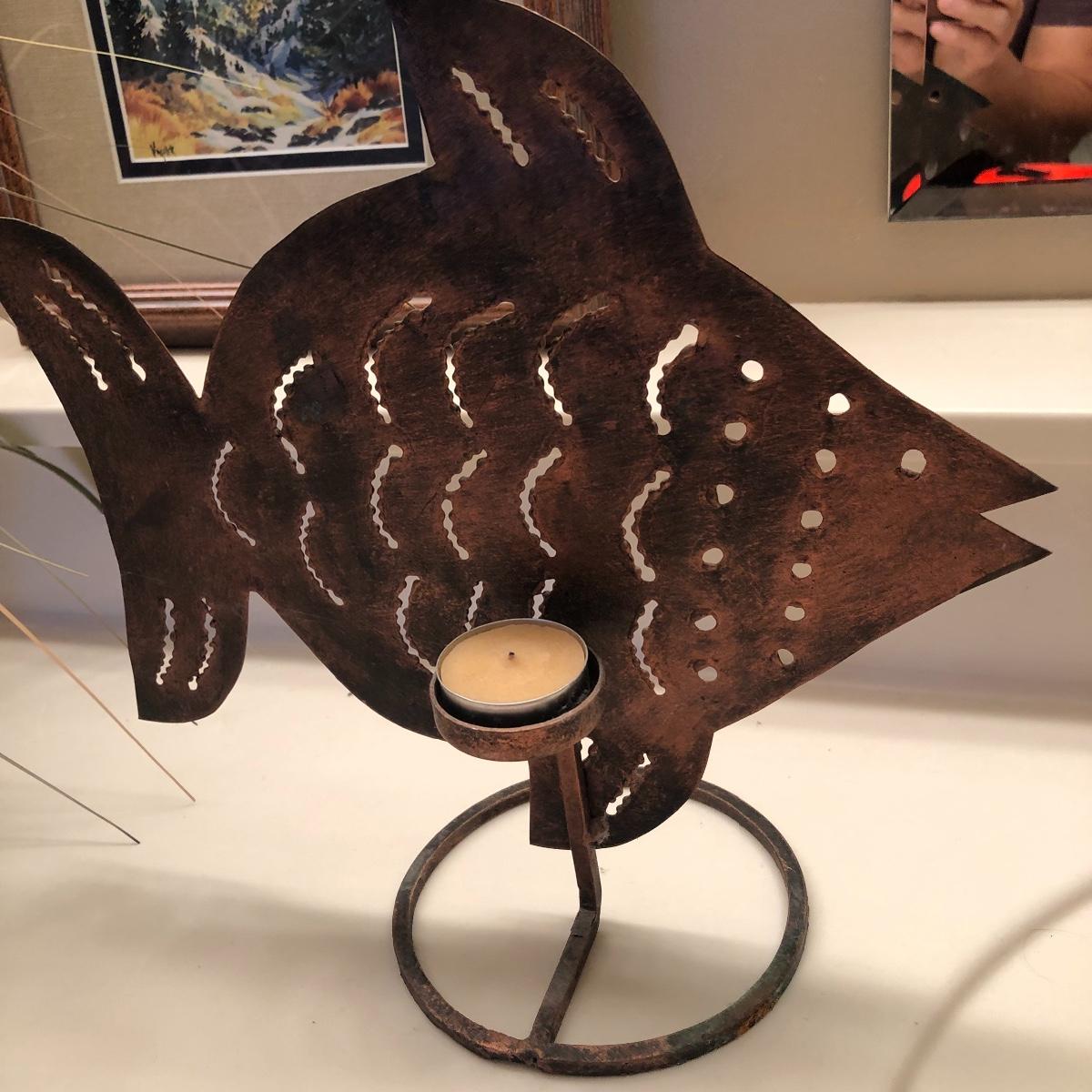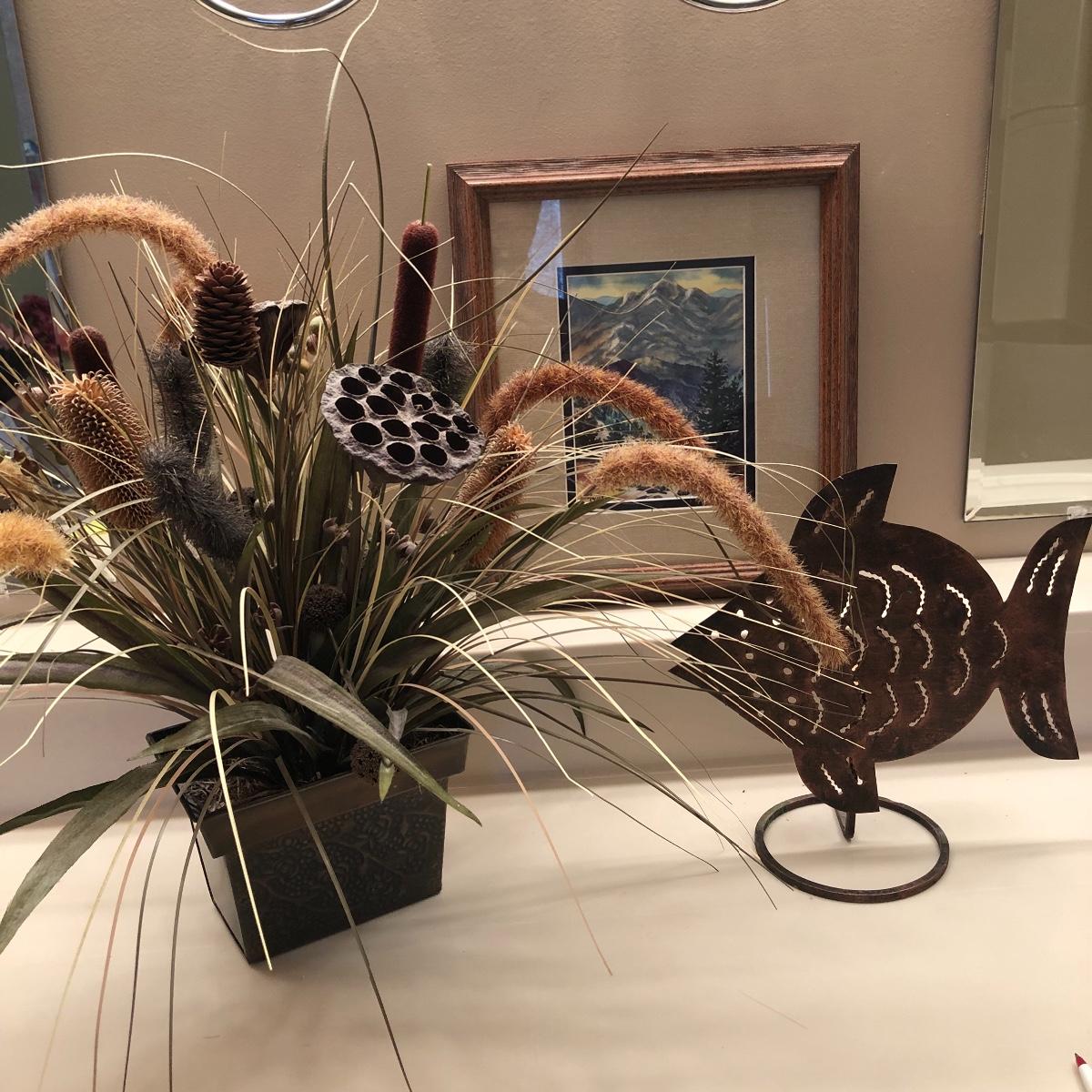 There are three items in this lot. The floral arrangement is about 22” tall with it’s base measuring 7” x 5” x 5”. The votive candle fish is 10.5” wide and is 10.5” tall. The painting is done by a local artist, Ann Vasilik. The frame measures 12” x 13.5”. The artwork measures 5” x 7”. Note how nicely the artwork is matted. Shipping Available.
