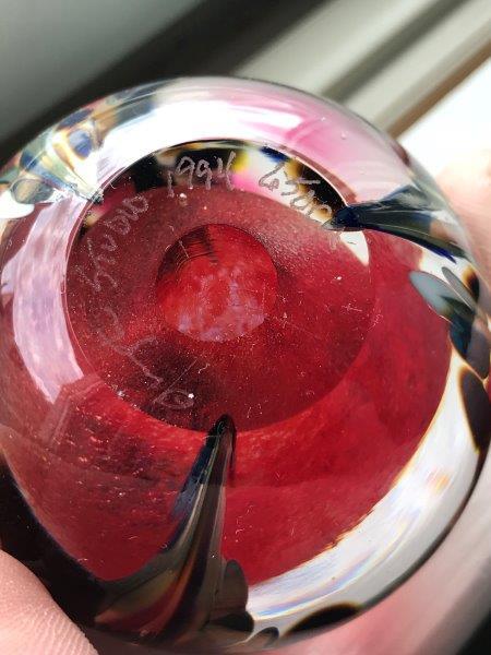 Signed, dated, and numbered on bottom. Artist name uninteligible. Dated 1994. Numbered 650CA. In shades of iridescent red and mulitcolor. 2 1/2" D