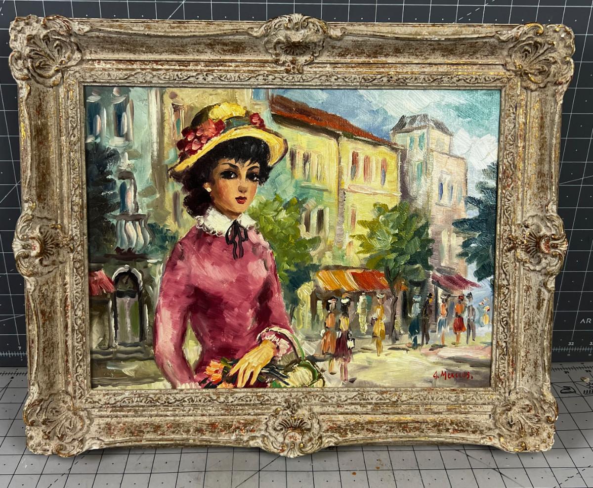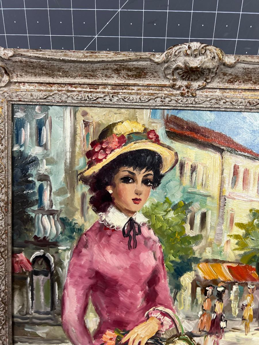 Signed Art Oil on Canvas,  Lady on the Street in the Spring