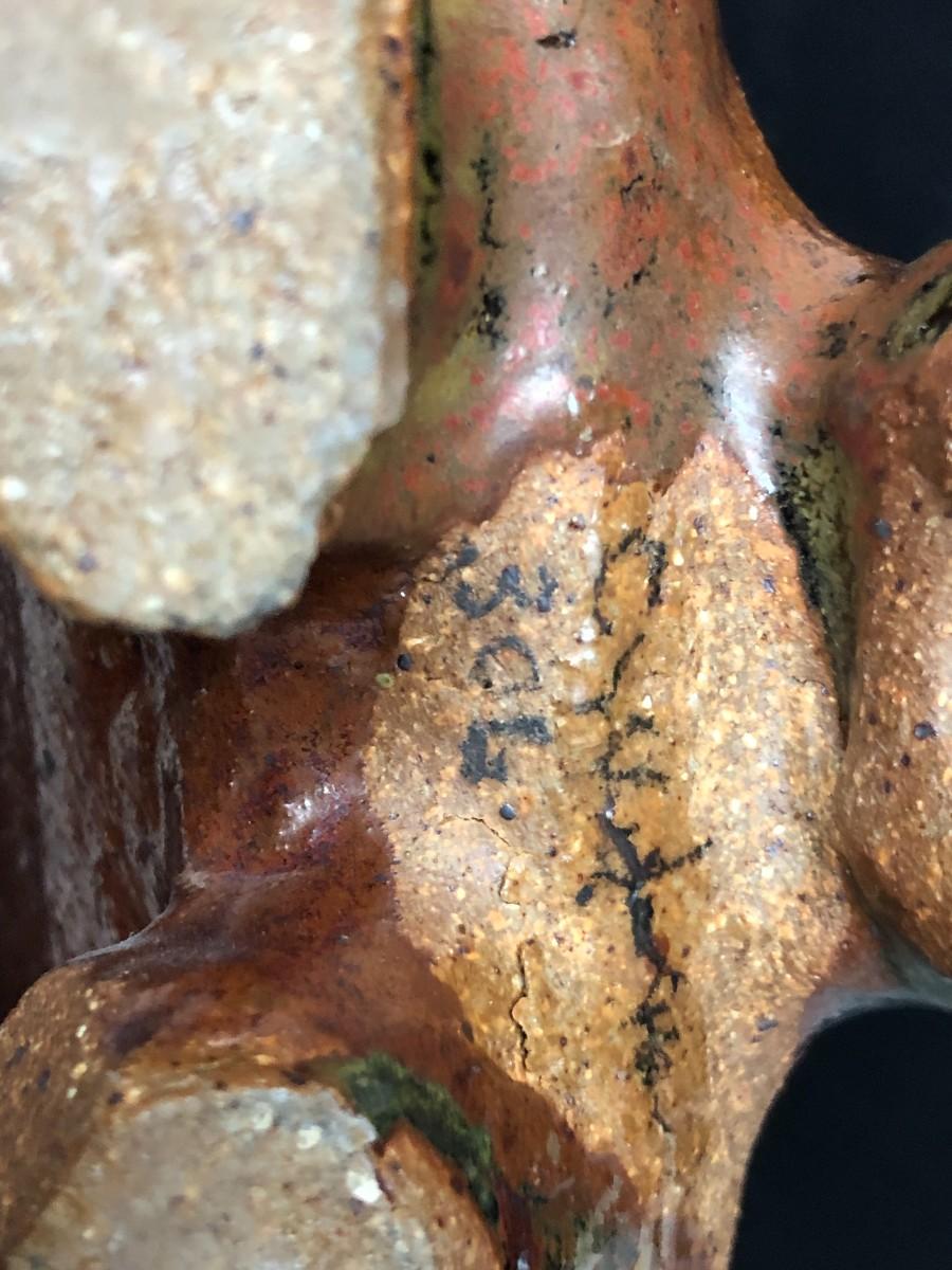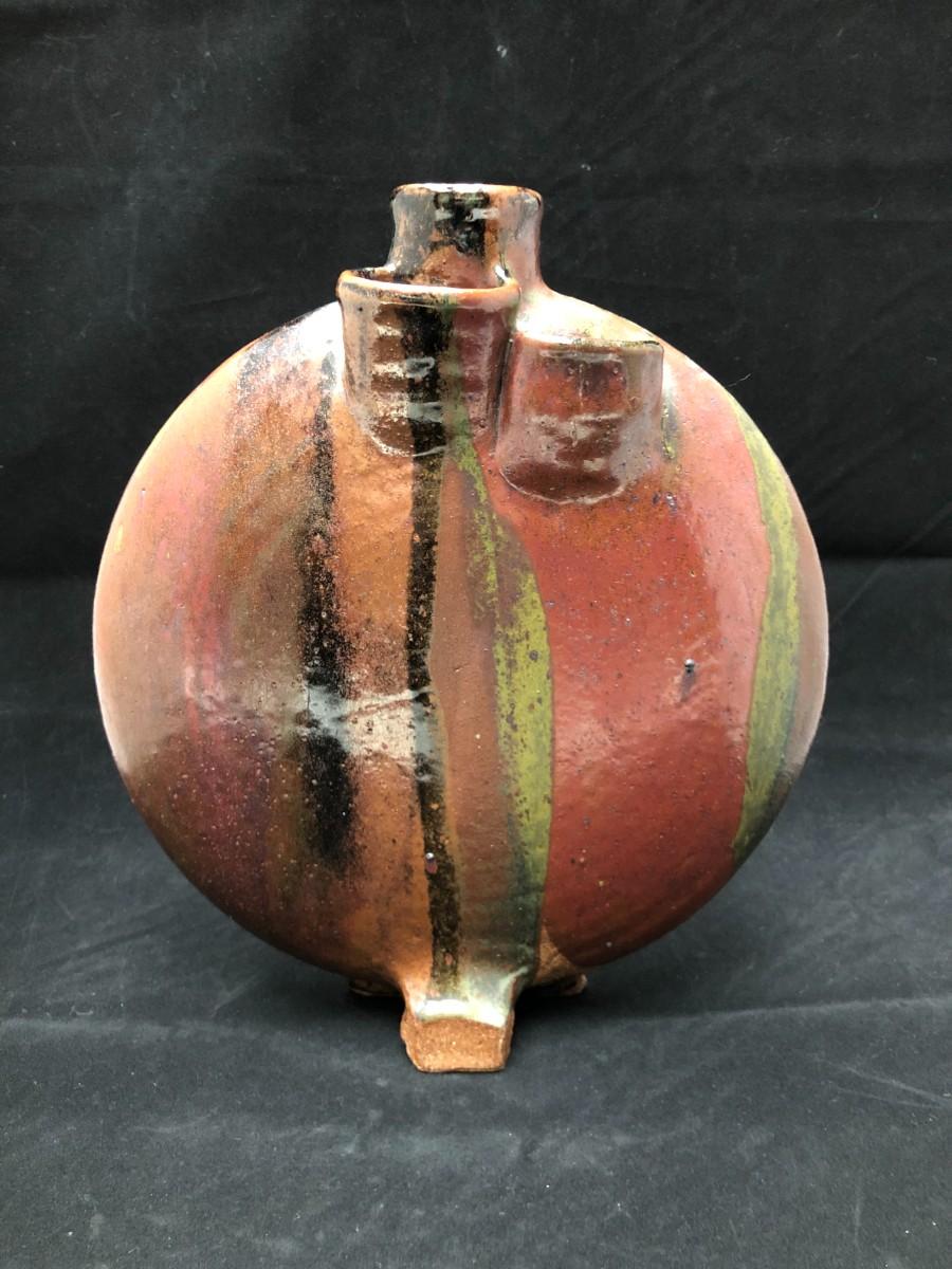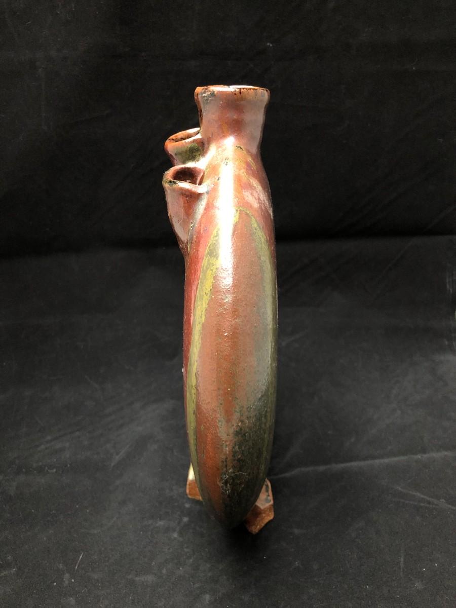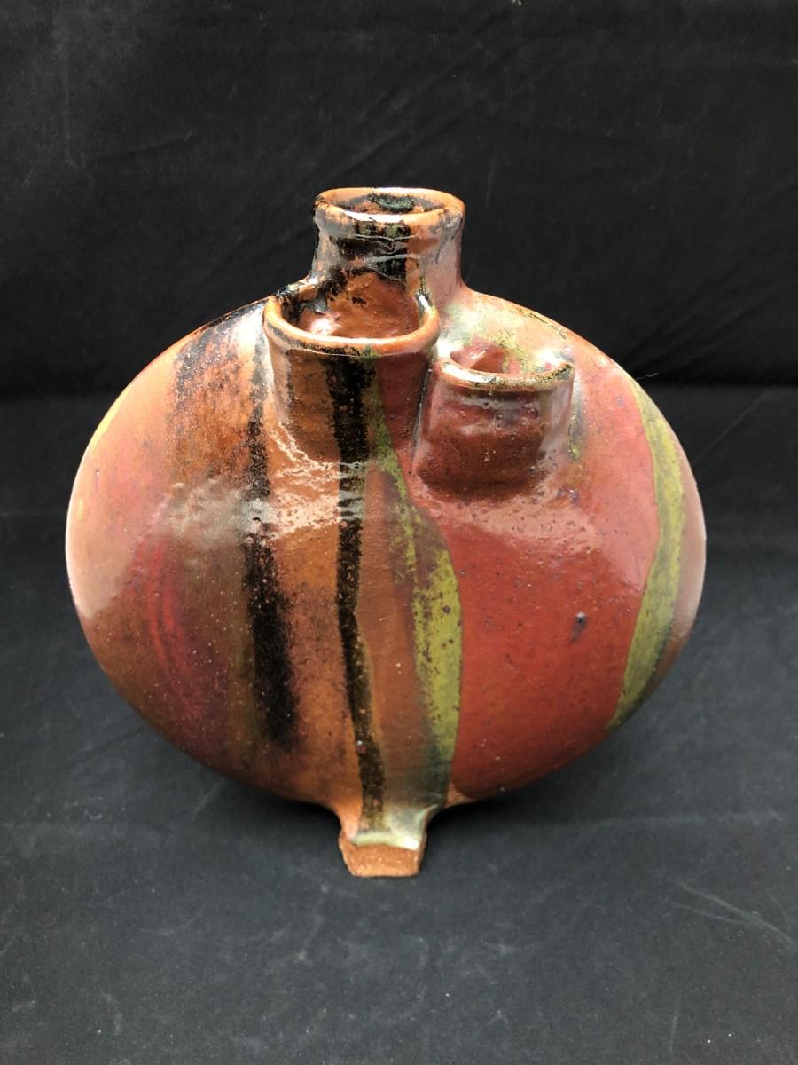 Beautiful glazed ceramic vessel, signed by the artist. Glazed with red, black, and green. In very good condition.
