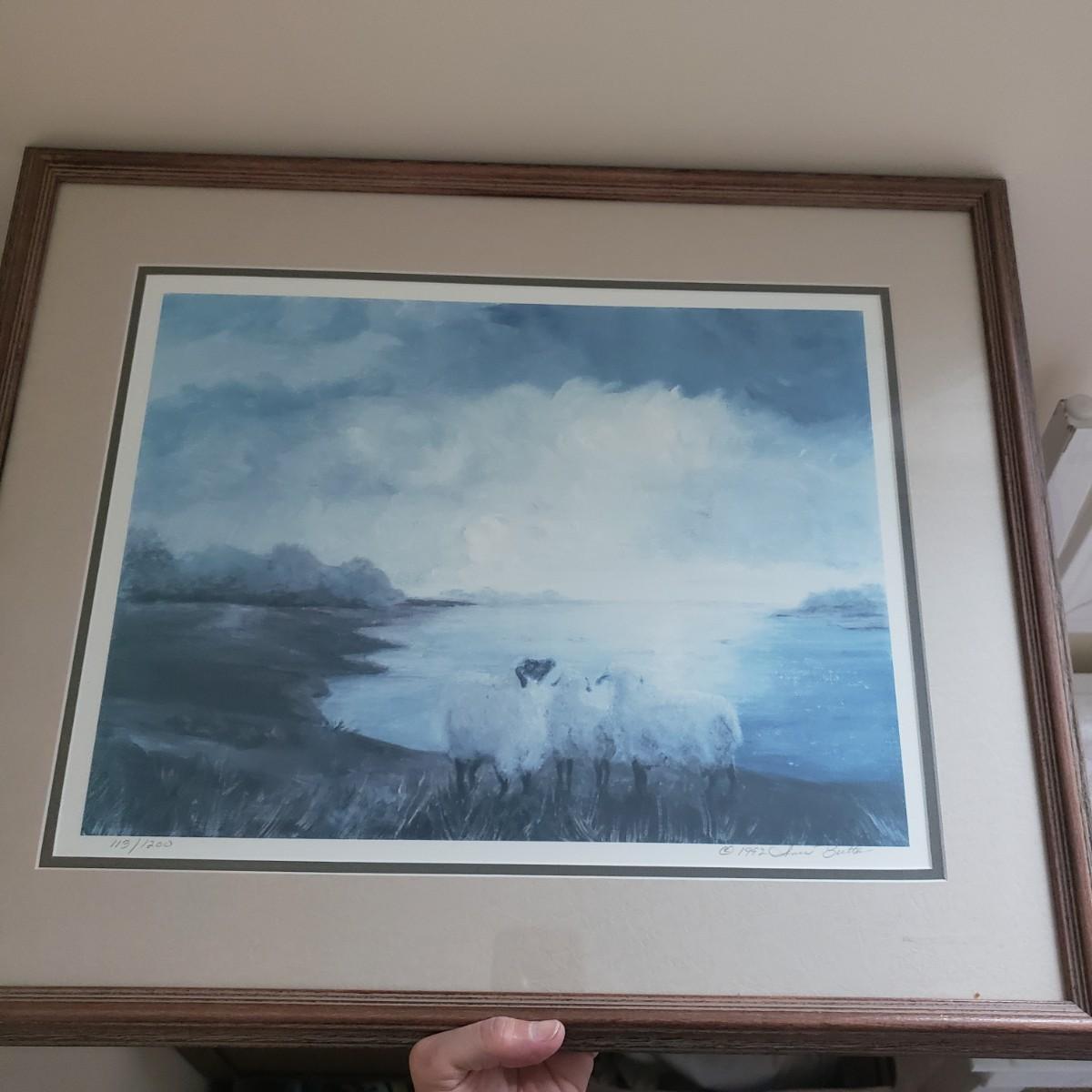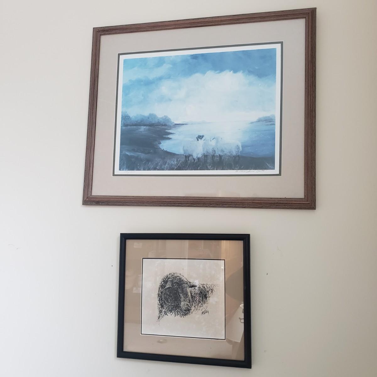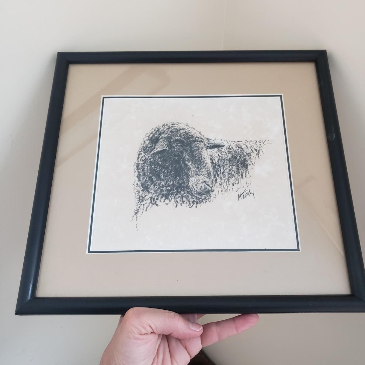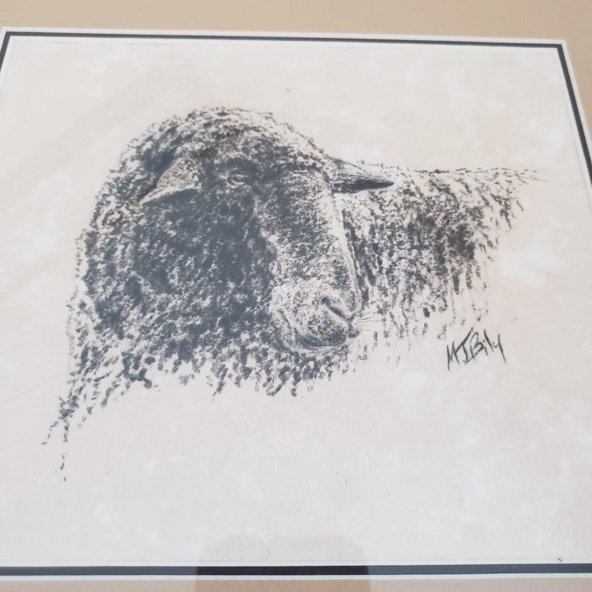 These two sheep-themed artworks are both signed by their respective artists. The smaller one in a wooden black frame in glass is by MJ Bily. The frame measures 13" x 12". The sketch appears to be on homemade paper. The larger print is by Button and is 113/1200. This print is in a wood frame behind glass and measures 23" x 19".