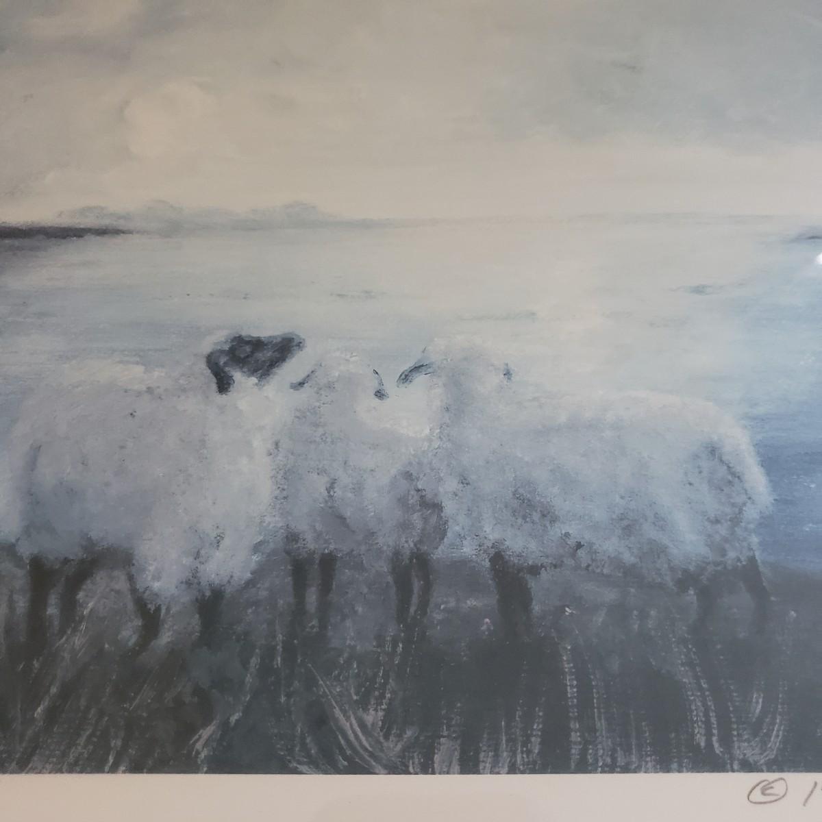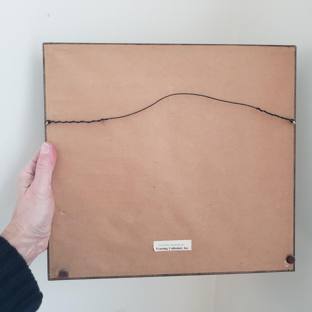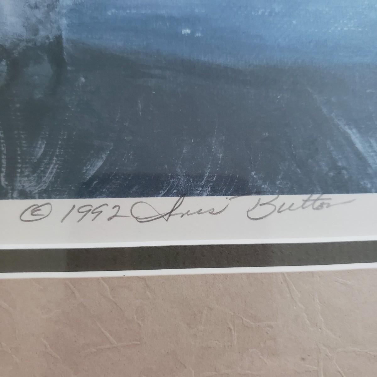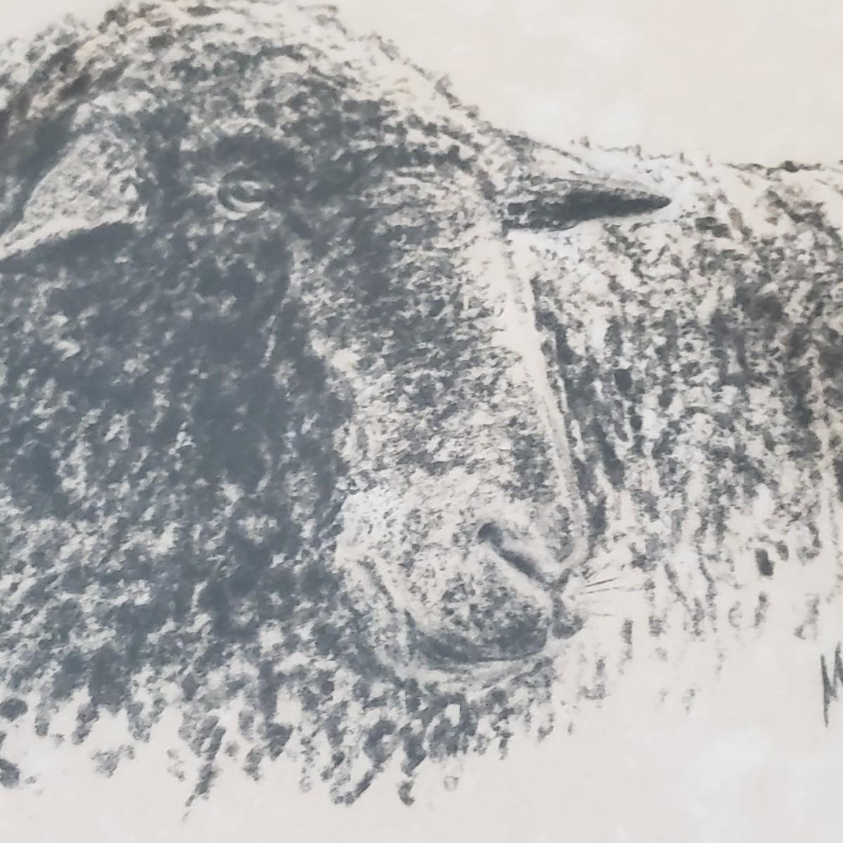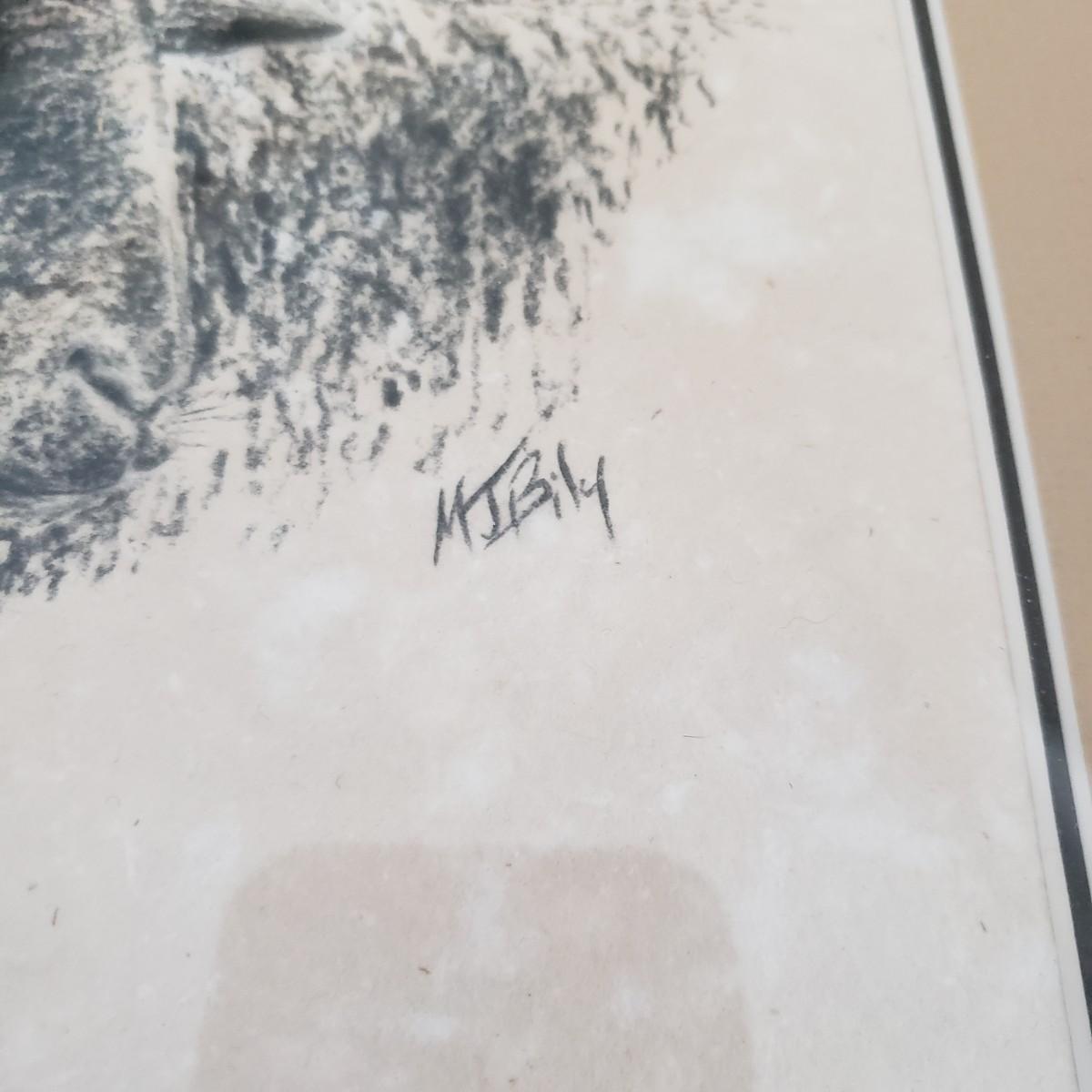 These two sheep-themed artworks are both signed by their respective artists. The smaller one in a wooden black frame in glass is by MJ Bily. The frame measures 13" x 12". The sketch appears to be on homemade paper. The larger print is by Button and is 113/1200. This print is in a wood frame behind glass and measures 23" x 19".