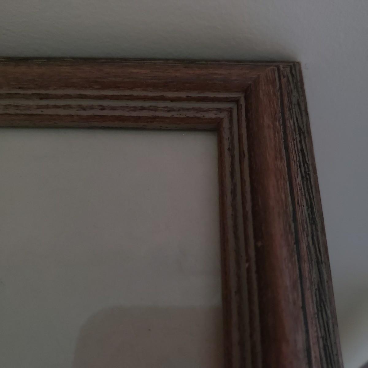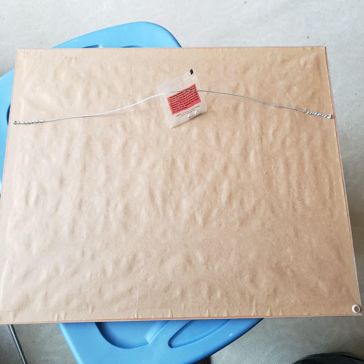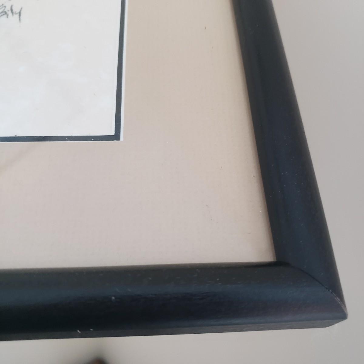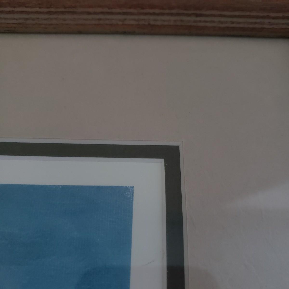 These two sheep-themed artworks are both signed by their respective artists. The smaller one in a wooden black frame in glass is by MJ Bily. The frame measures 13" x 12". The sketch appears to be on homemade paper. The larger print is by Button and is 113/1200. This print is in a wood frame behind glass and measures 23" x 19".