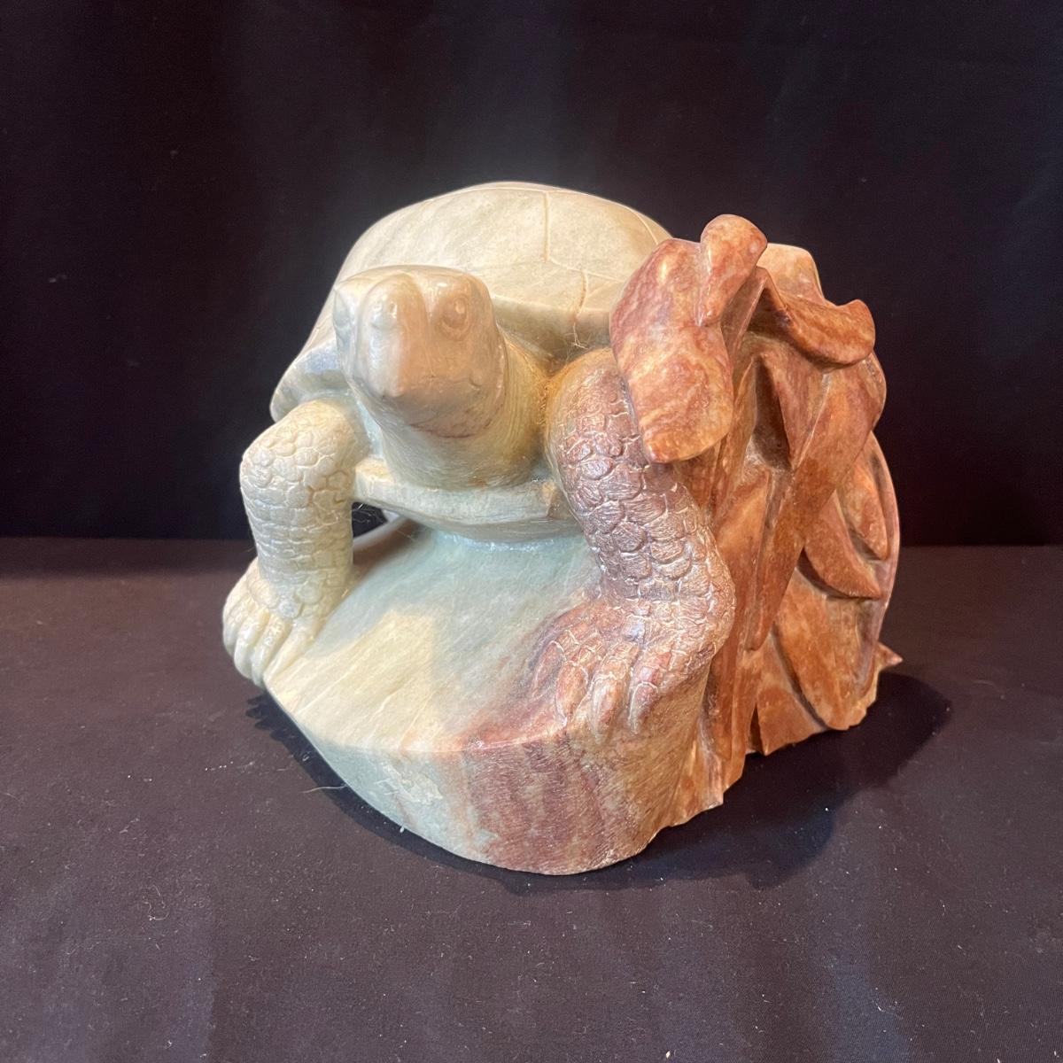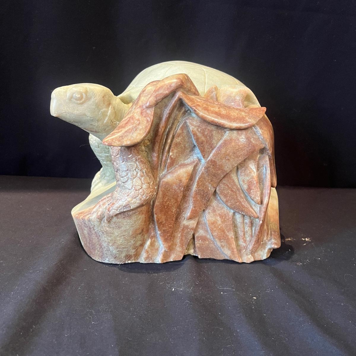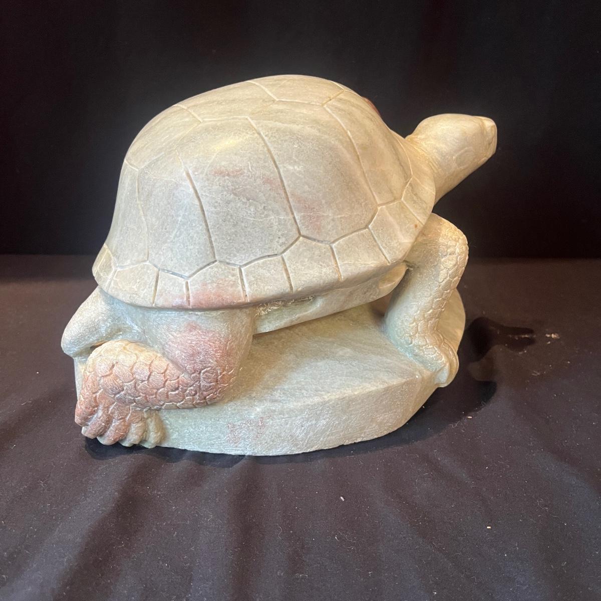 This stone turtle is carved and signed and measures 11” x 8” x 7”H. Piece is heavy.