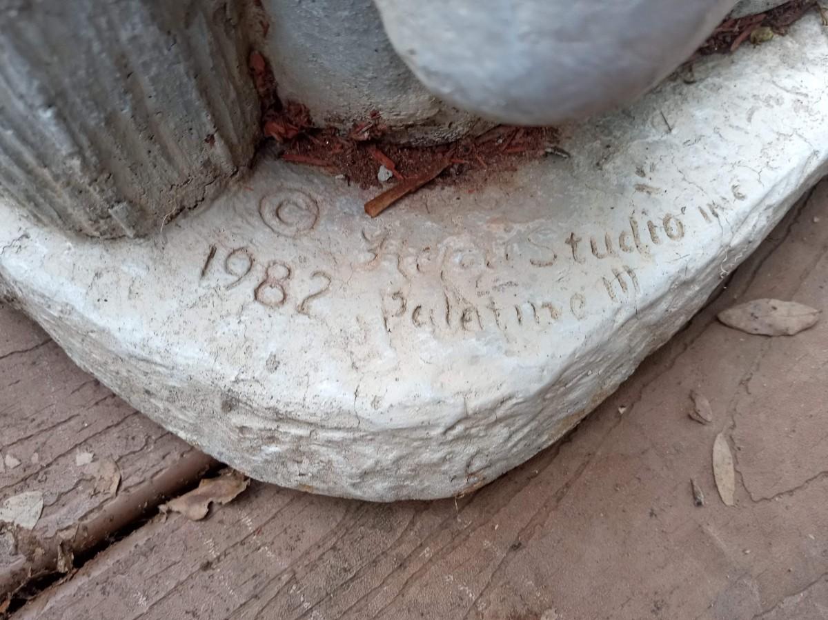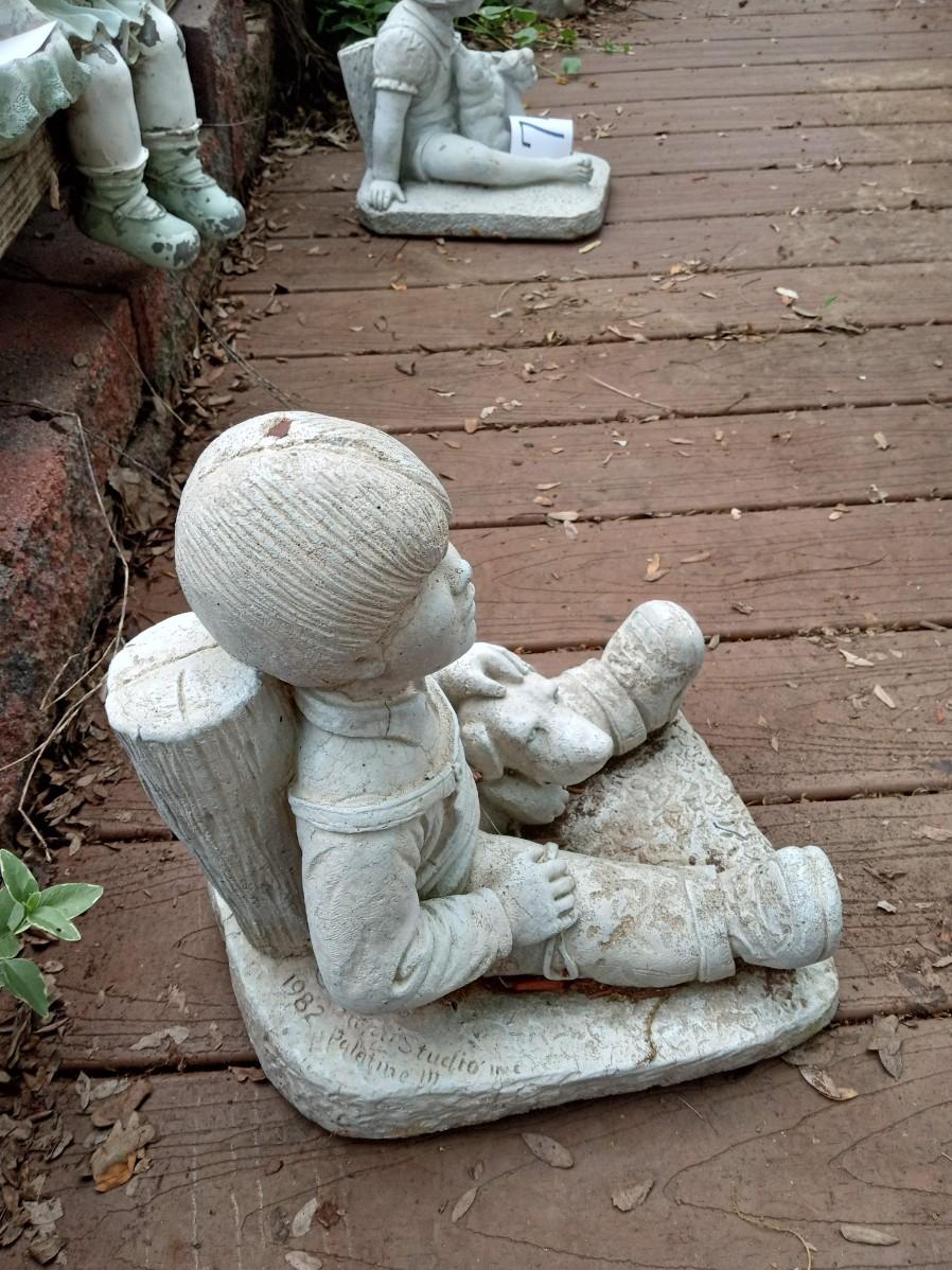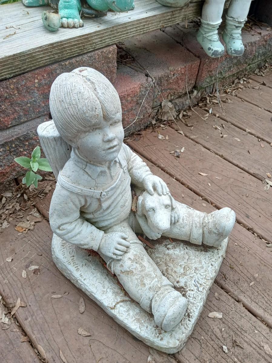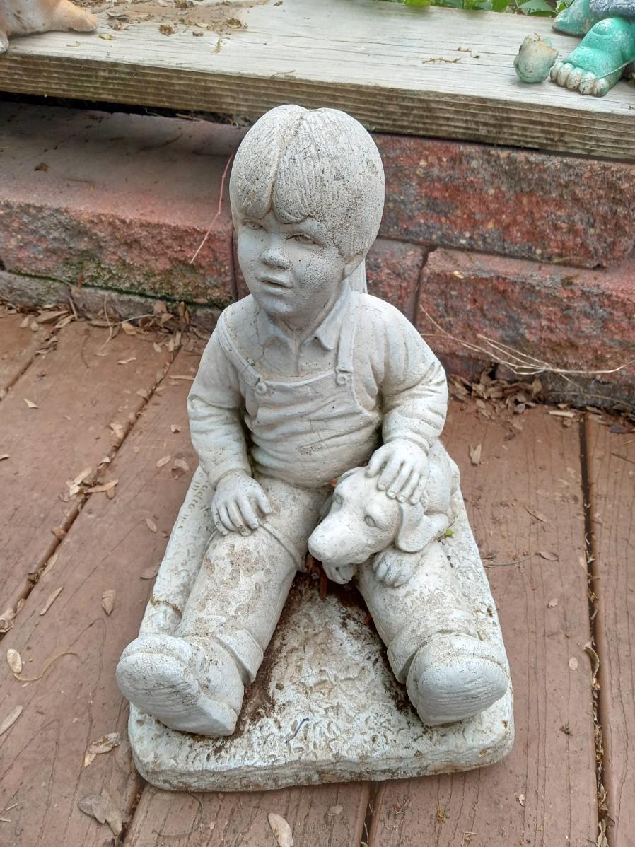 SIGNED CEMENT BOY WITH A DOG YARD ART