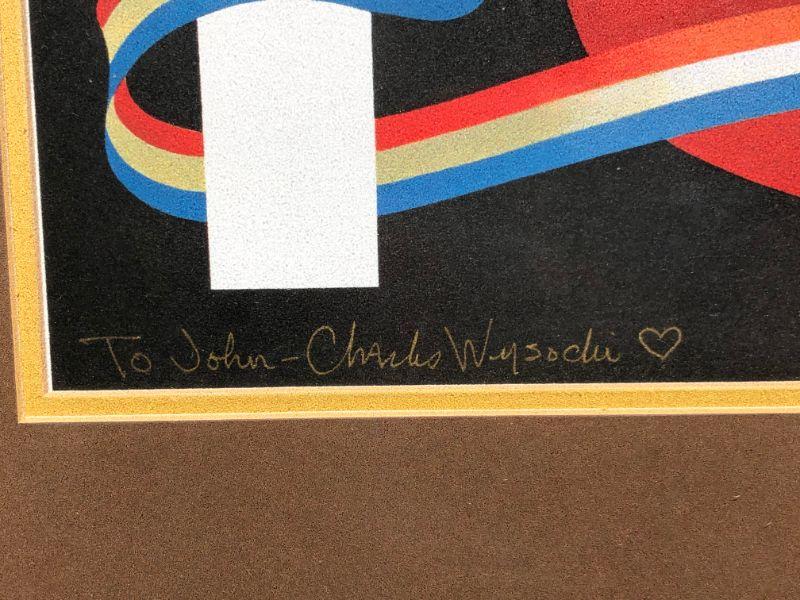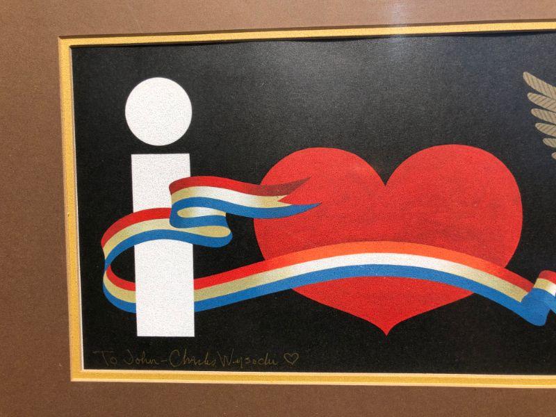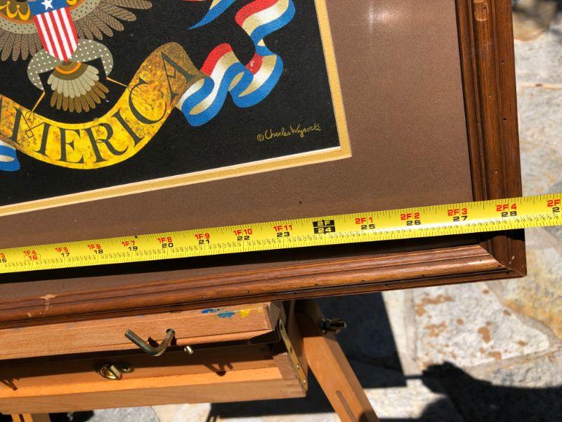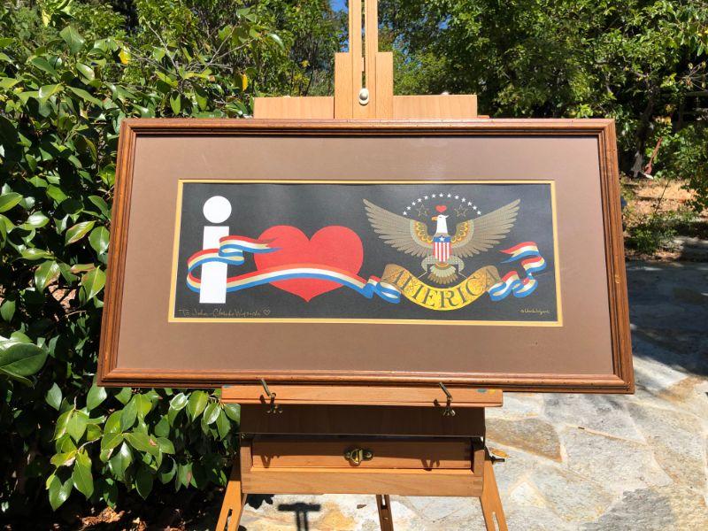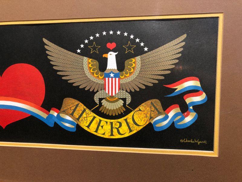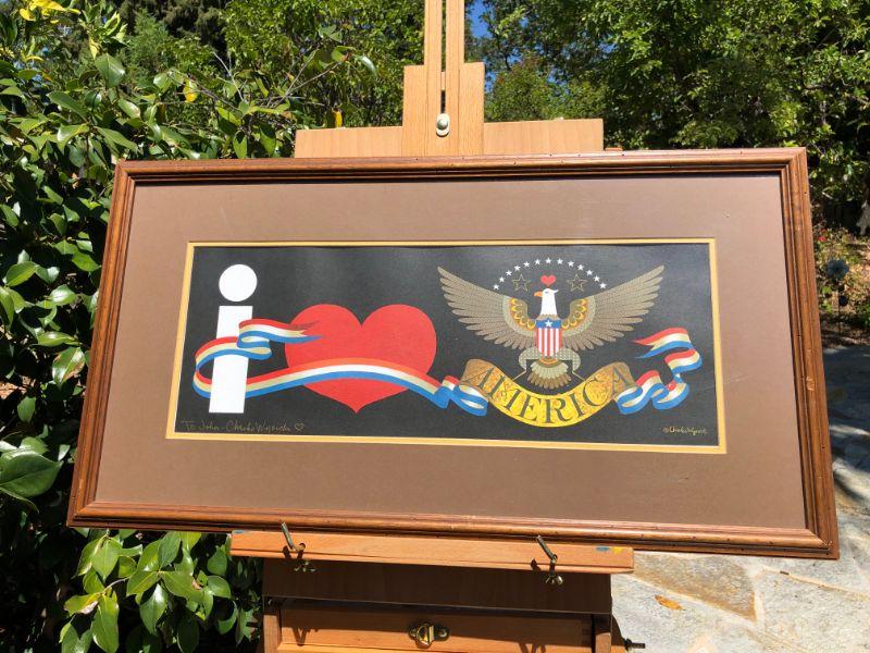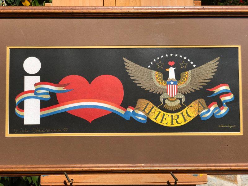 A very patriotic piece of art! A signed Charles Wysocki original lithograph. Signature includes a note to "John". Painting depicts, I Love America, and also the bald eagle. In very good condition, quality framing.