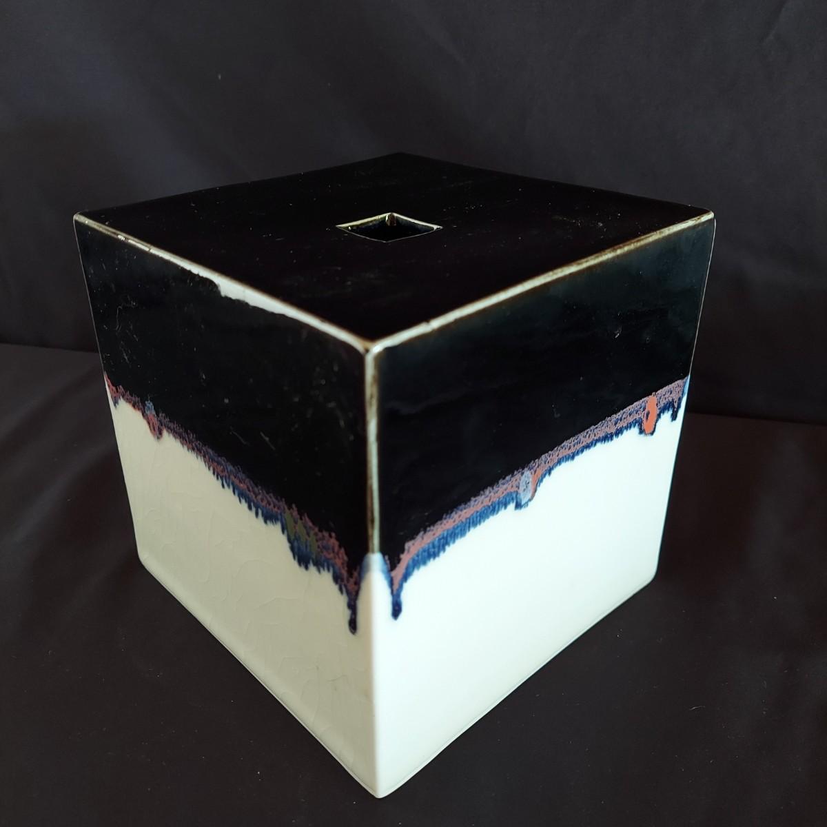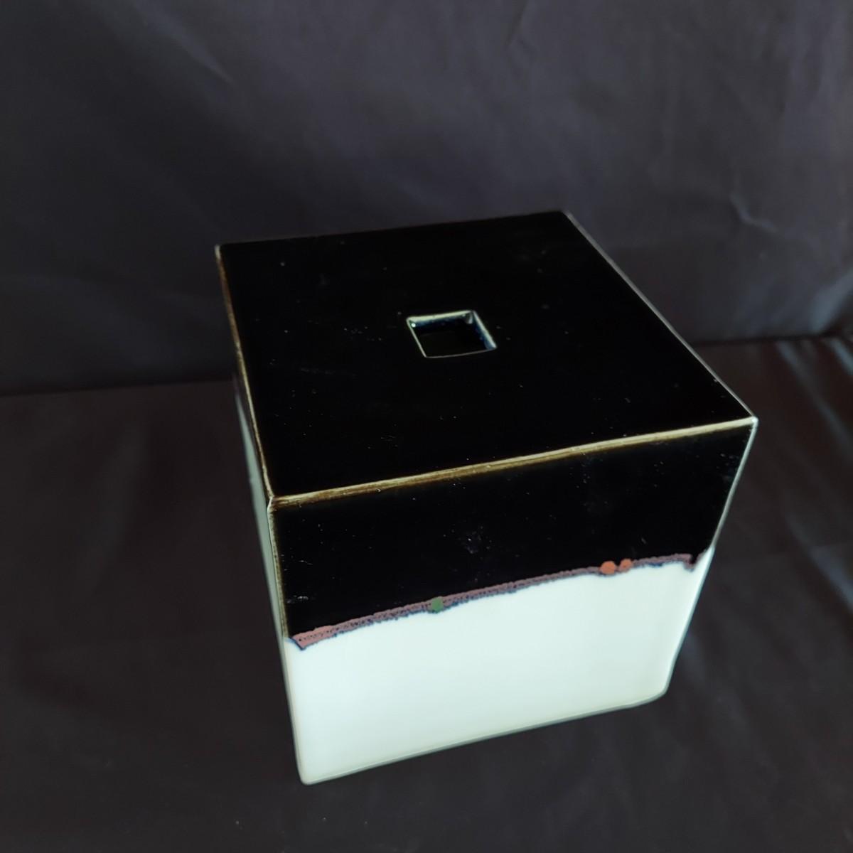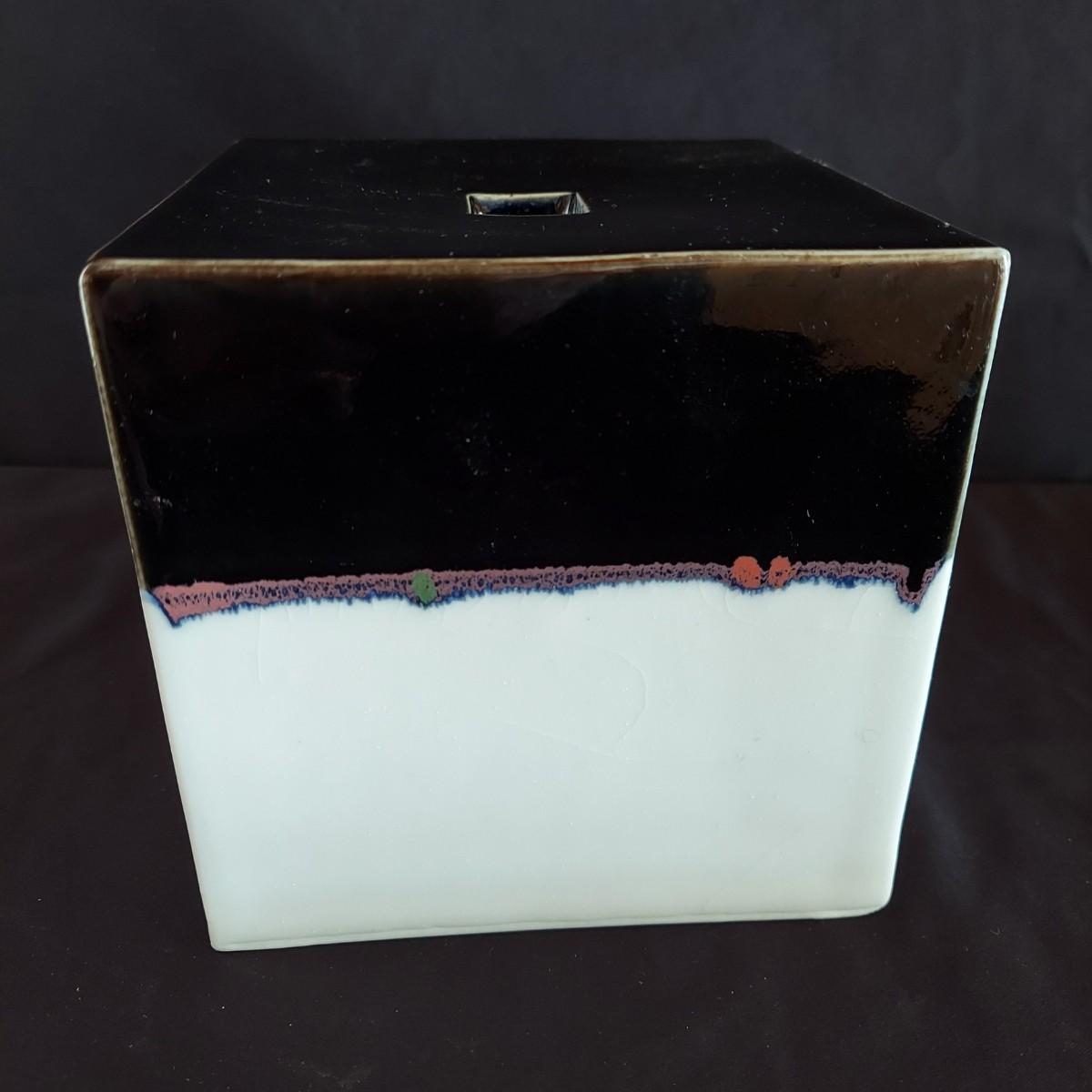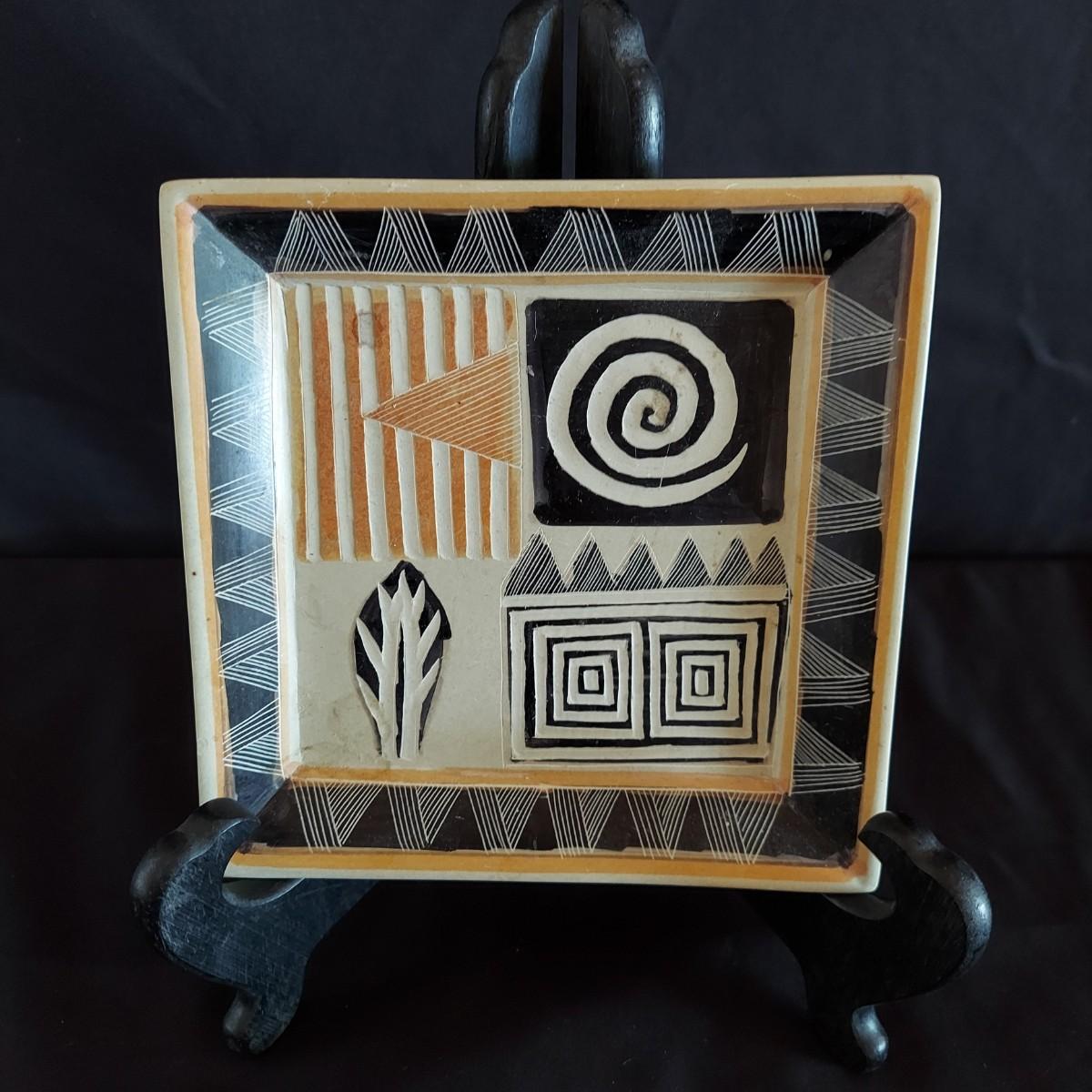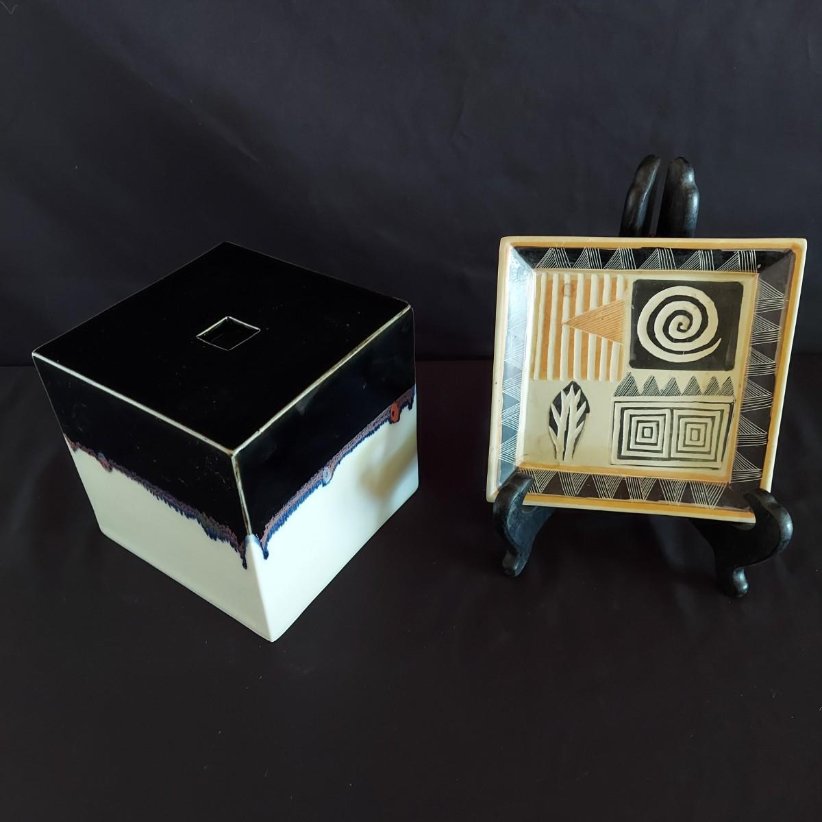 Signed cube vase and ceramic tray. Vase has black and white glaze. Measures approximately 5.25" cubed. The carved stoneware tray measures 5.5" x 5.5". Shipping available.