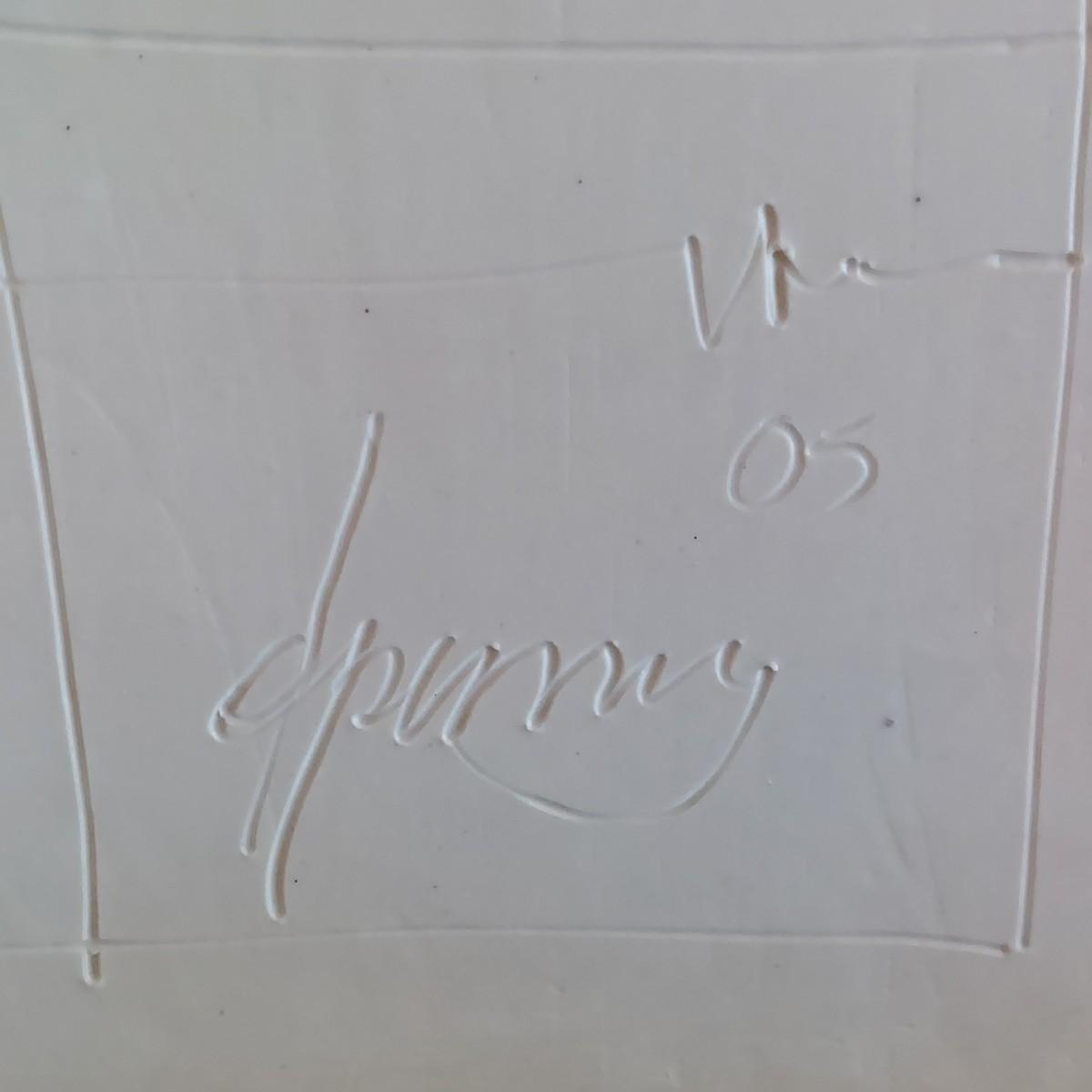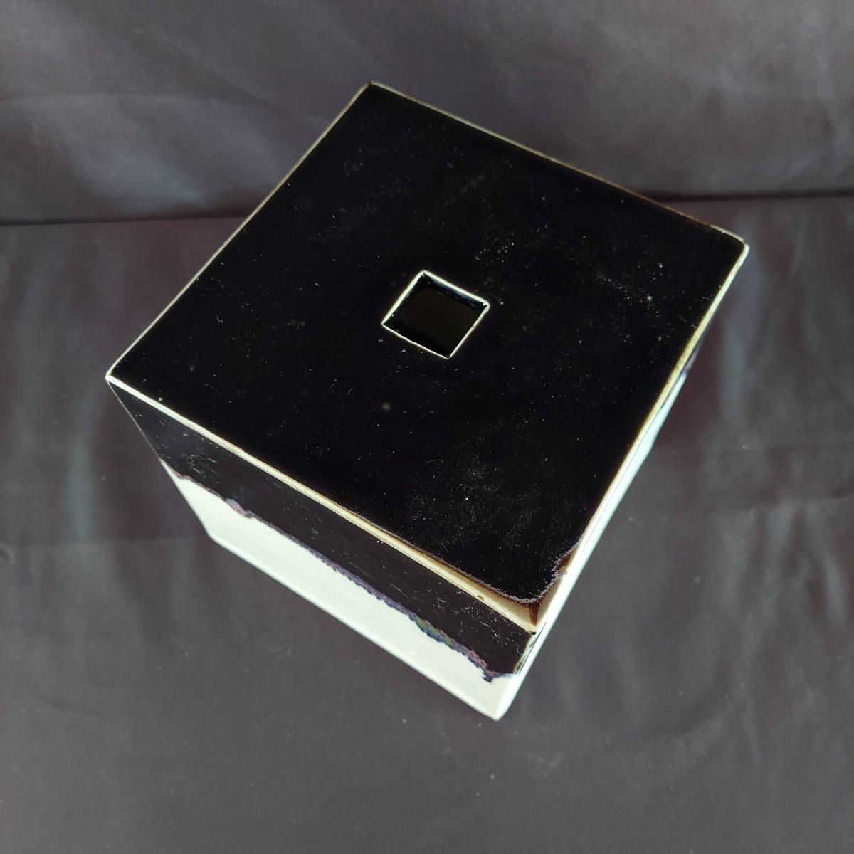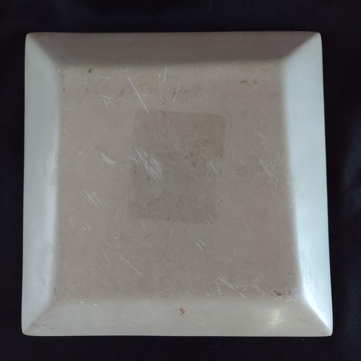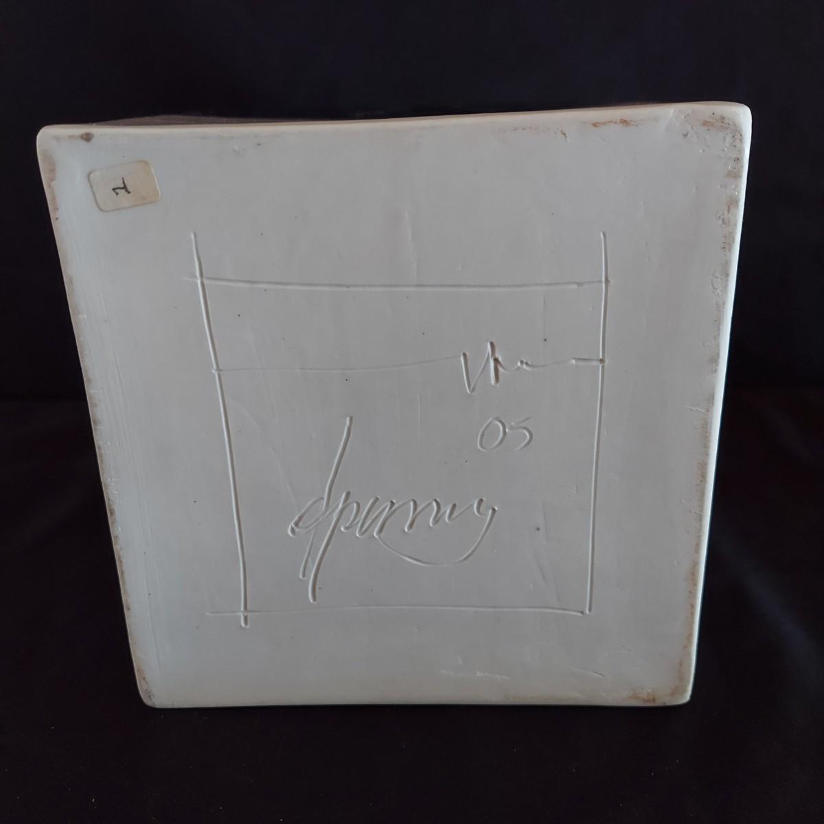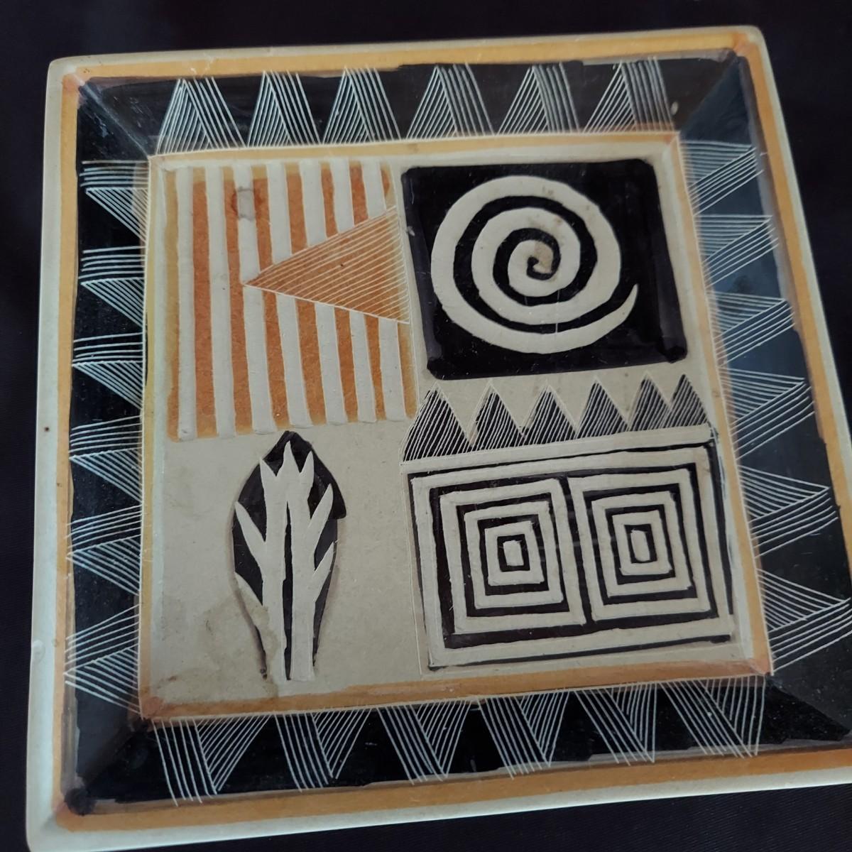 Signed cube vase and ceramic tray. Vase has black and white glaze. Measures approximately 5.25" cubed. The carved stoneware tray measures 5.5" x 5.5". Shipping available.