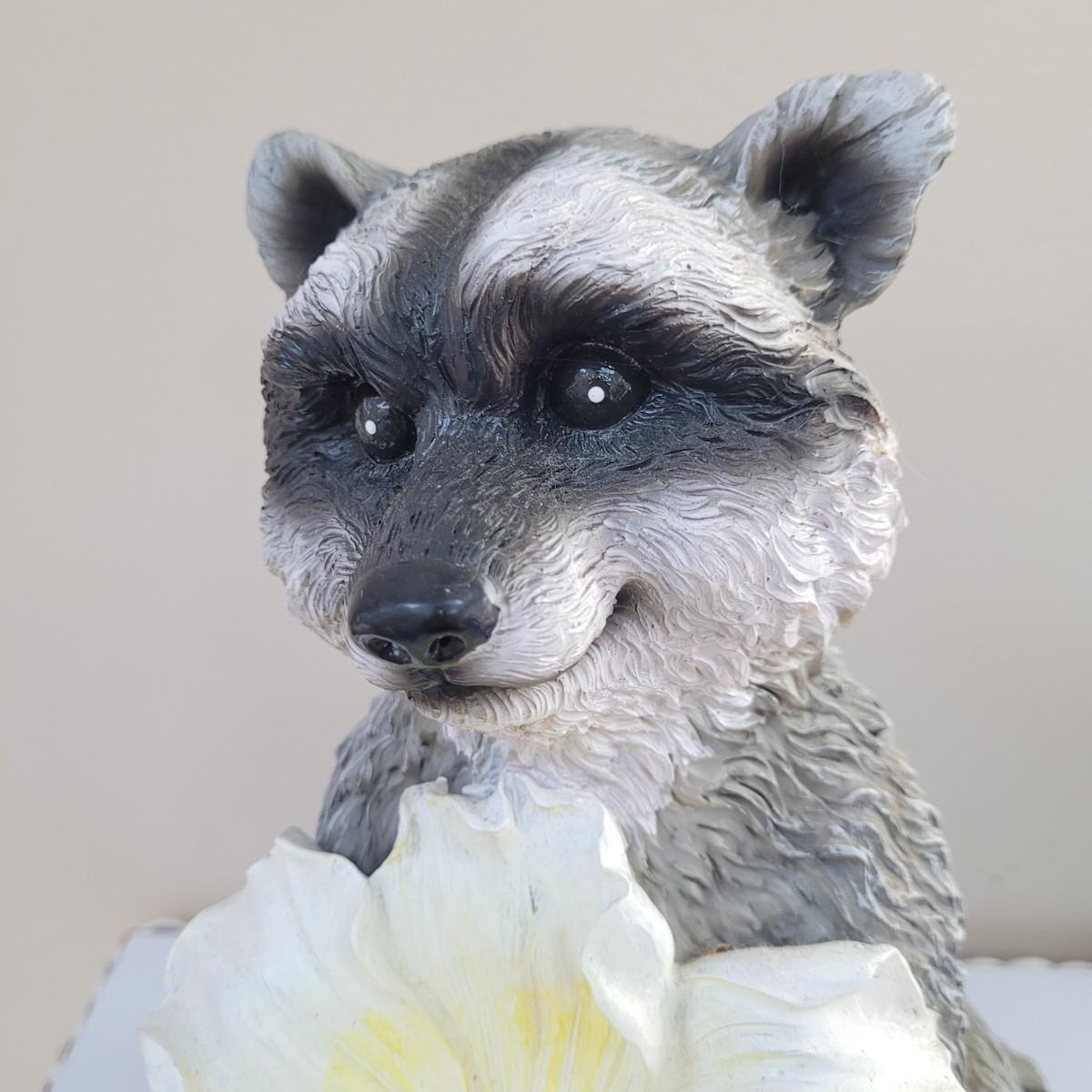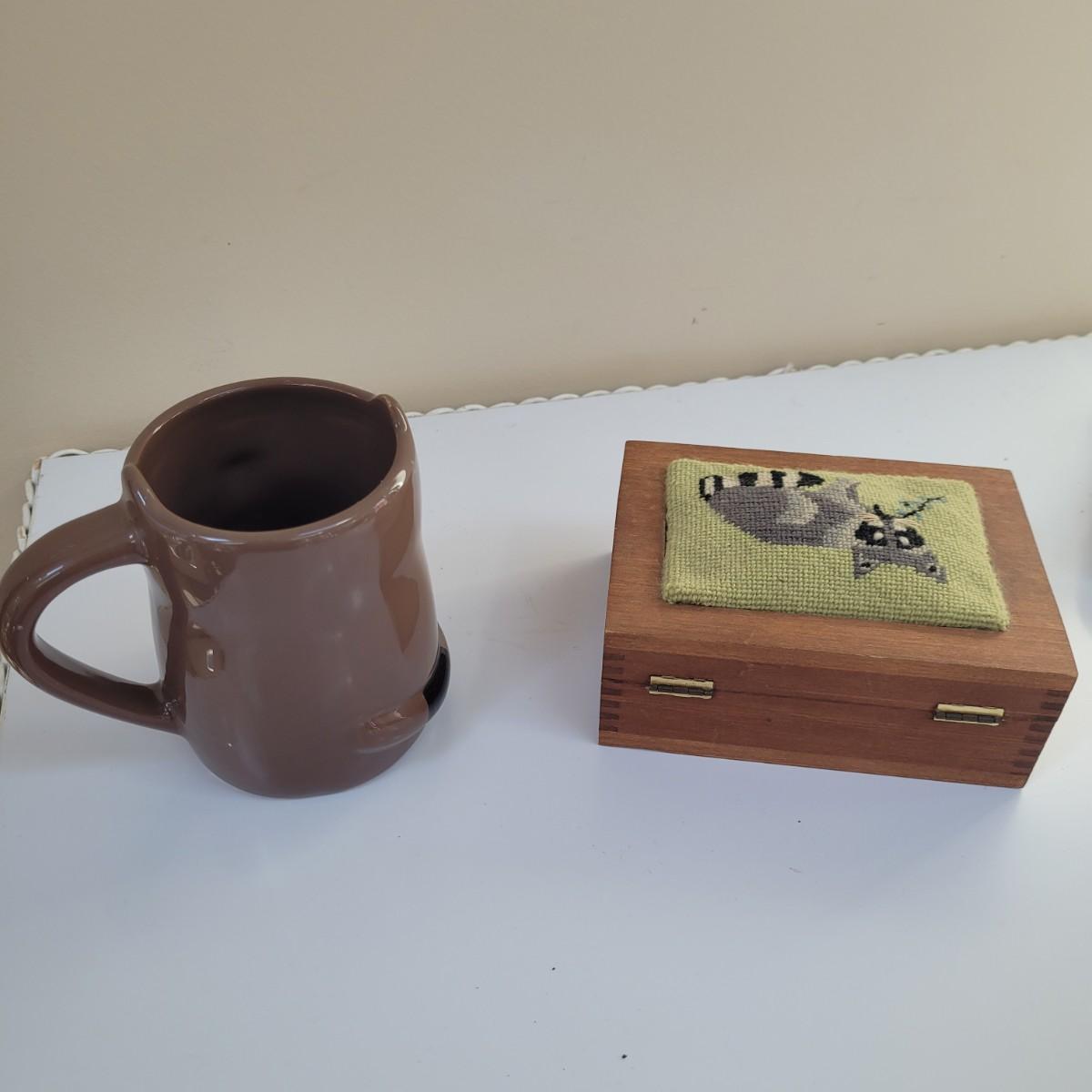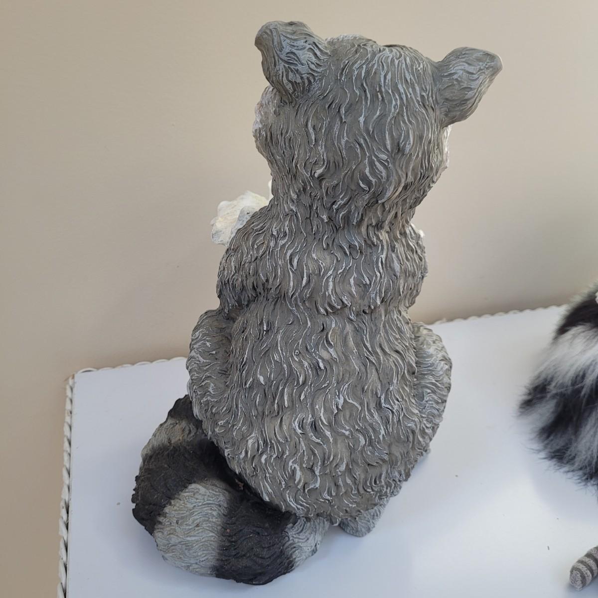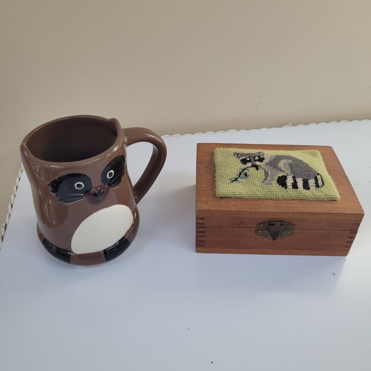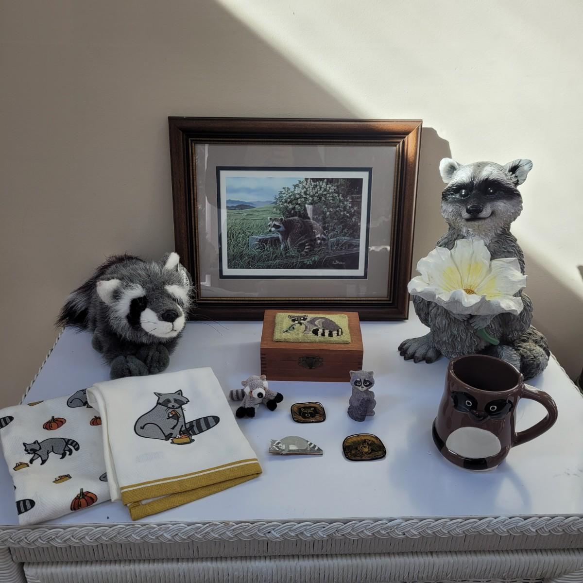Raccoon enthusiasts will love this adorable assortment of items, including a signed, double matted and framed watercolor print by Don Balke. Glass cover and wood frame with certificate attached to back. Other items include a garden statue, stuffed animal, linens, mug, needlepoint covered small wooden box and small figurines and pins. Linens have some stains (see photos), statue appears to clean easily. Framed art measures approximately 15"L x13"H. Shipping available. Shipping can be costly. We suggest calling our local UPS with dimensions and getting an estimate before bidding: (828) 252-6930.