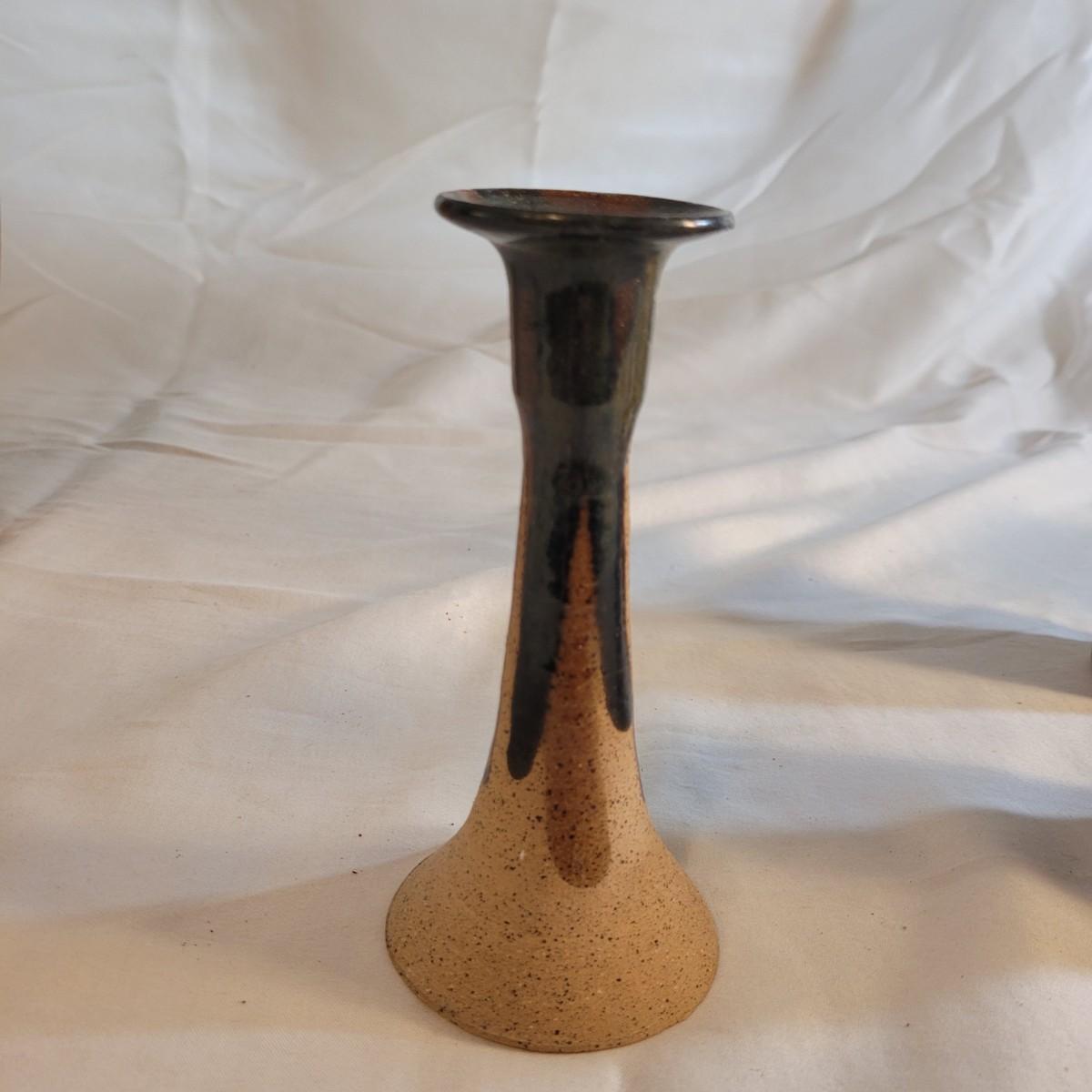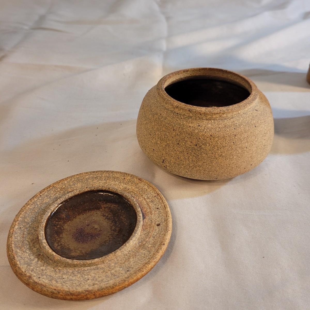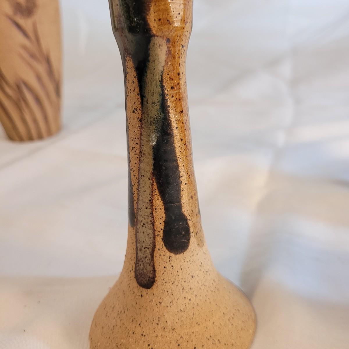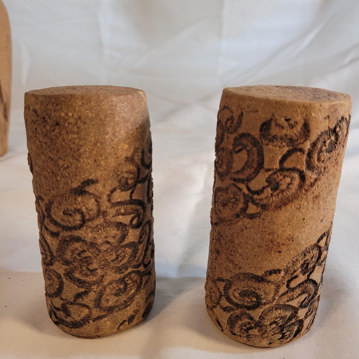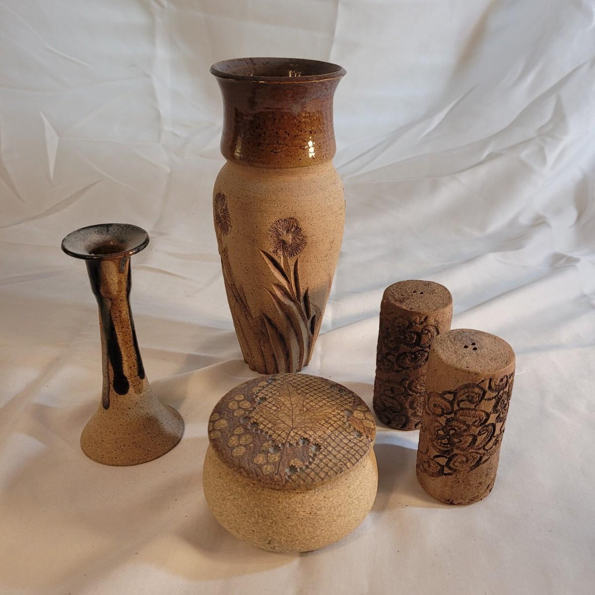 Beautiful, unique earthenware collection including a signed lidded bowl, floral vase, salt and pepper shakers and a small candlestick holder. Vase measures approximately 4"W at opening x10"H. Shipping available.