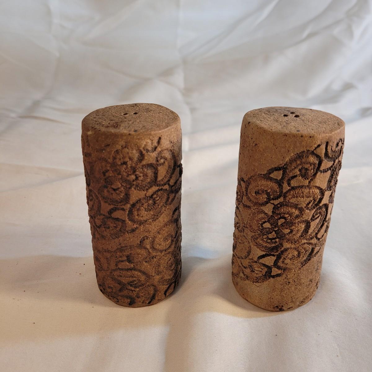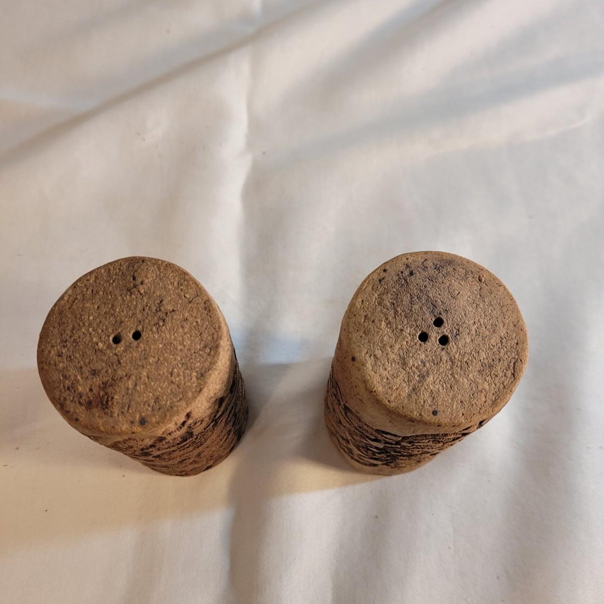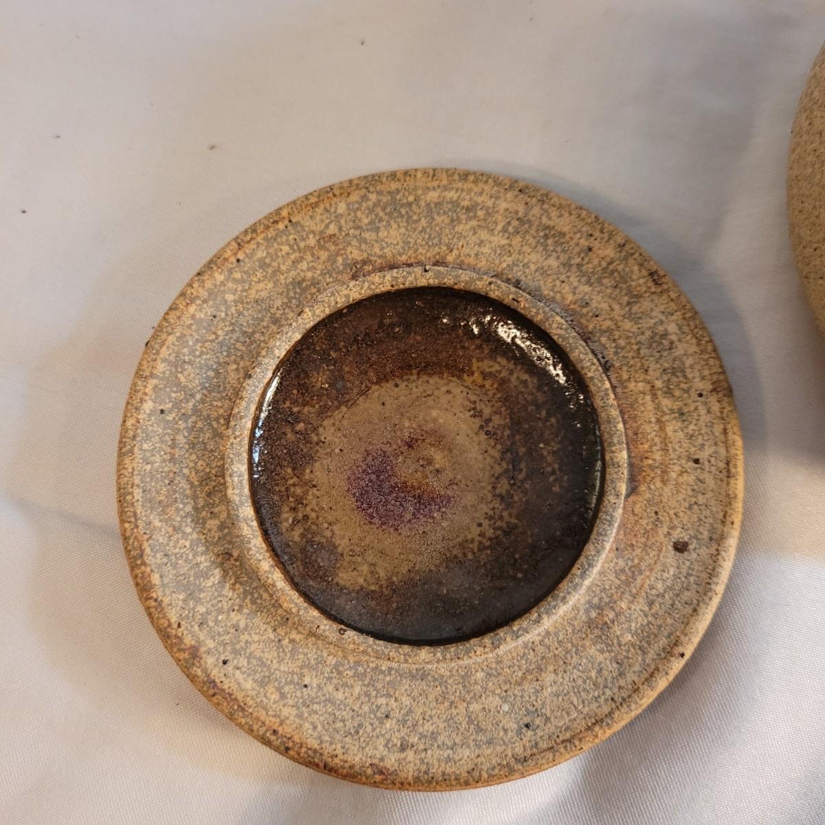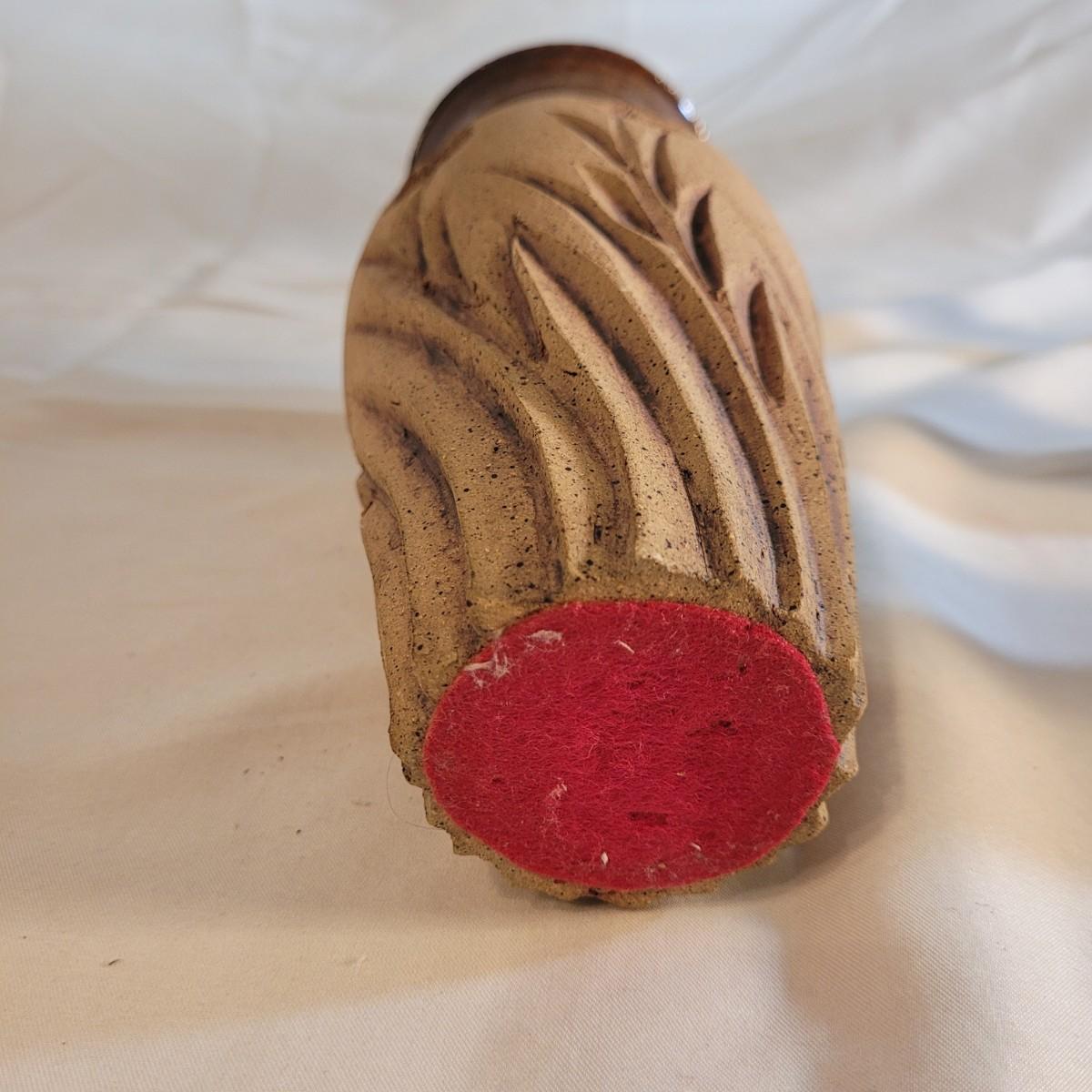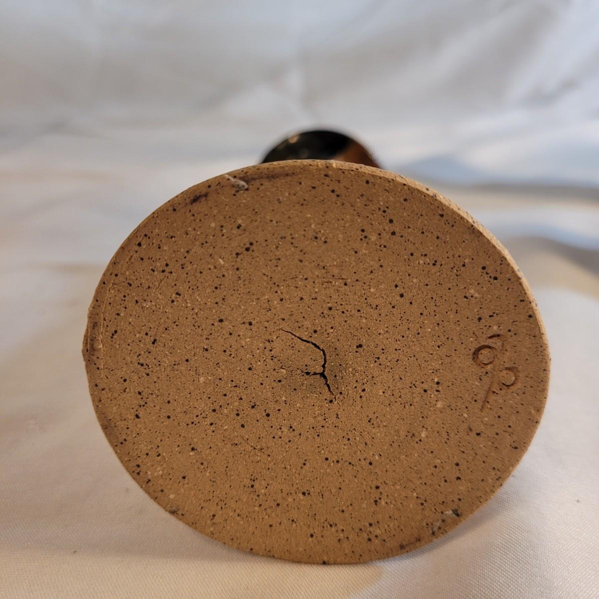 Beautiful, unique earthenware collection including a signed lidded bowl, floral vase, salt and pepper shakers and a small candlestick holder. Vase measures approximately 4"W at opening x10"H. Shipping available.
