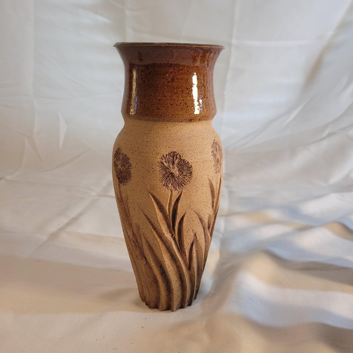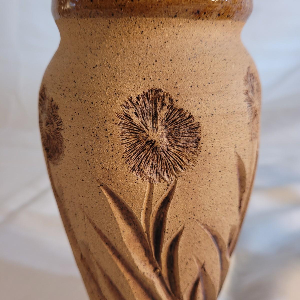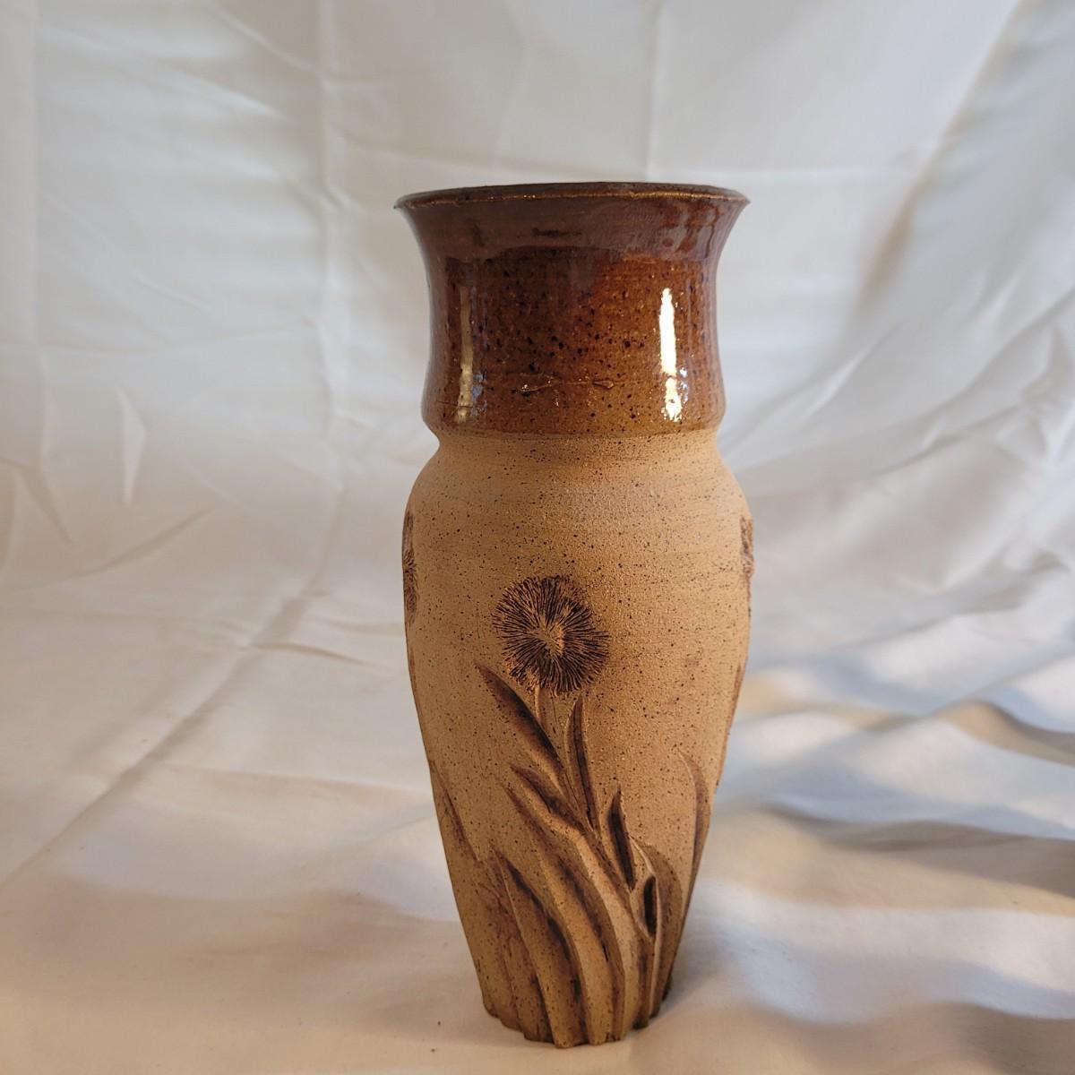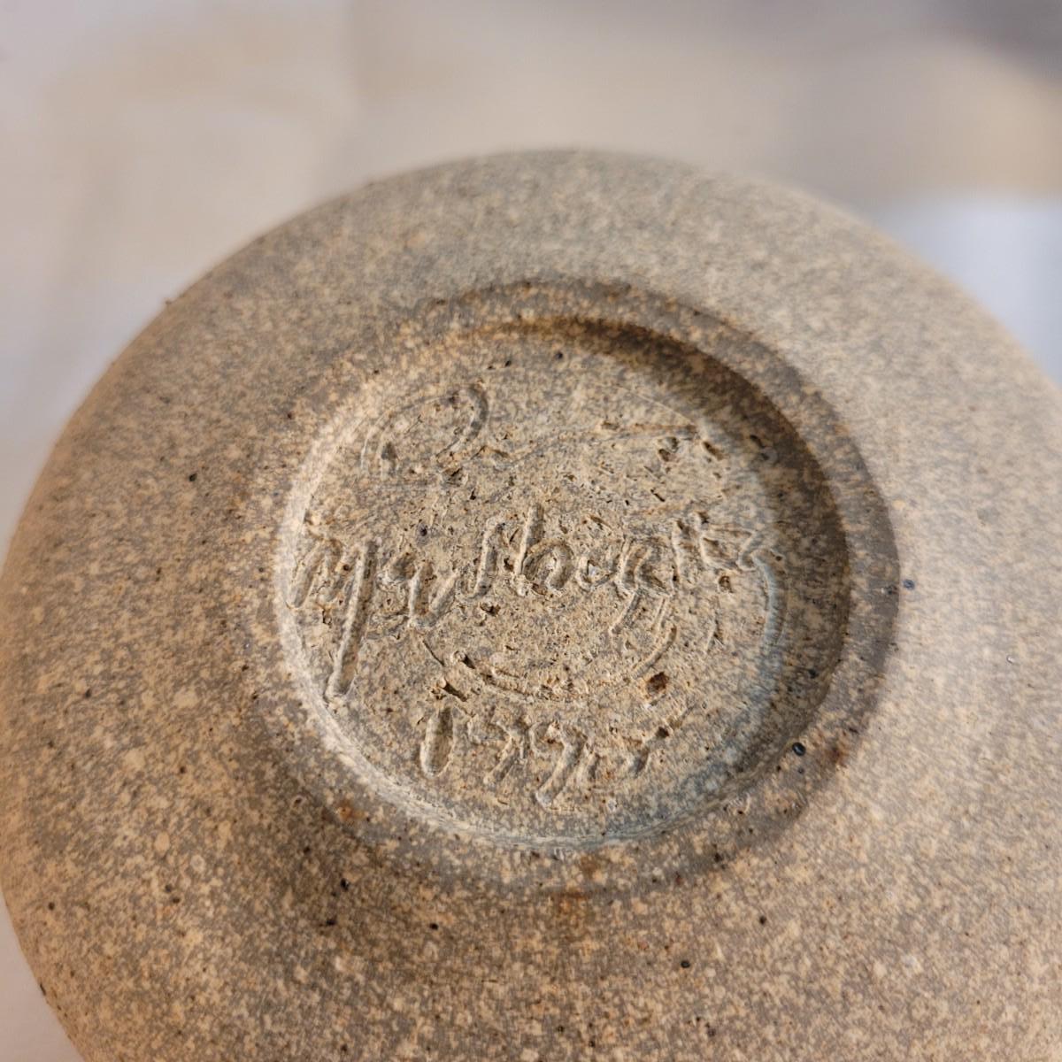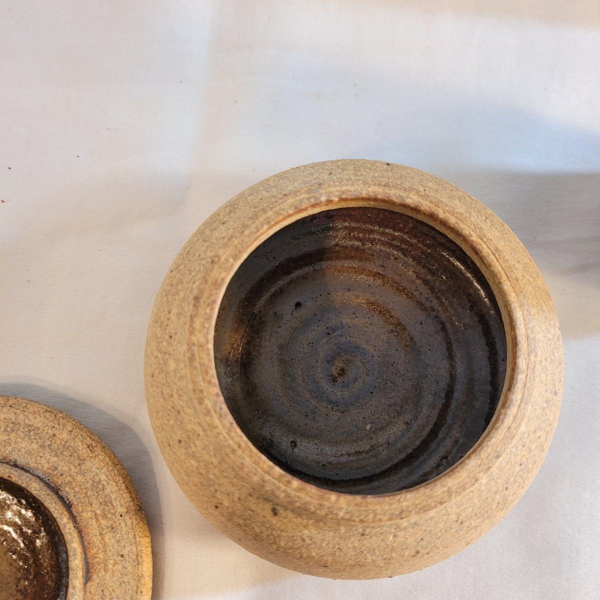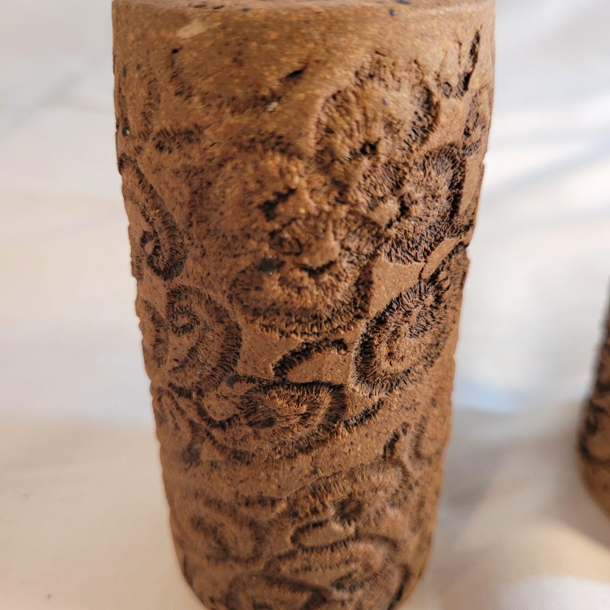 Beautiful, unique earthenware collection including a signed lidded bowl, floral vase, salt and pepper shakers and a small candlestick holder. Vase measures approximately 4"W at opening x10"H. Shipping available.