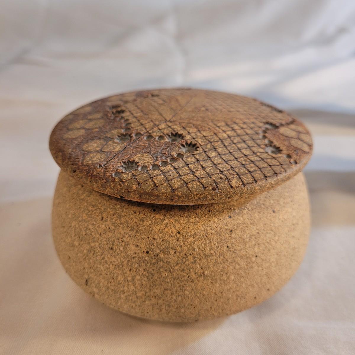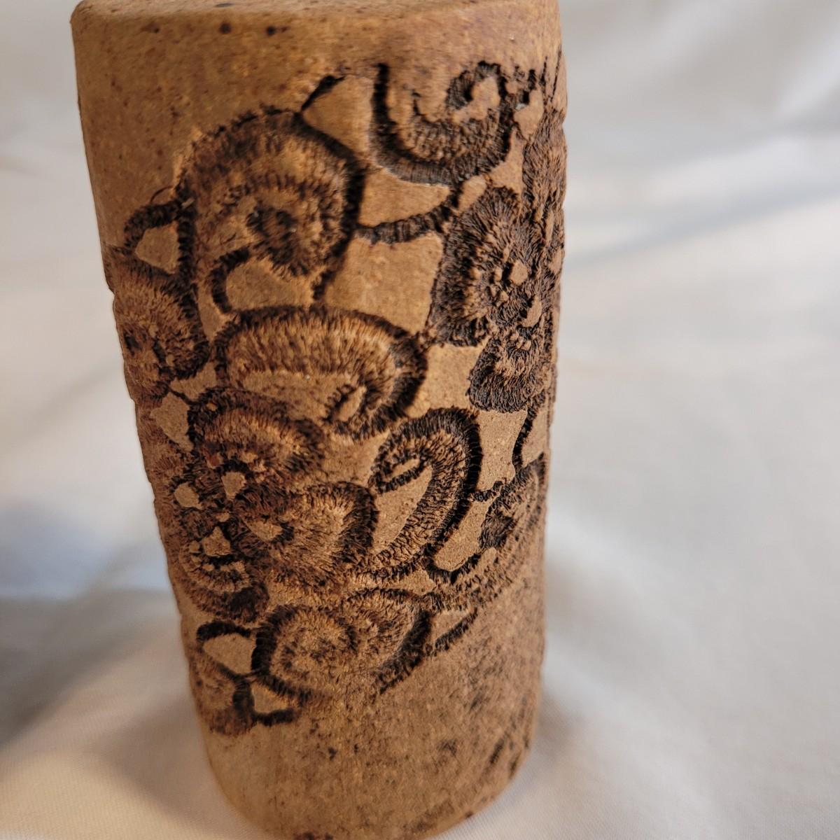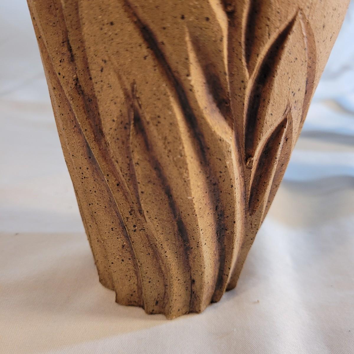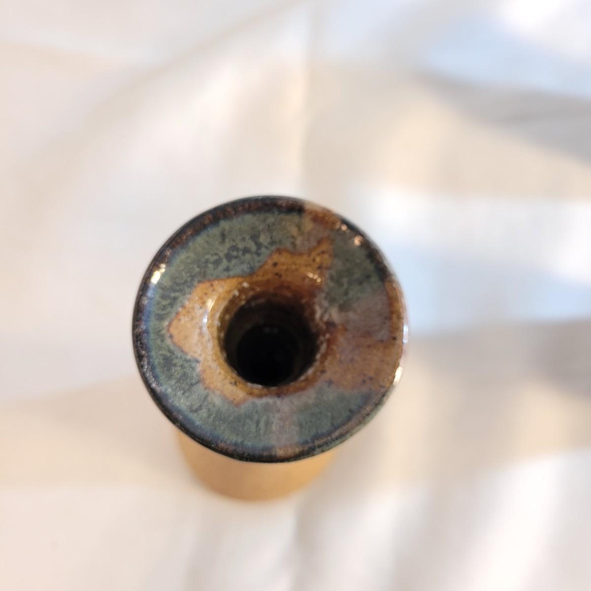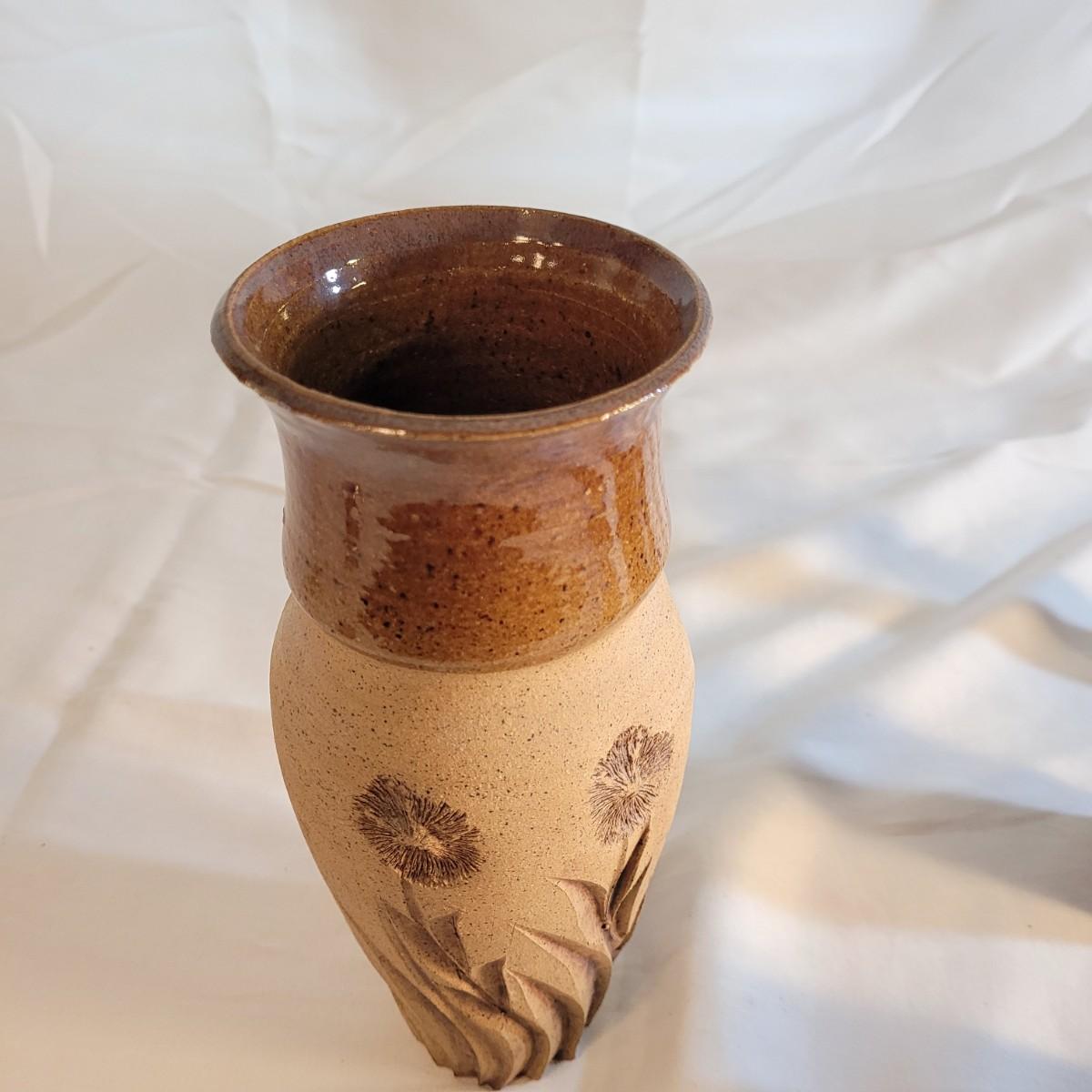 Beautiful, unique earthenware collection including a signed lidded bowl, floral vase, salt and pepper shakers and a small candlestick holder. Vase measures approximately 4"W at opening x10"H. Shipping available.