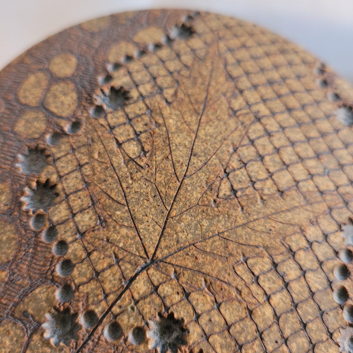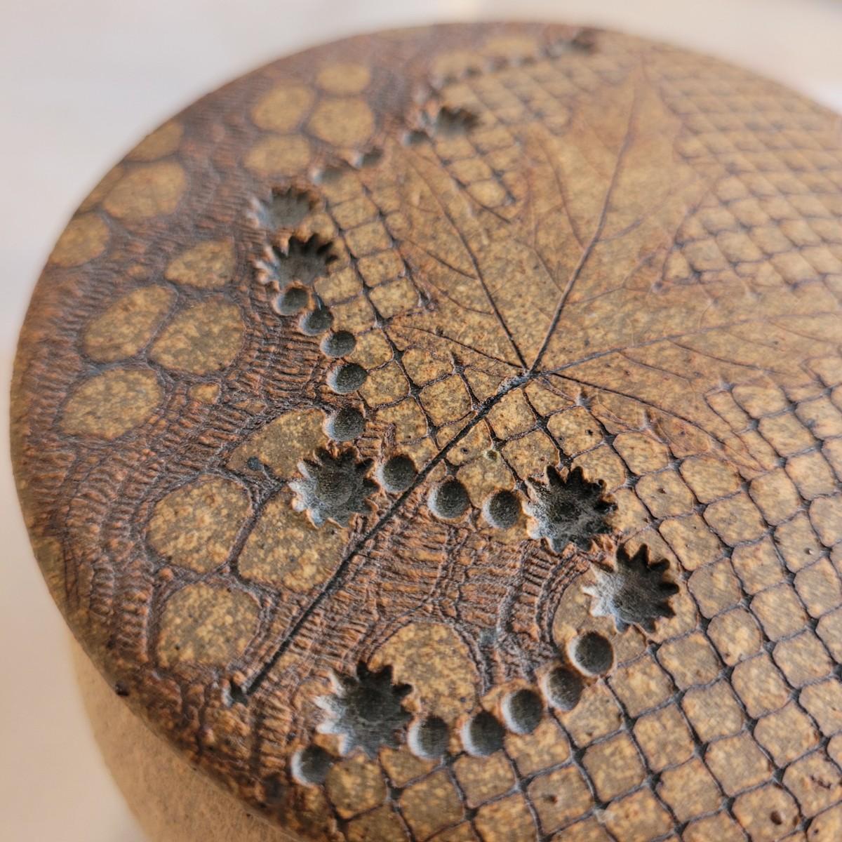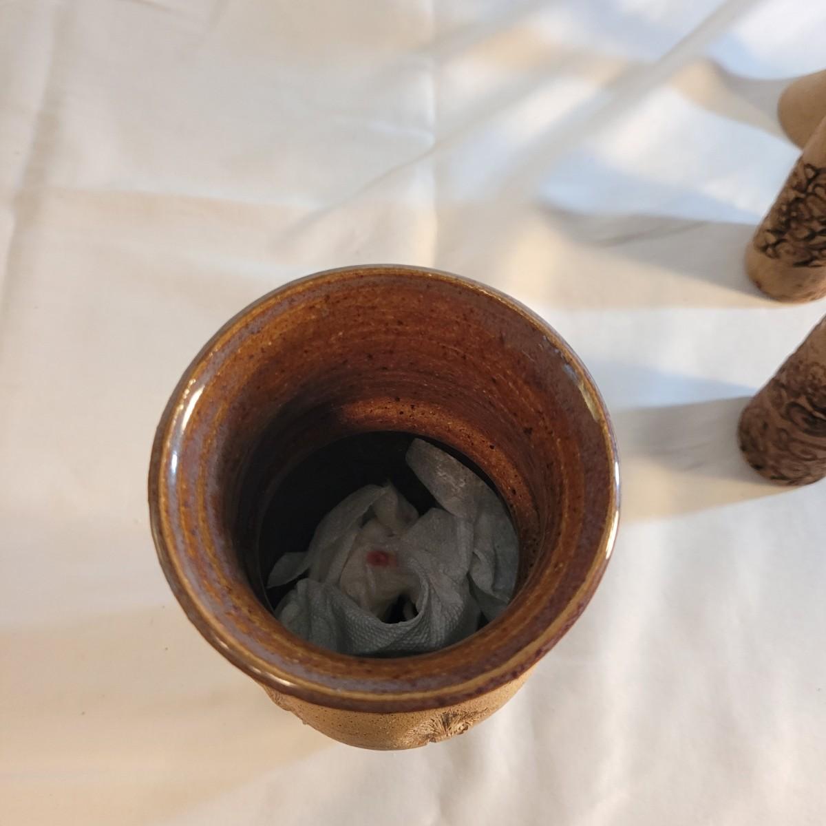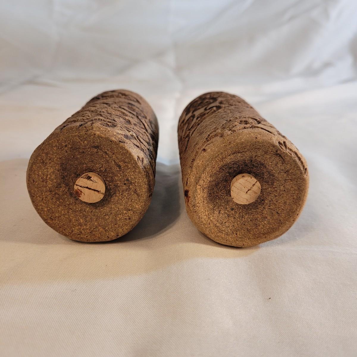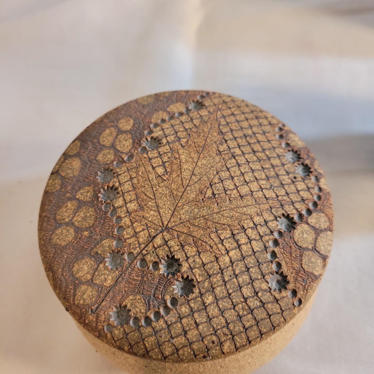 Beautiful, unique earthenware collection including a signed lidded bowl, floral vase, salt and pepper shakers and a small candlestick holder. Vase measures approximately 4"W at opening x10"H. Shipping available.