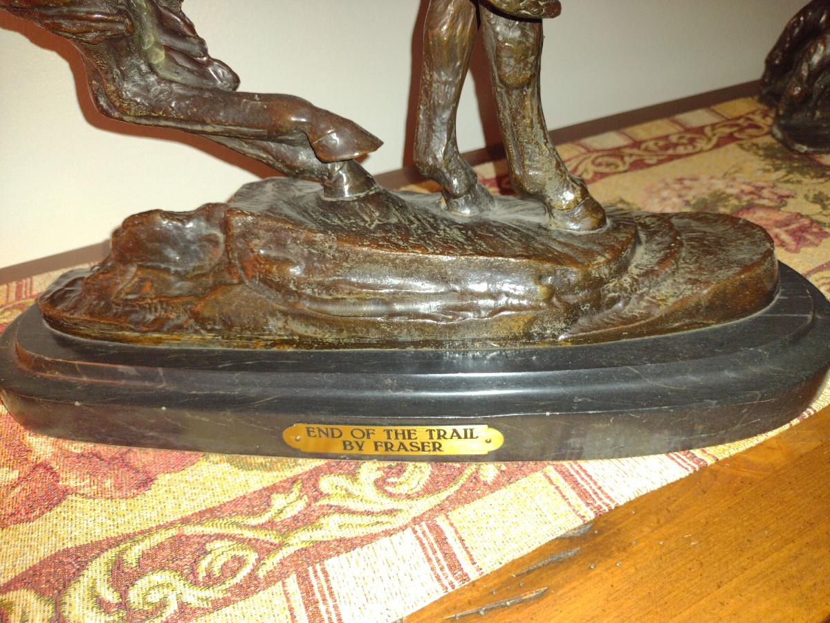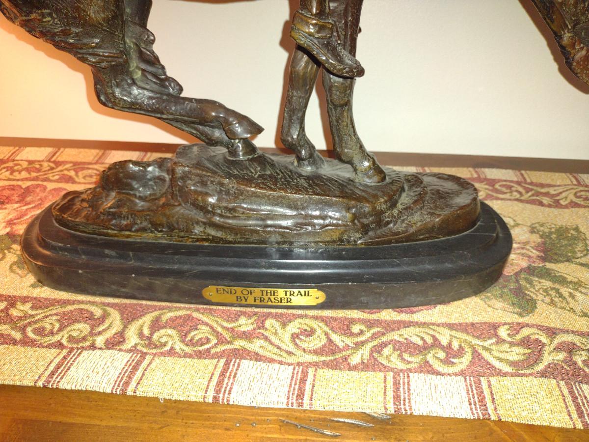 Signed Reproduction 'End of the Trail' Heavy Bronze Statue by James Earle Fraser- Approx 18 1/2" Tall. Item is on marble base.