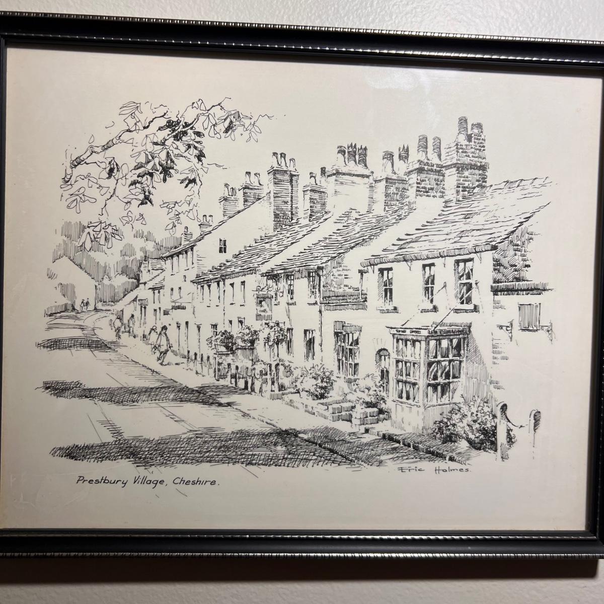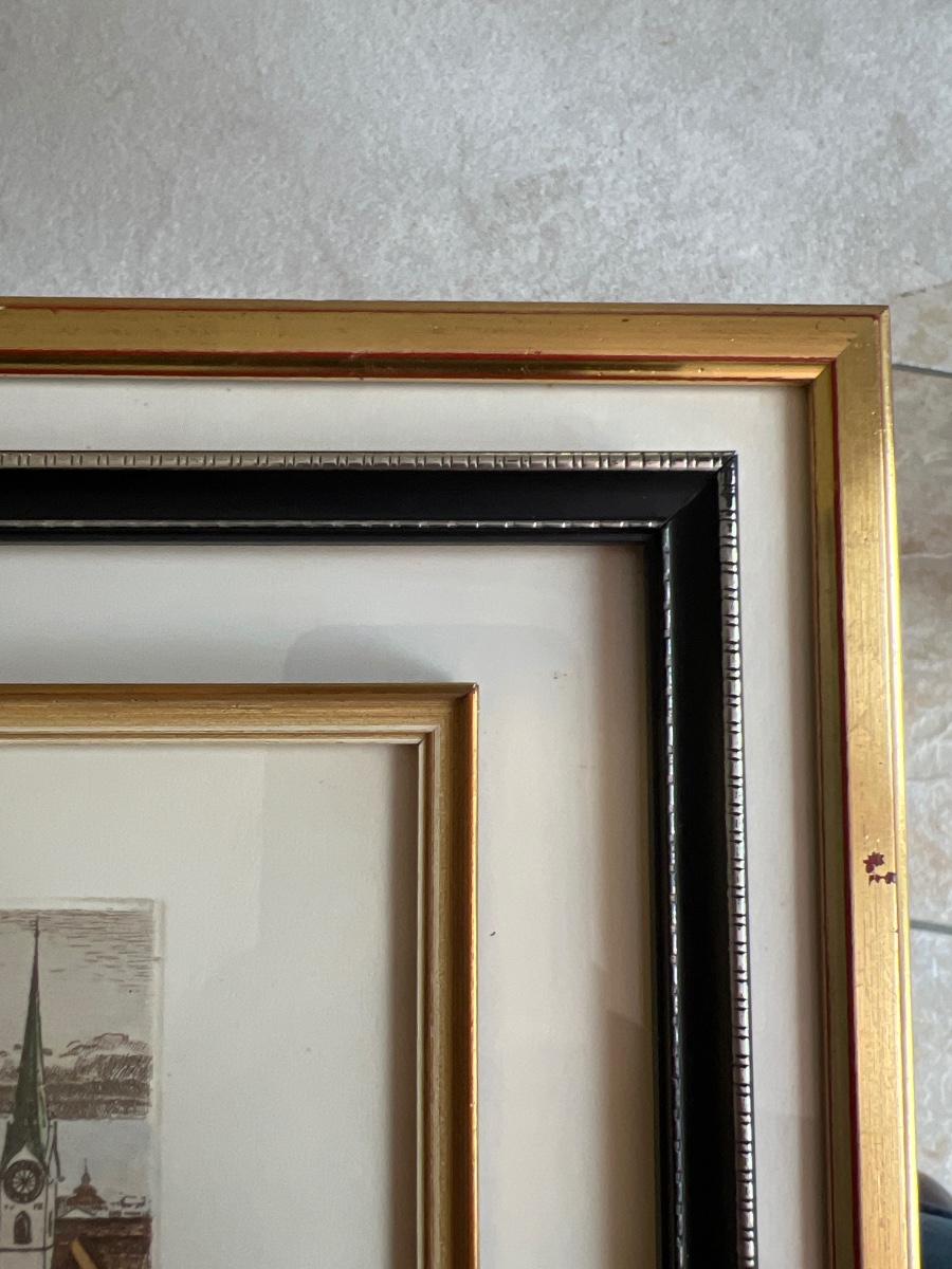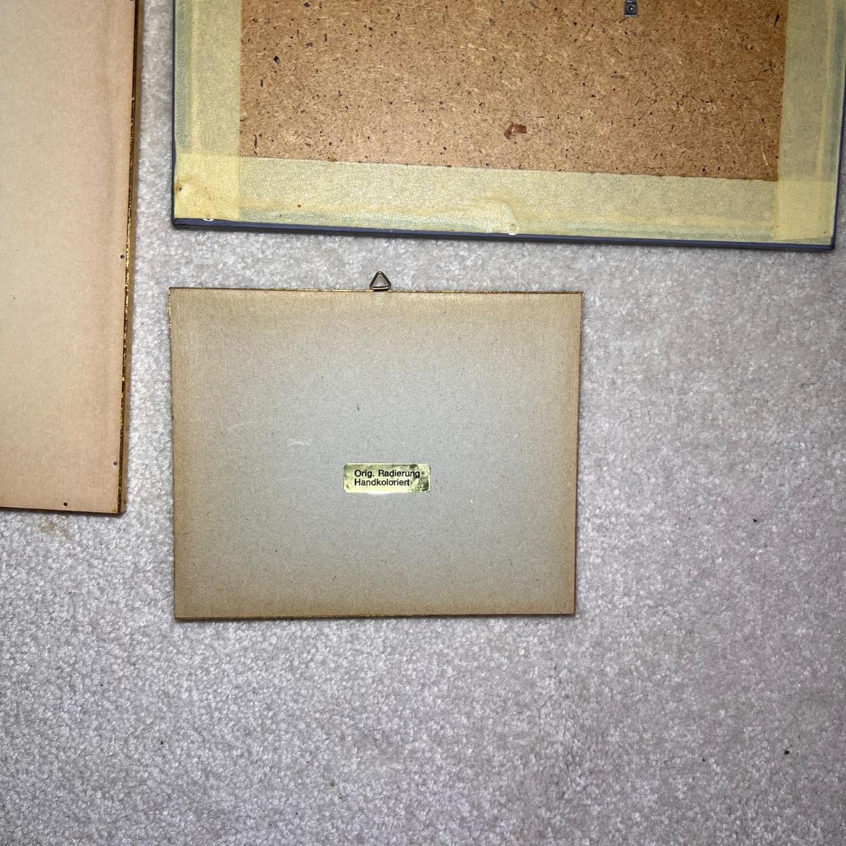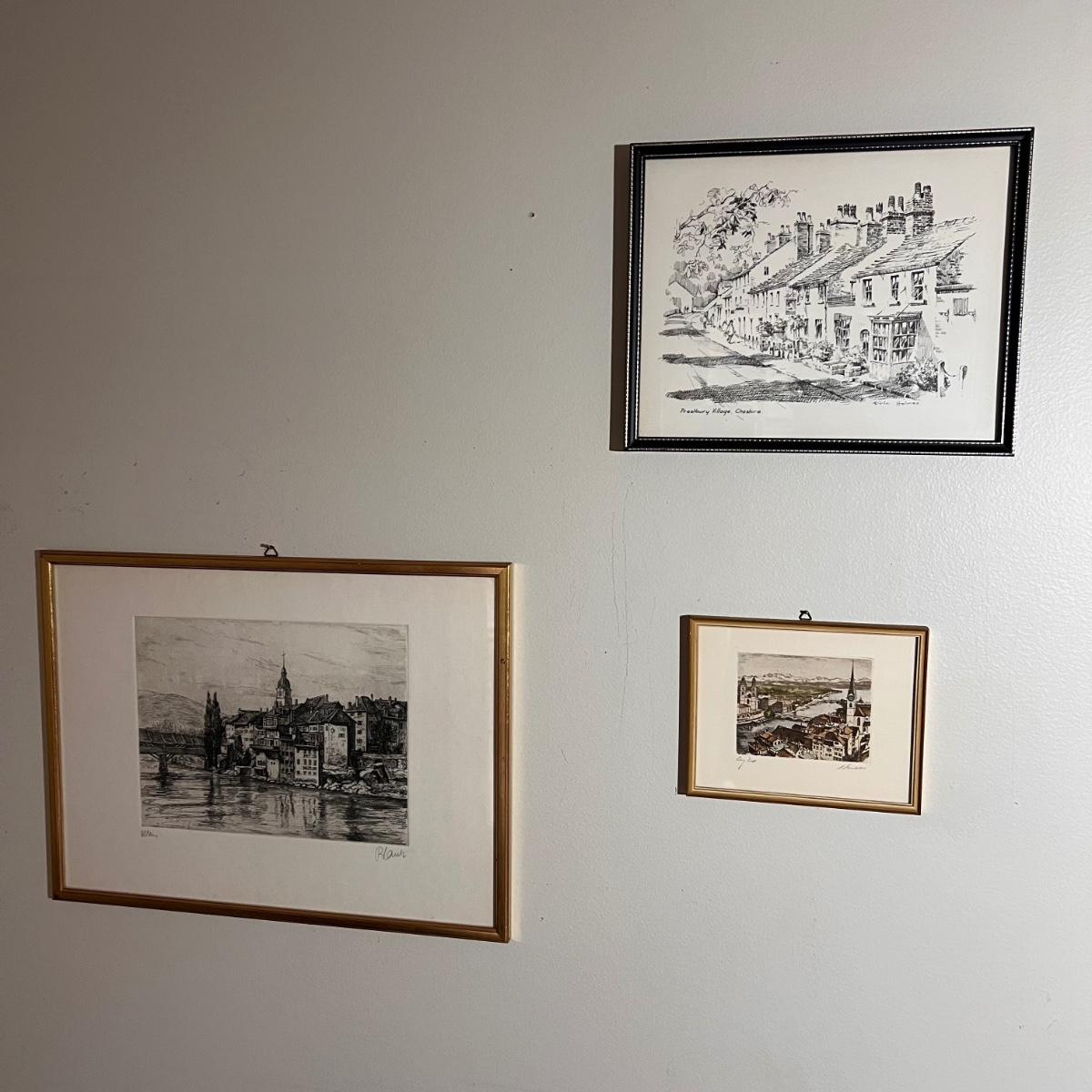 Three framed etchings includes two that are pencil signed; signatures on these two are indecipherable, the smaller one has been colored and possibly a German river scene with a church spire. The third peice appears to be a print by Eric Holmes of Prestbury Village, Cheshire. This print is the only one of the three not matted, its frame is a black/silver painted wood. All three are under glass. The other two frames are gilded wood.