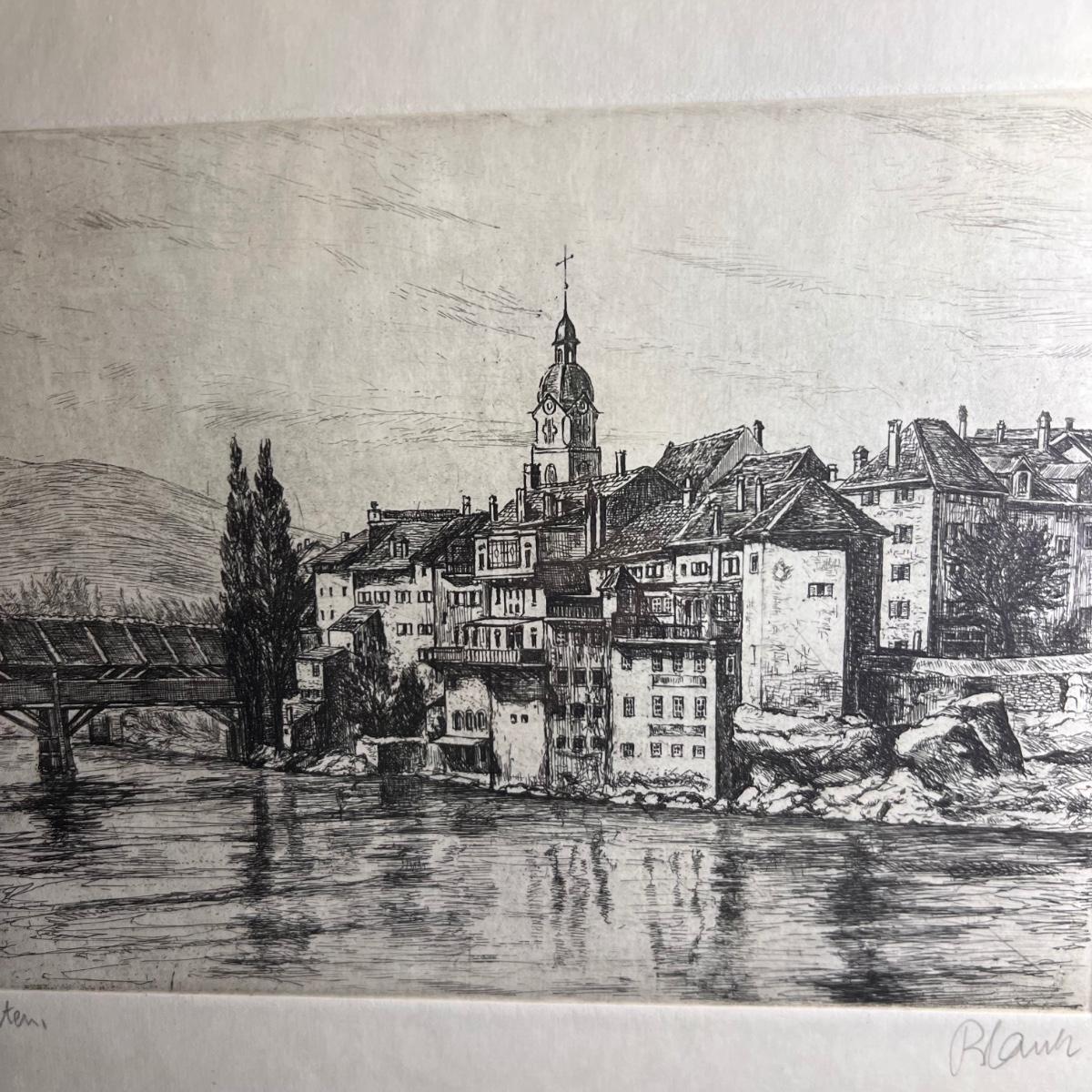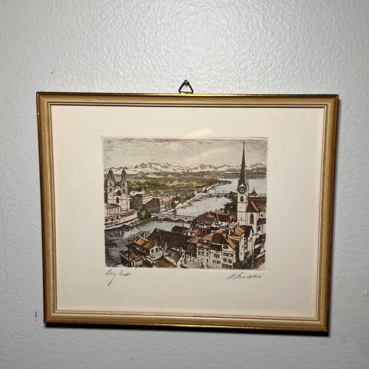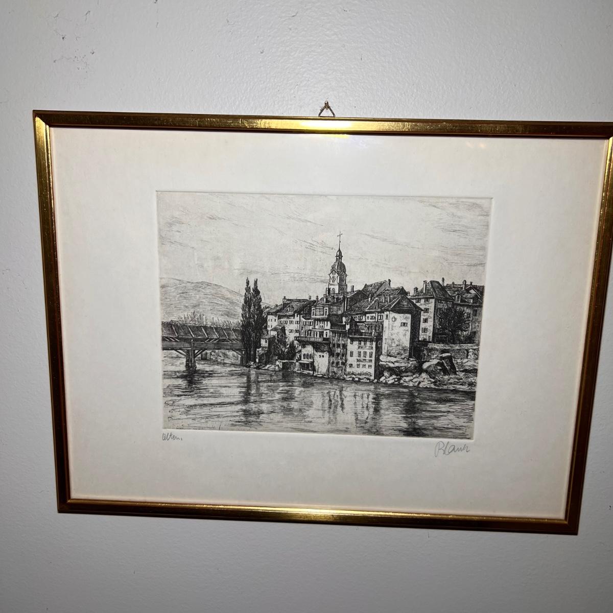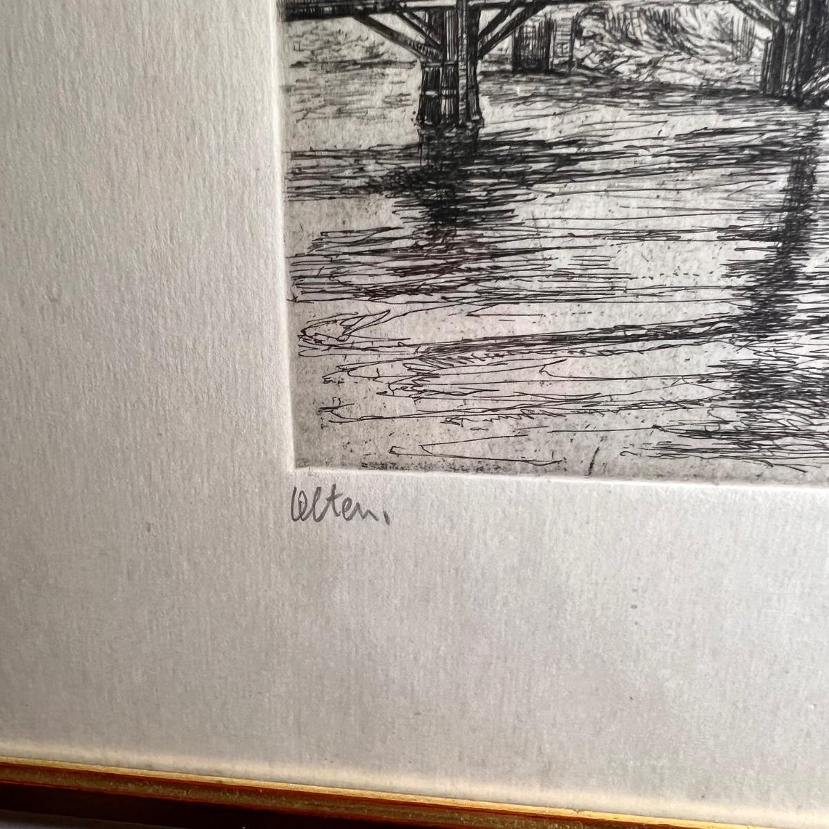 Three framed etchings includes two that are pencil signed; signatures on these two are indecipherable, the smaller one has been colored and possibly a German river scene with a church spire. The third peice appears to be a print by Eric Holmes of Prestbury Village, Cheshire. This print is the only one of the three not matted, its frame is a black/silver painted wood. All three are under glass. The other two frames are gilded wood.