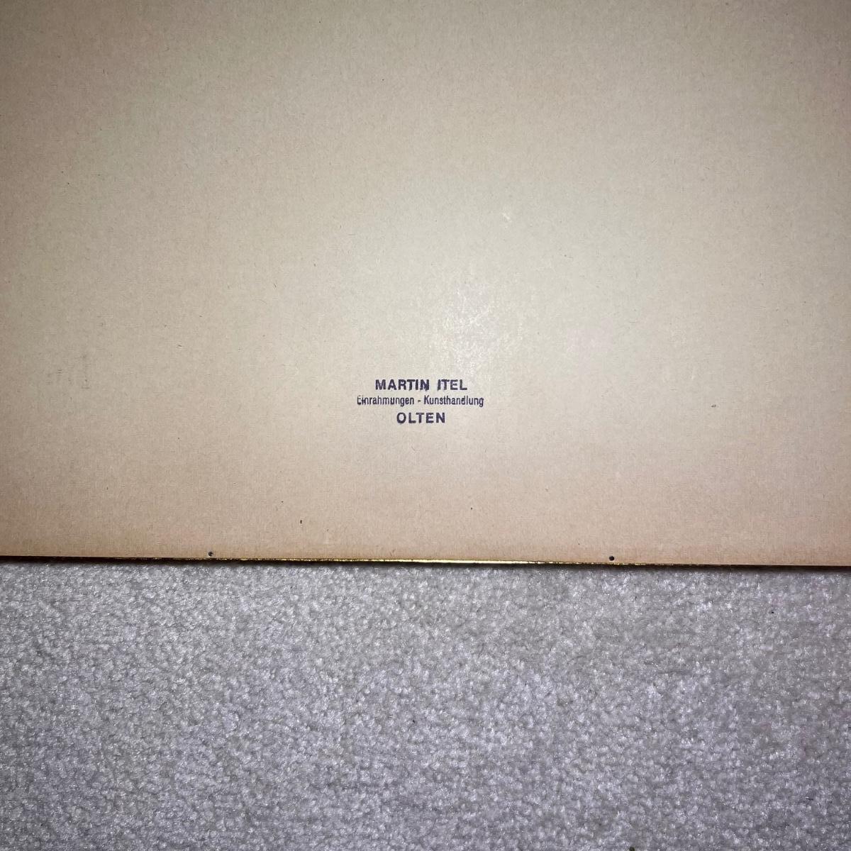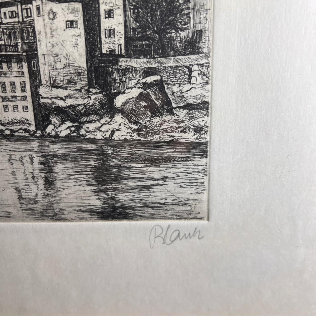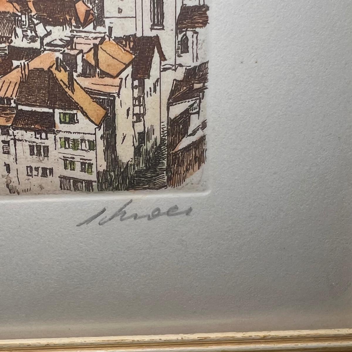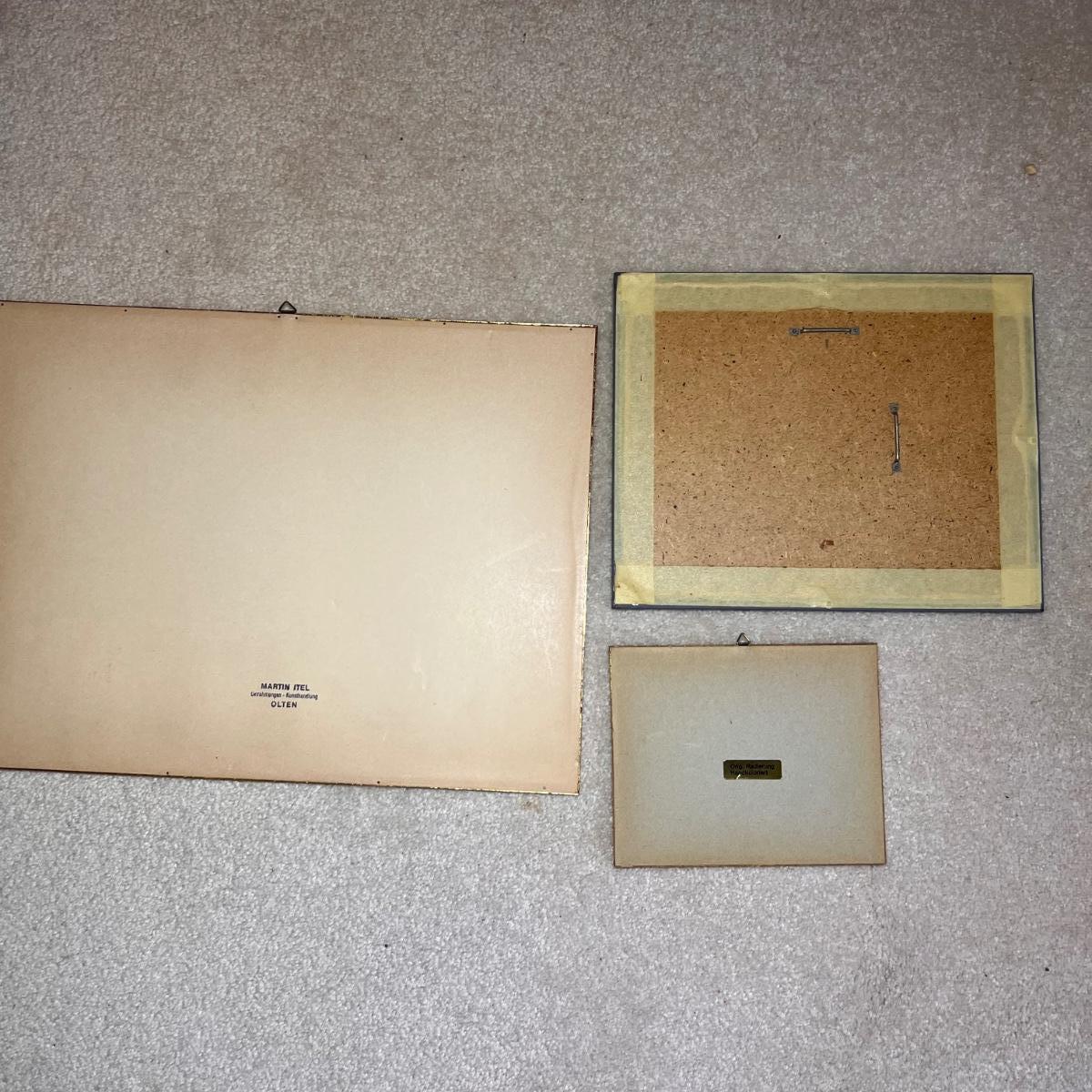 Three framed etchings includes two that are pencil signed; signatures on these two are indecipherable, the smaller one has been colored and possibly a German river scene with a church spire. The third peice appears to be a print by Eric Holmes of Prestbury Village, Cheshire. This print is the only one of the three not matted, its frame is a black/silver painted wood. All three are under glass. The other two frames are gilded wood.