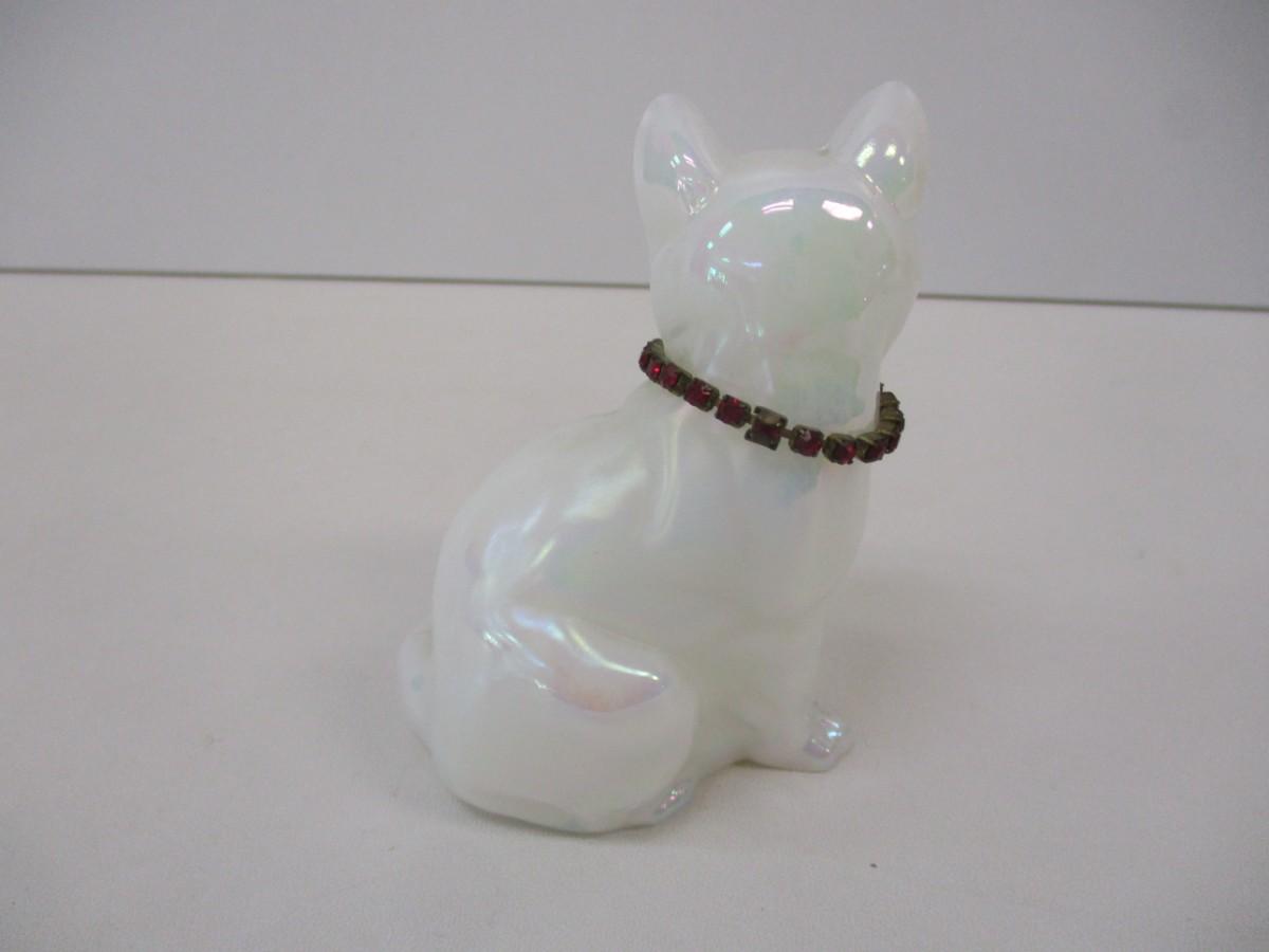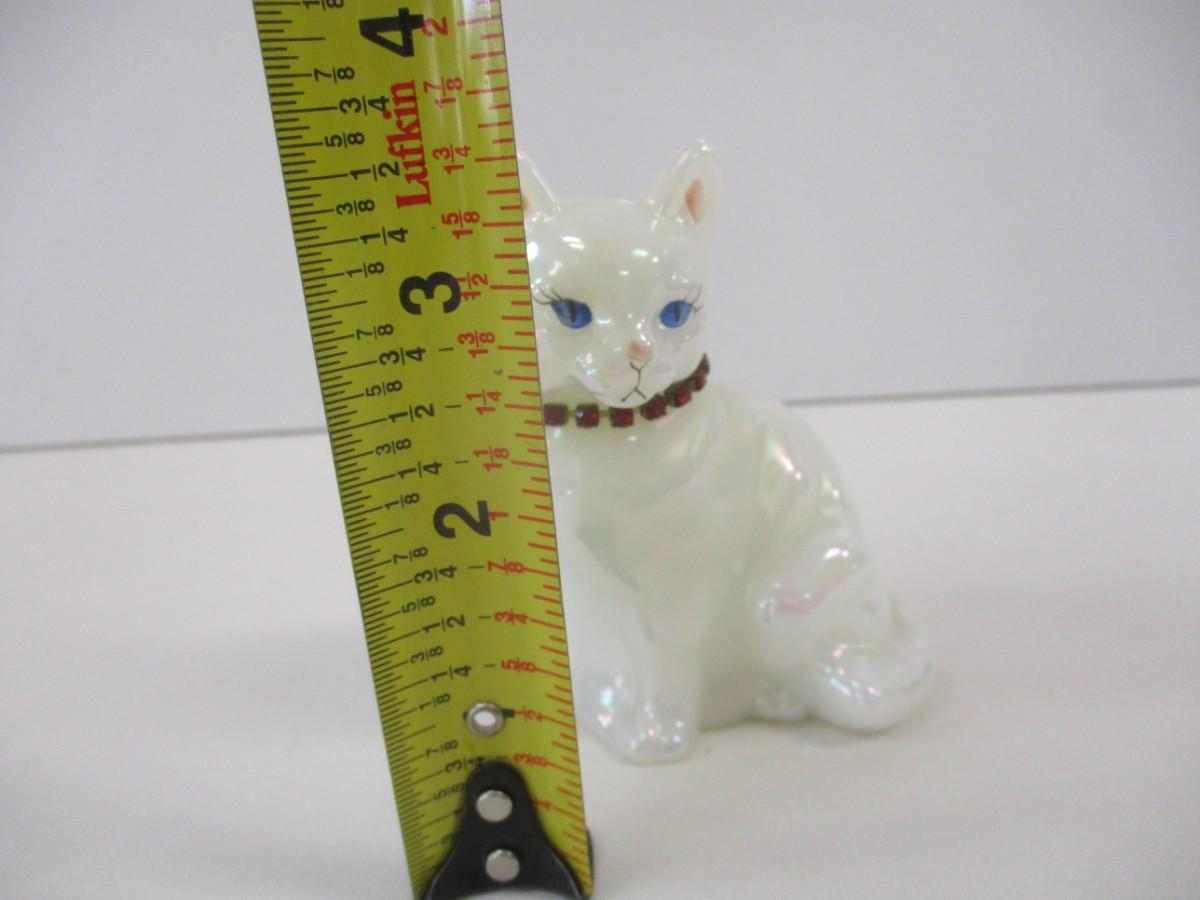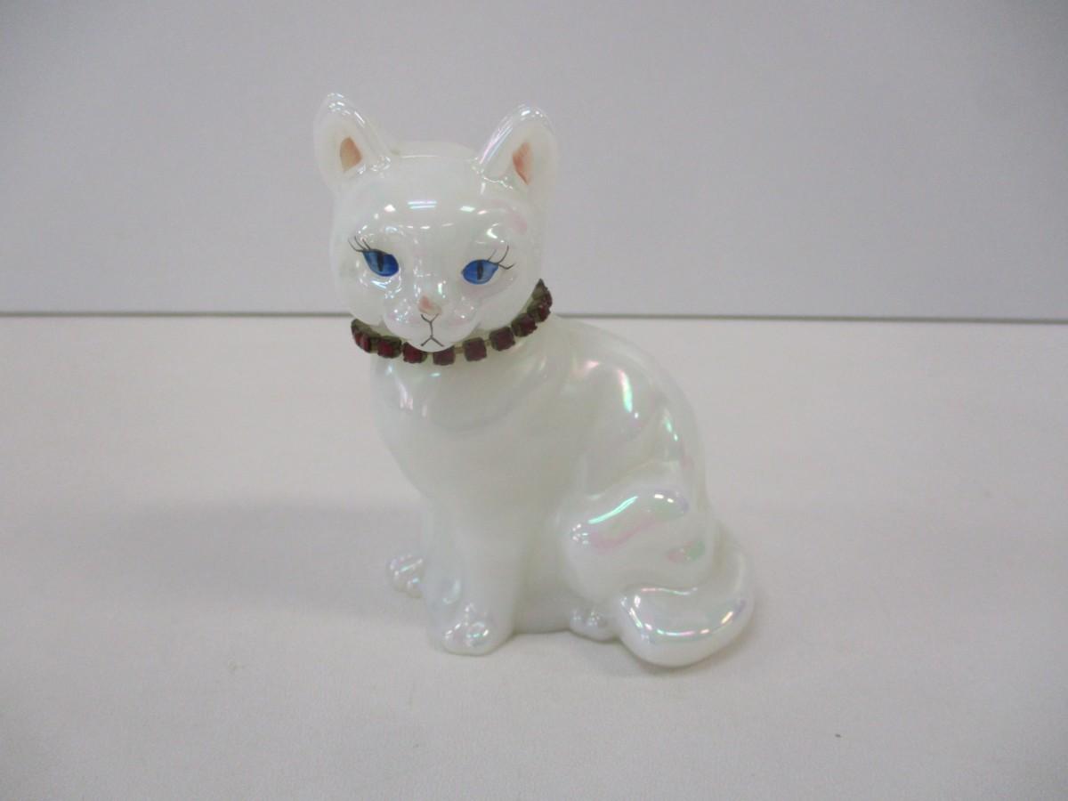 Signed Fenton White Iridescent Opalescent Hand Painted Cat Figure Red Birthstone Collar & Blue Eyes