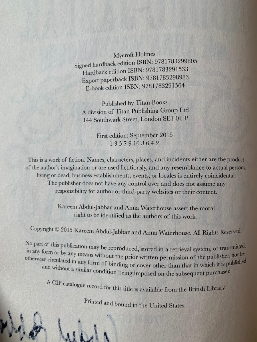 Signed first edition of "Mycroft Holmes' by Kareem Abdul-Jabber. In very good condition
