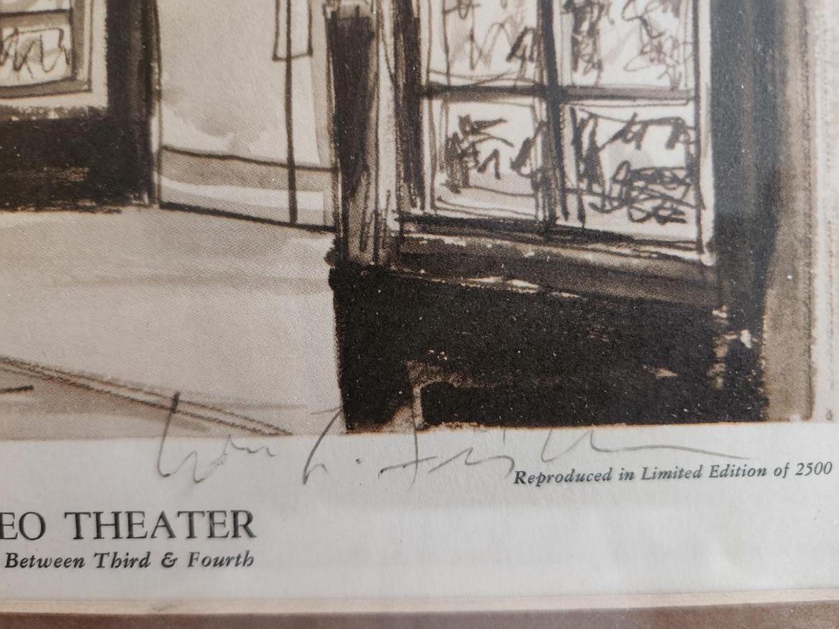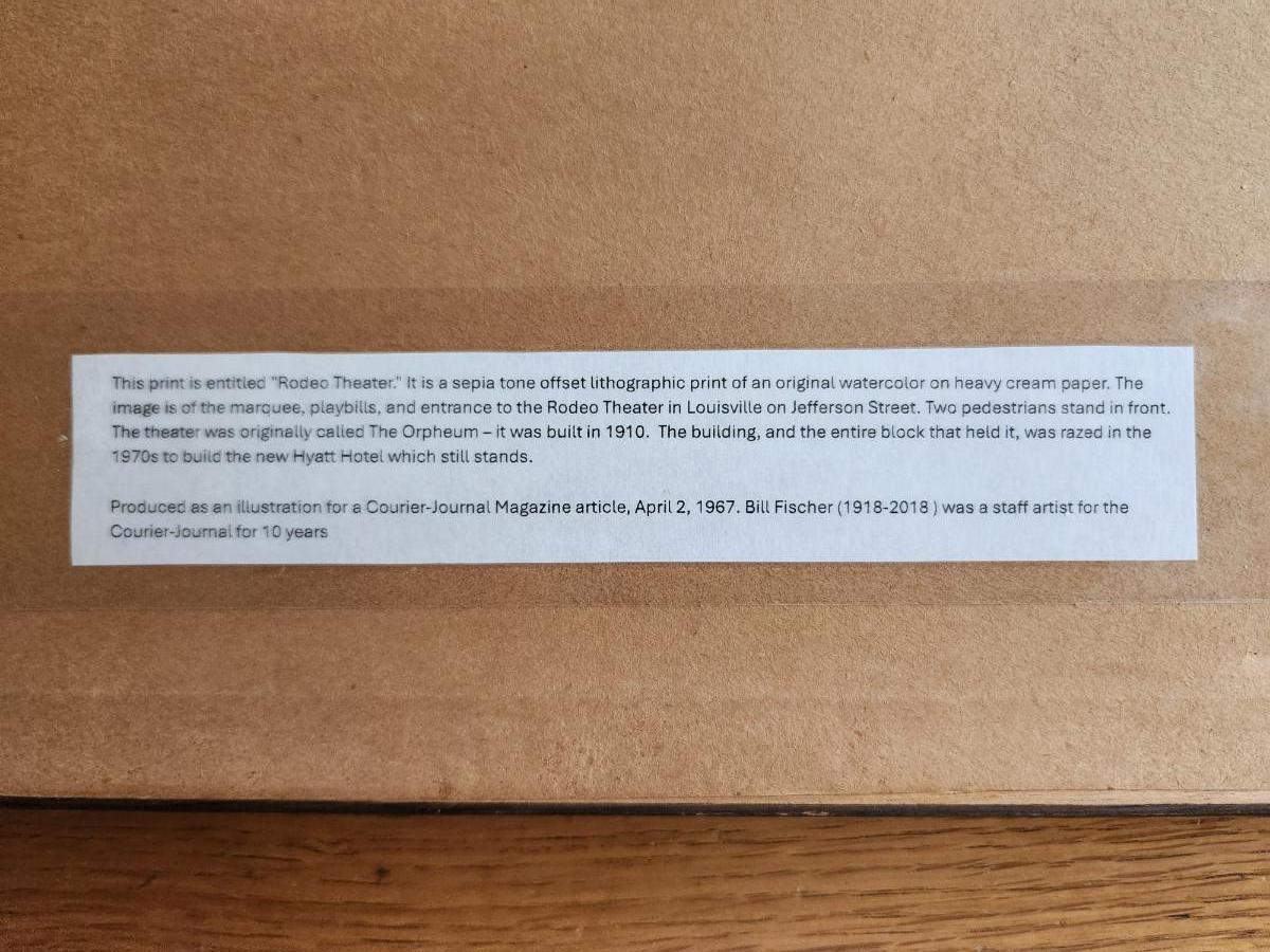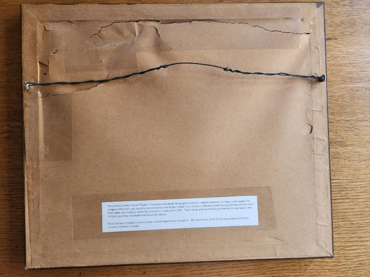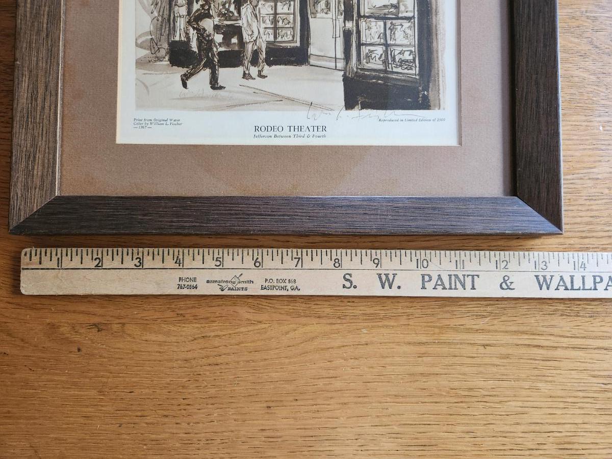 This auction lot is for a nicely framed copy of a Signed Wm. Fischer Print of Rodeo Movie Theater. The old Louisville movie theater was located on Jefferson Street where the Hyatt Hotel now stands. Fischer who died a few years ago at age 100 was know for drawing many landmark buildings in Louisville, KY. This is edition is genuinely signed over the print. See photos for measurements.