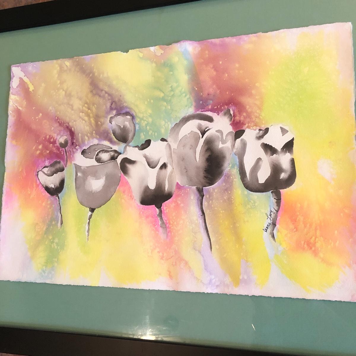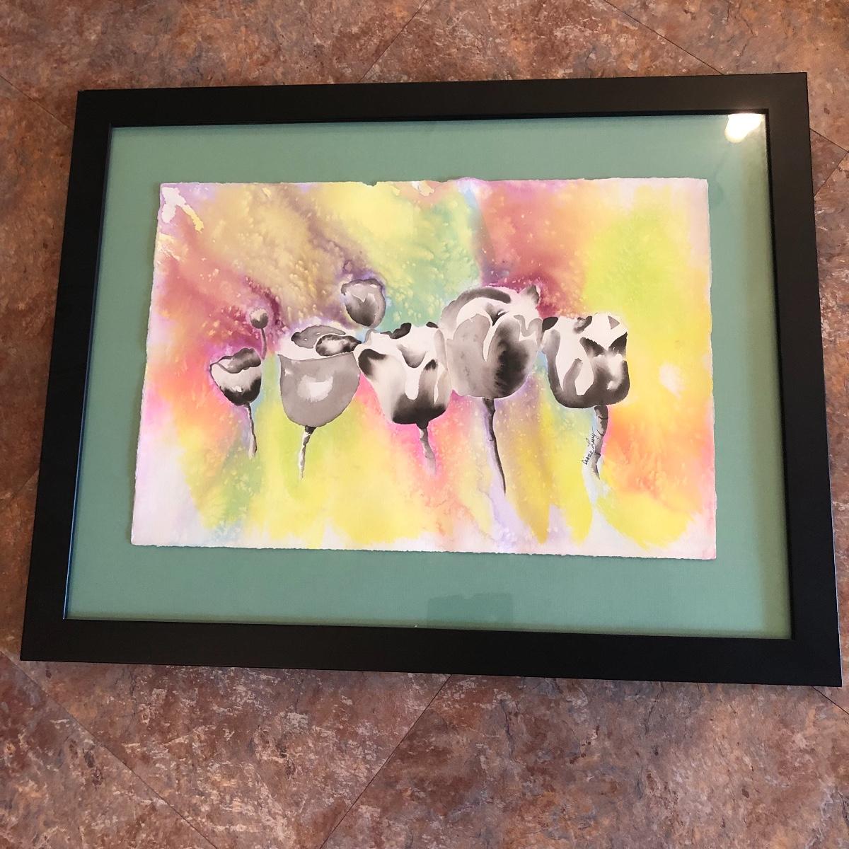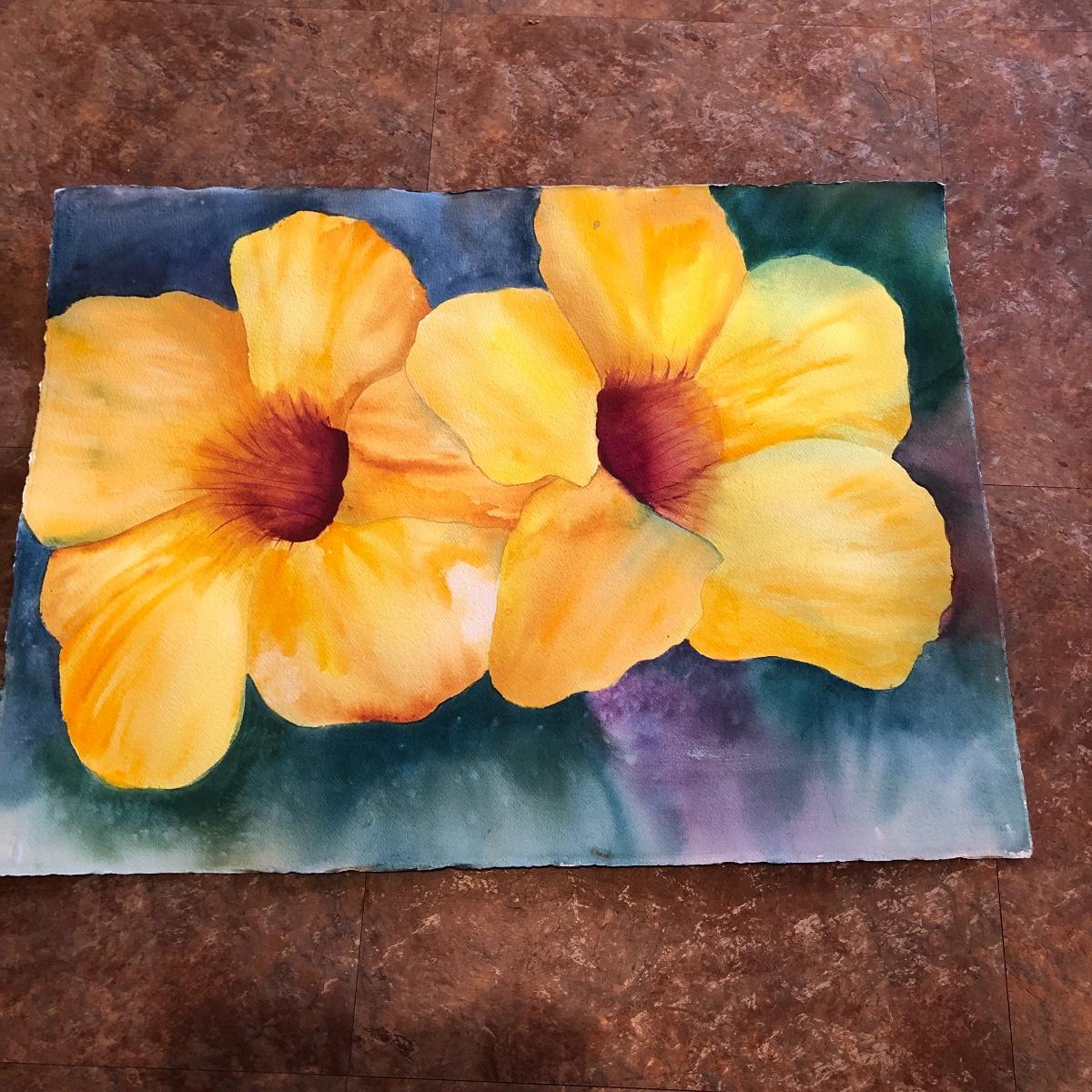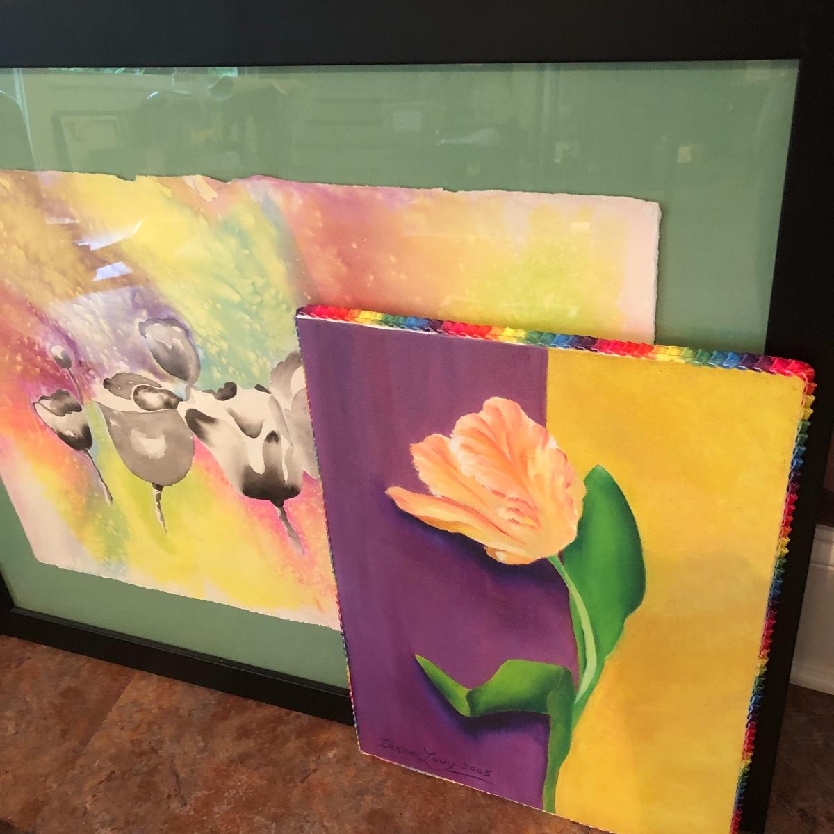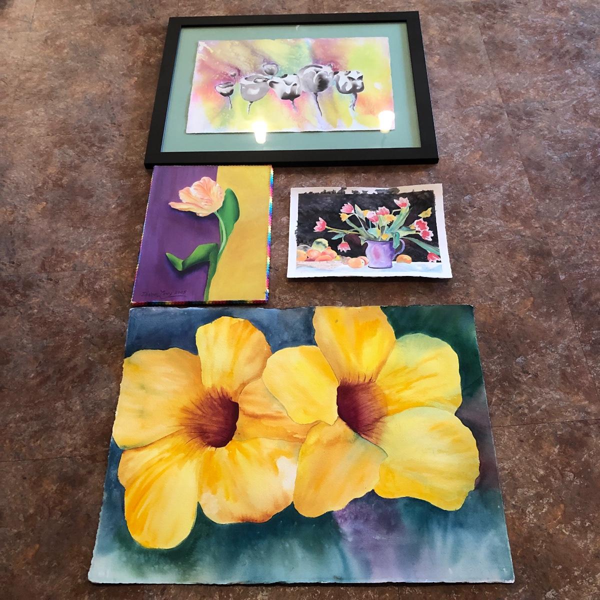 The framed watercolor is signed by Diane Levy and measures 30” x 23.5”. The other three pieces of art are on canvas and heavy sketch paper. The large yellow flowers measure 30x23.5 Local pick up only.