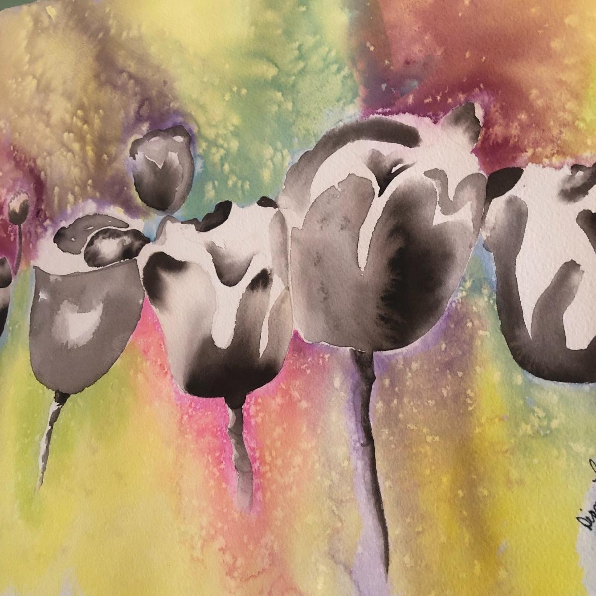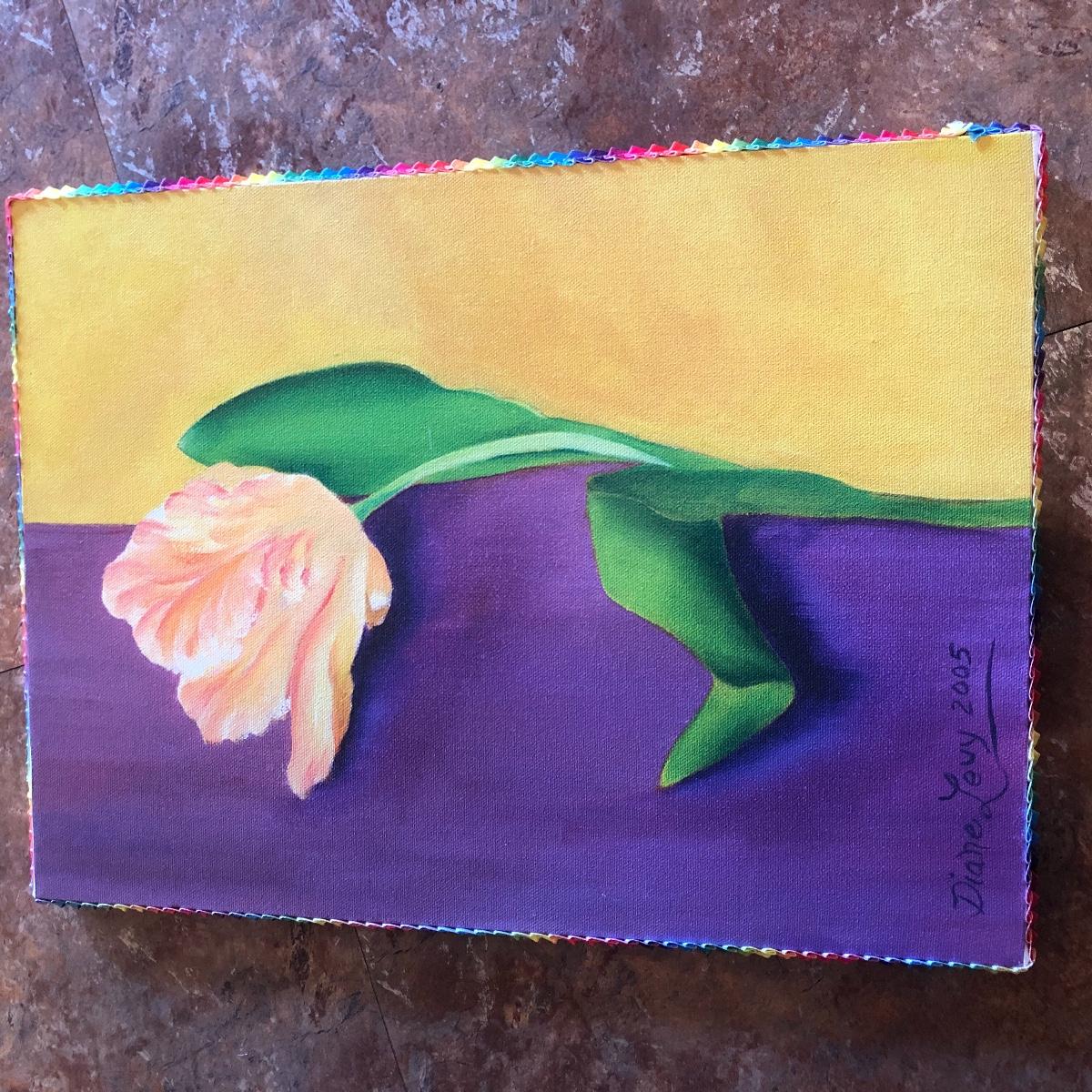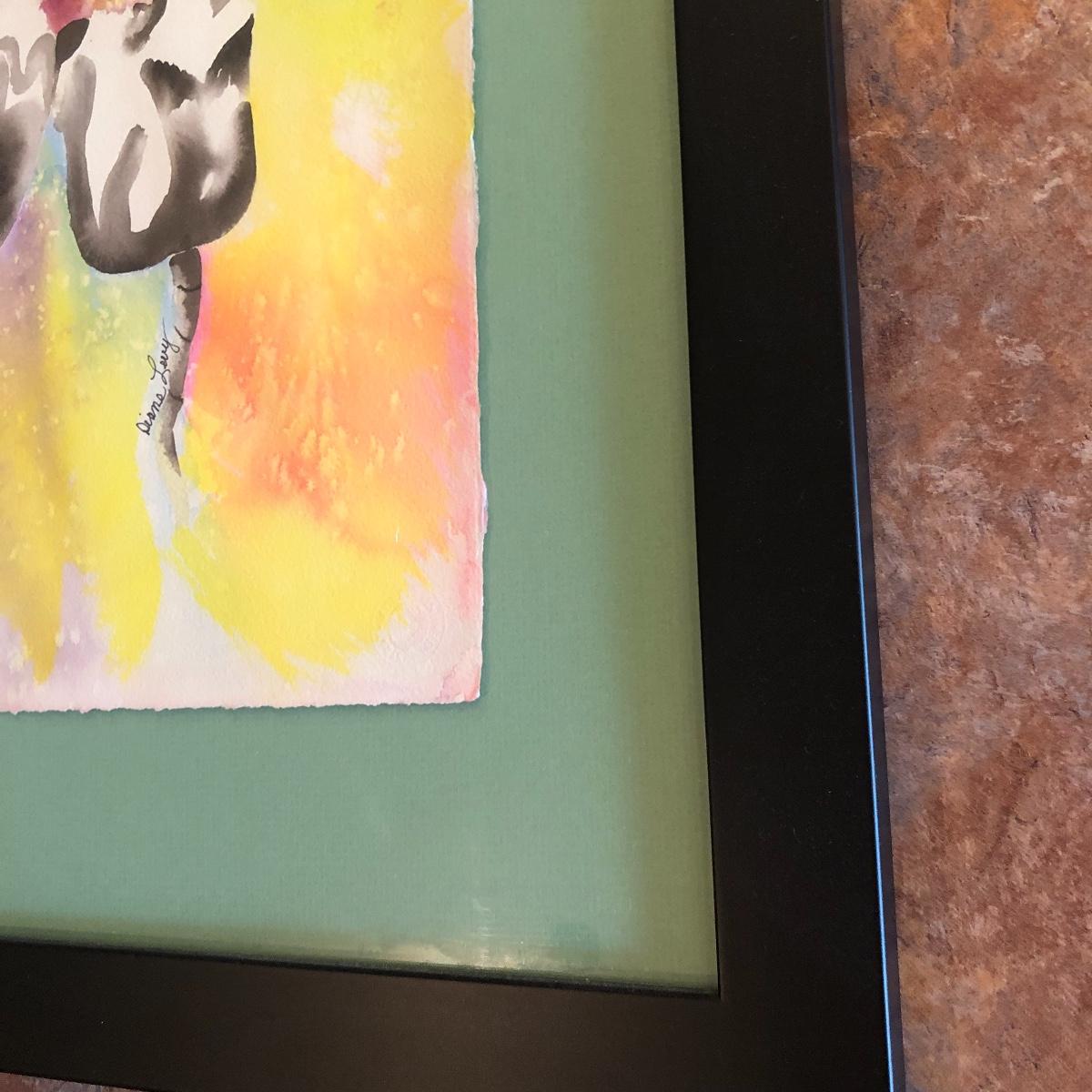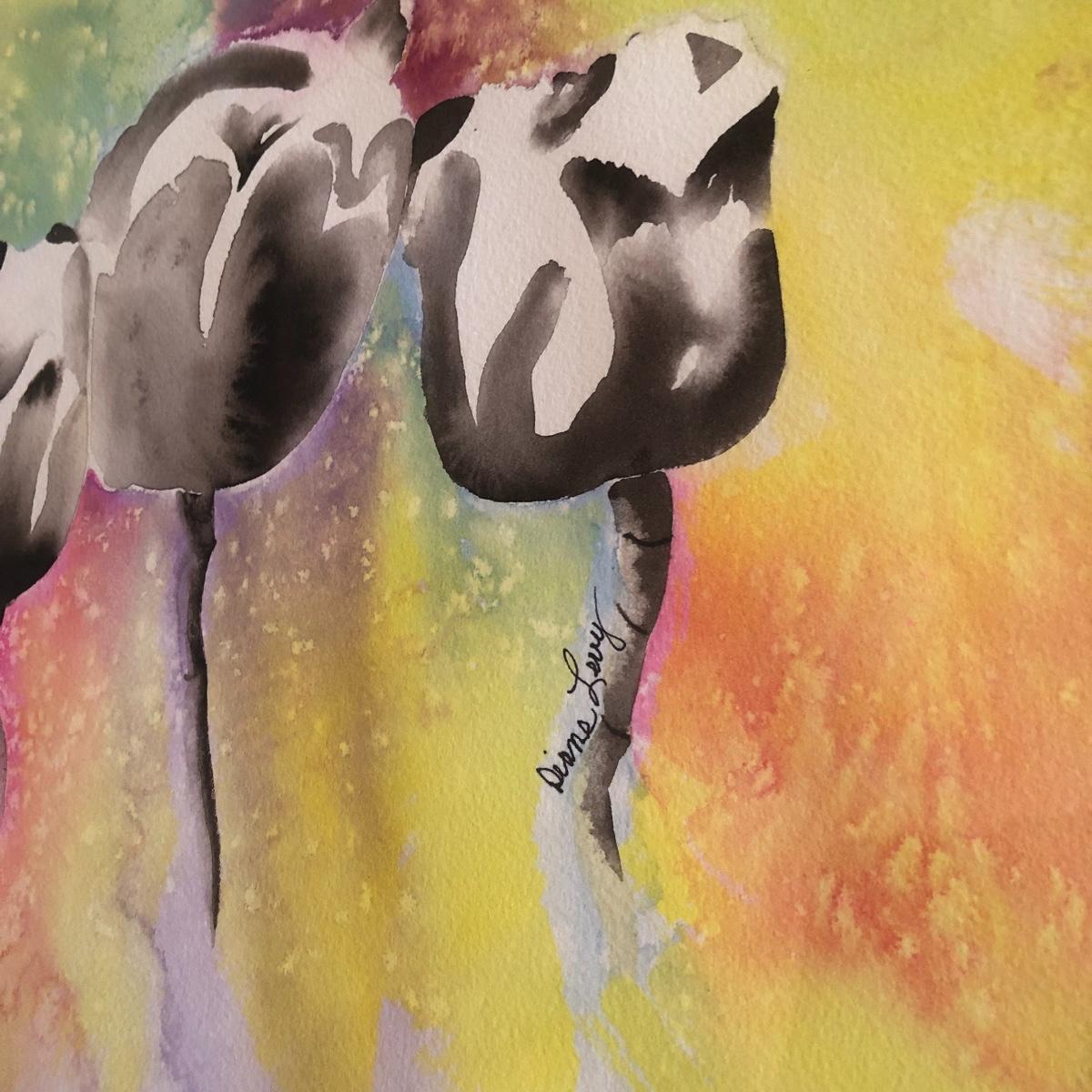 The framed watercolor is signed by Diane Levy and measures 30” x 23.5”. The other three pieces of art are on canvas and heavy sketch paper. The large yellow flowers measure 30x23.5 Local pick up only.