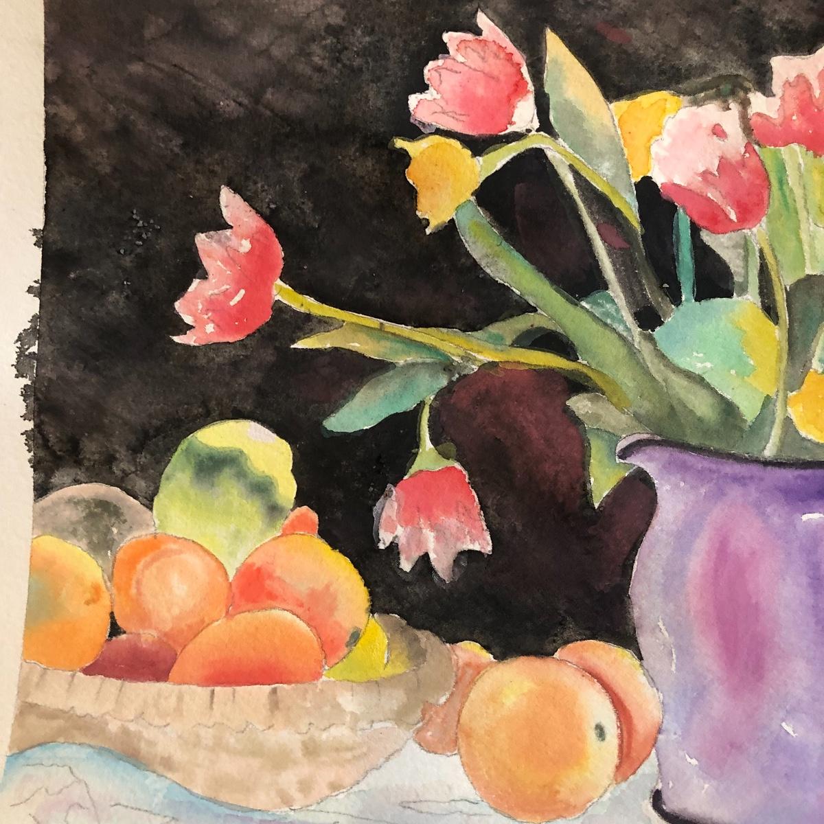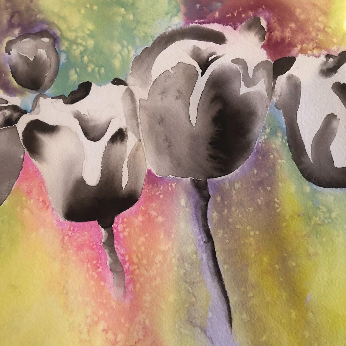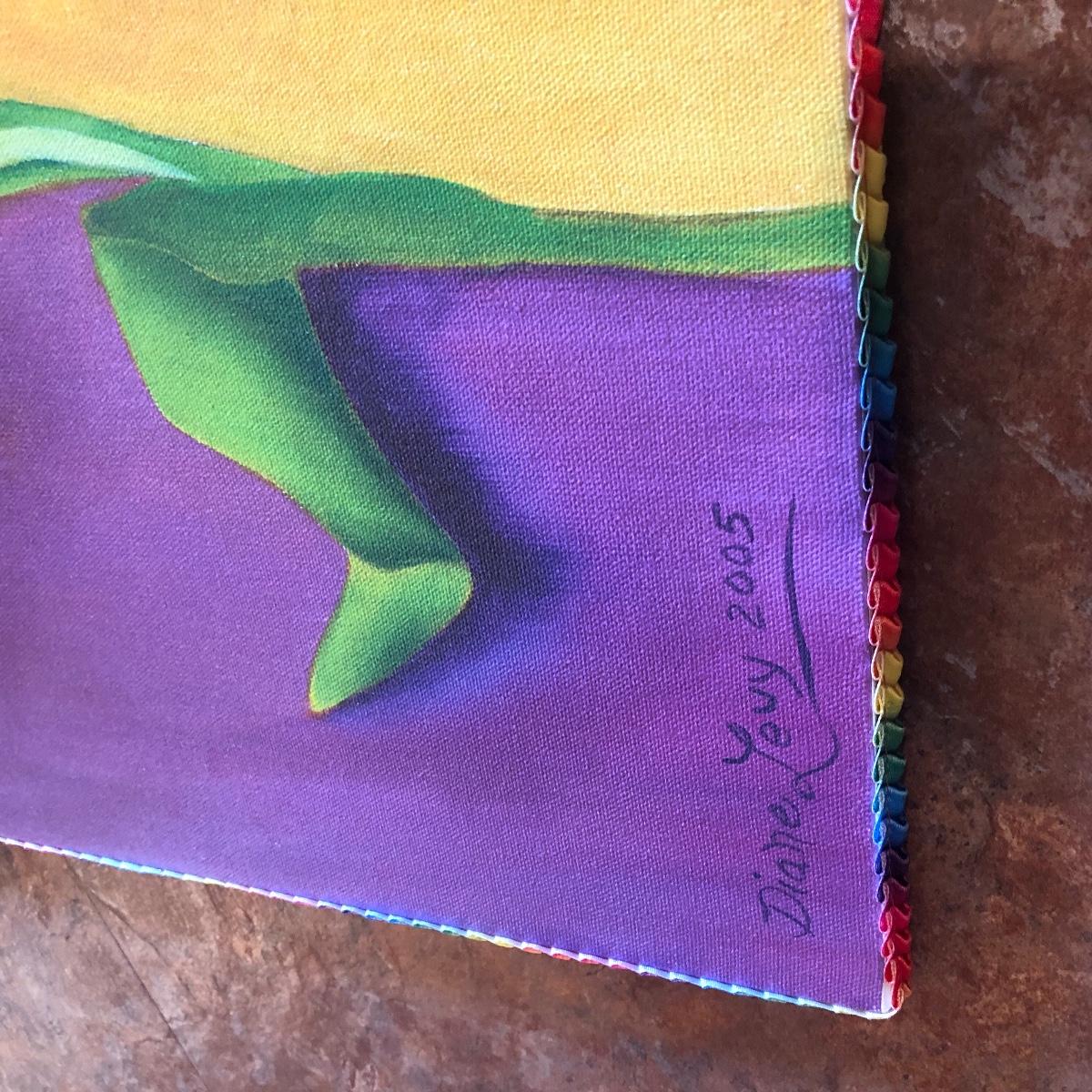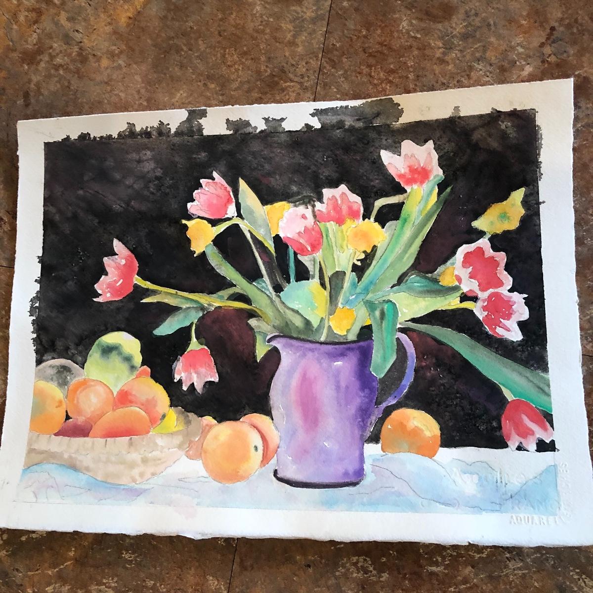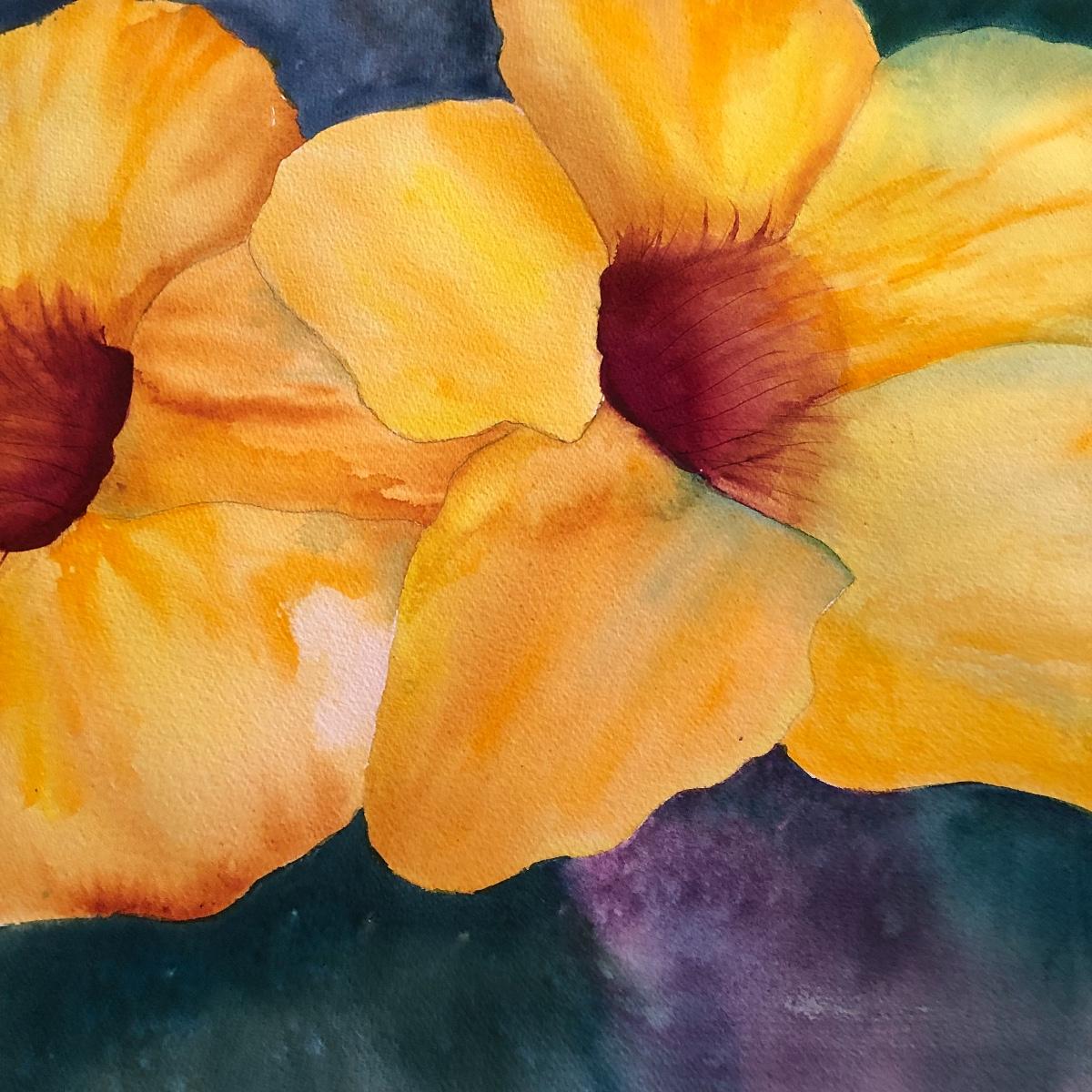 The framed watercolor is signed by Diane Levy and measures 30” x 23.5”. The other three pieces of art are on canvas and heavy sketch paper. The large yellow flowers measure 30x23.5 Local pick up only.