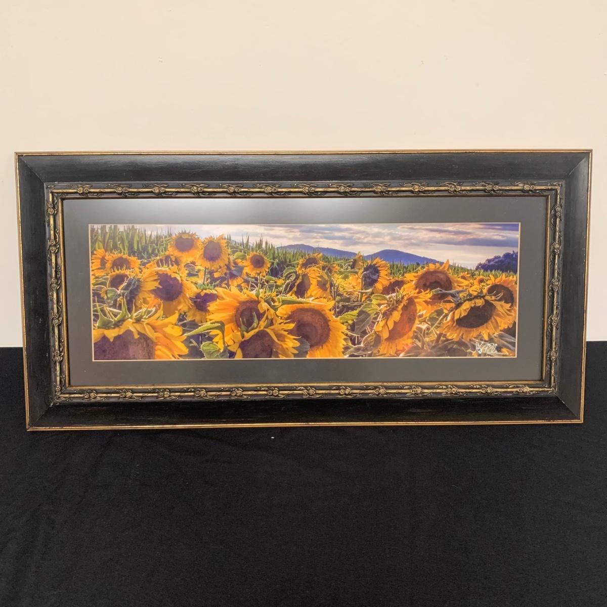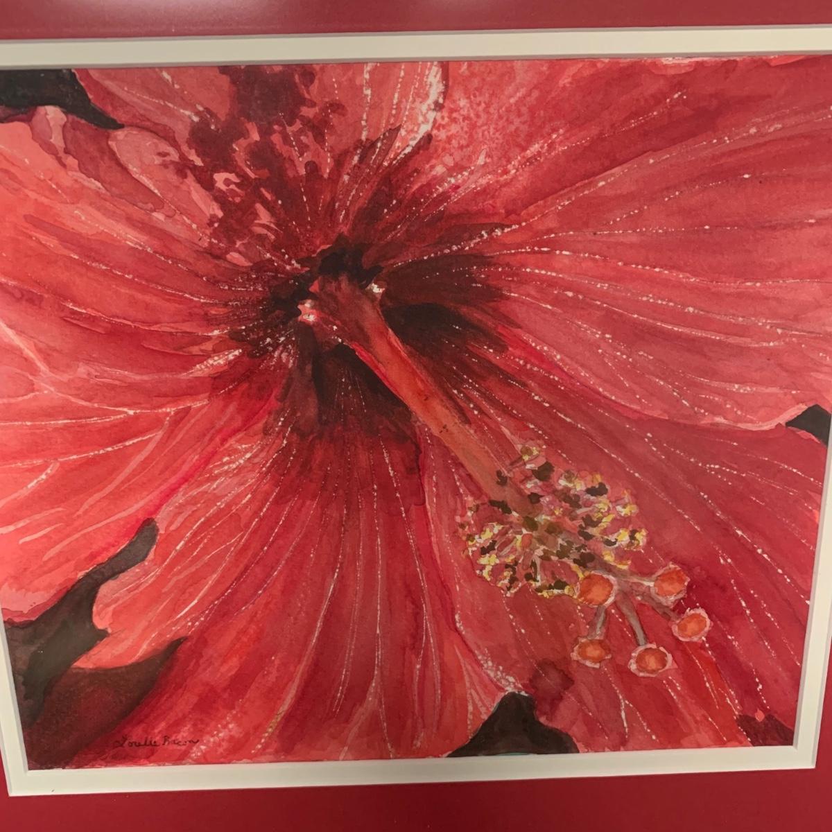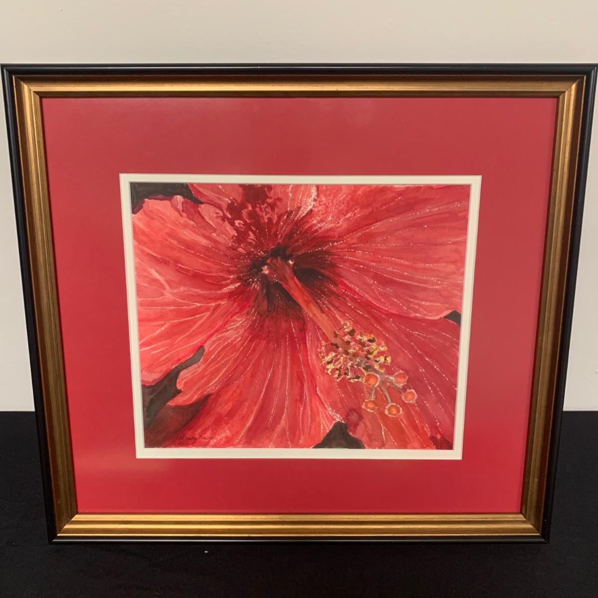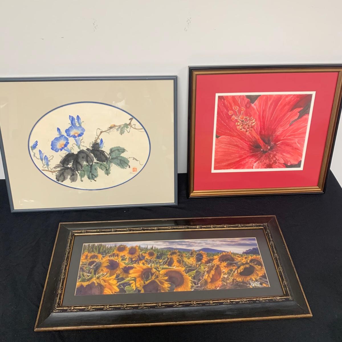 This lot includes three pieces of floral themed art. Included is a sunflower photo, a hibiscus flower by local artist Lorelle Bacon that appears to be water color, and a watercolour art piece signed by a D.K Watson that is numbered. All the pieces have signatures(see photos). The pieces are all framed in metal and wood, and are matted. The largest piece measures about 24in x 12in. Shipping available.