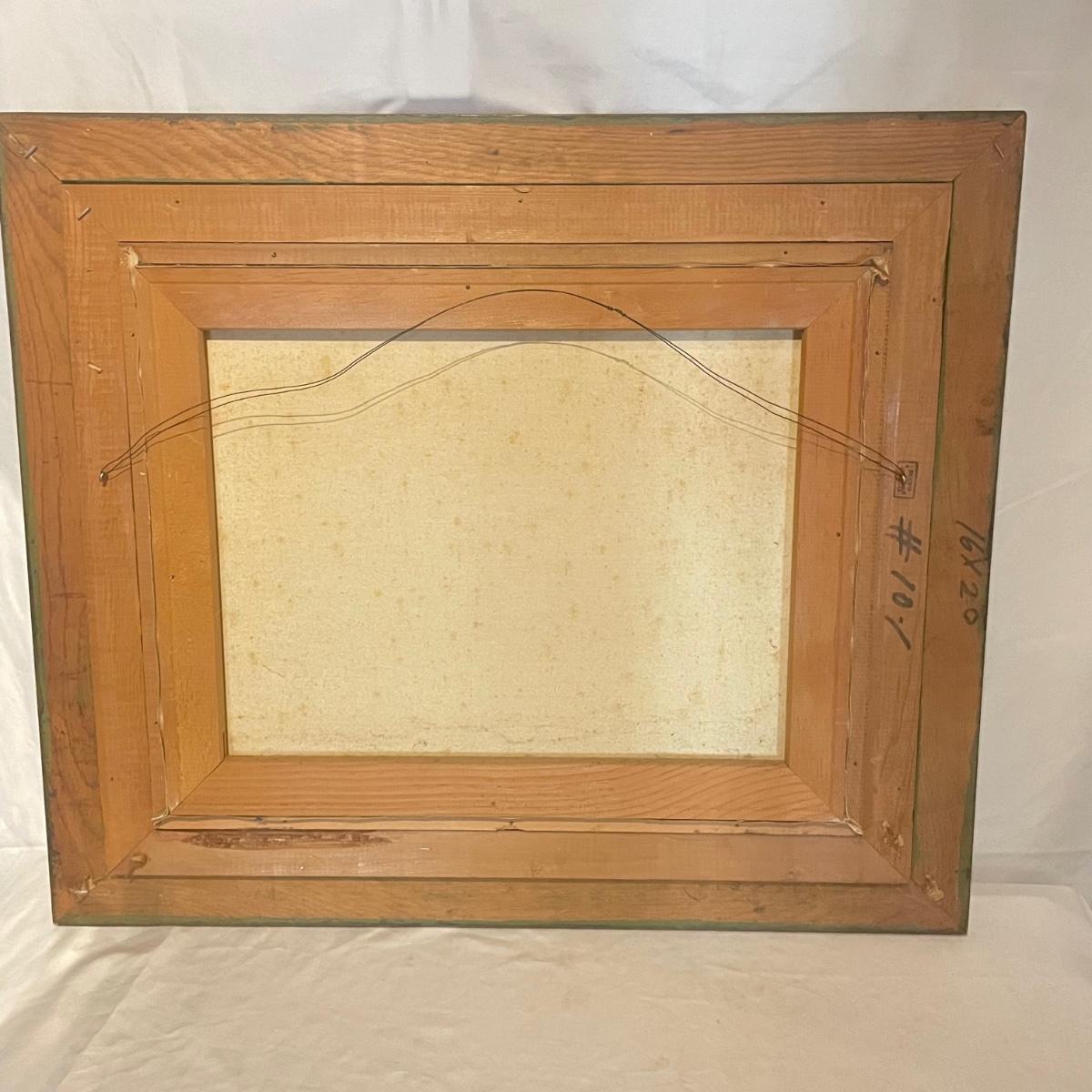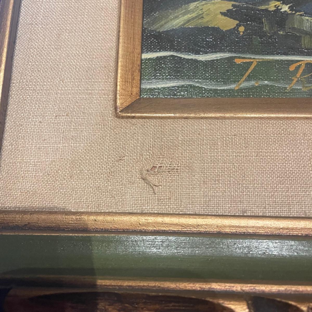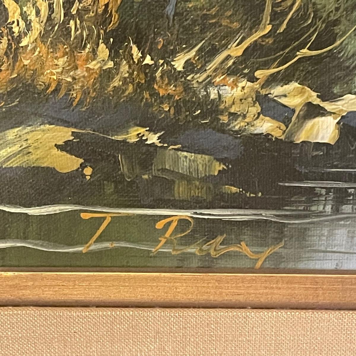 This framed oil on canvas painting has what appears to be an original signature that looks to be T.Ray. It is matted and mounted in a gilded wood frame that measures 28” x 24”. Note there is a small tear in the fabric matting, see images.