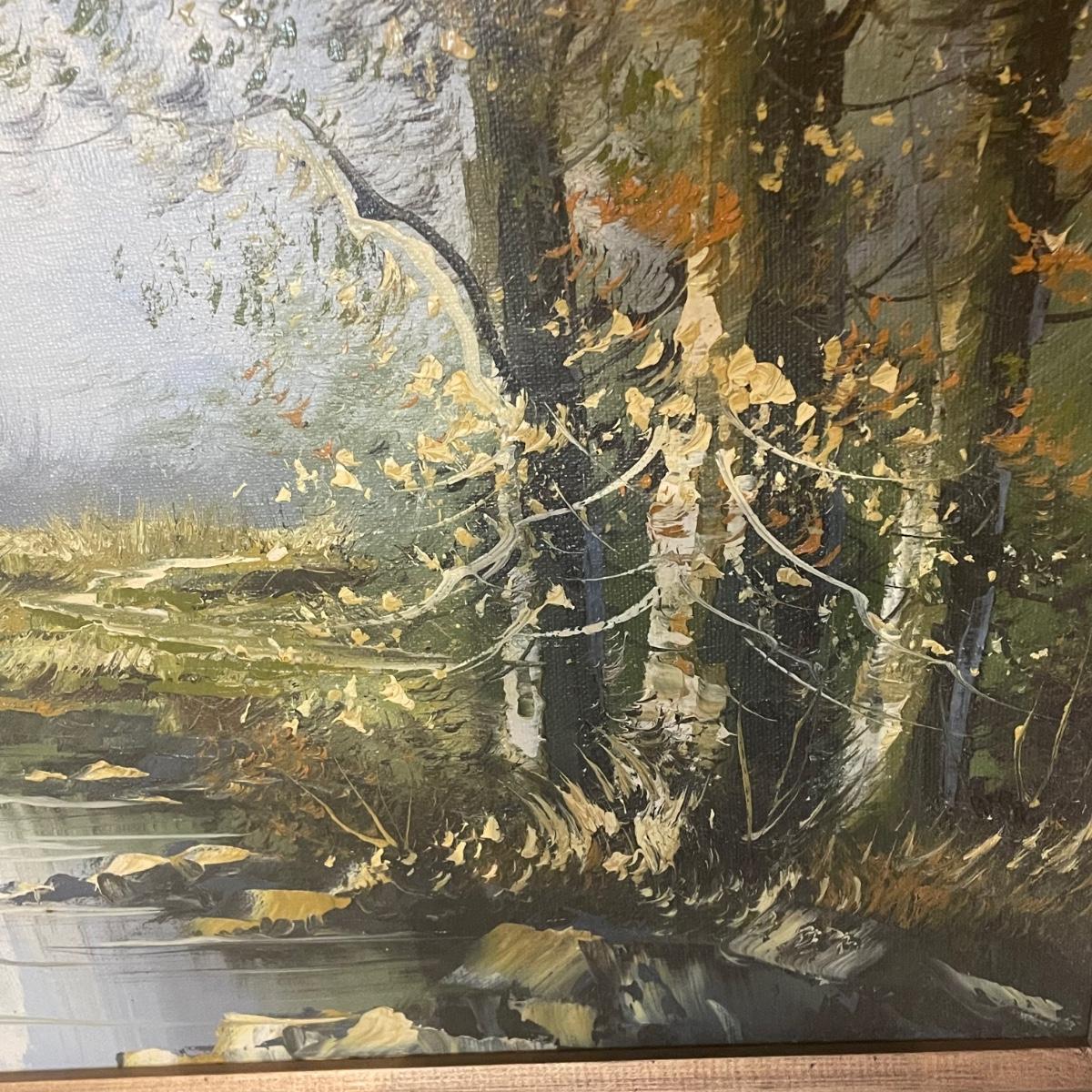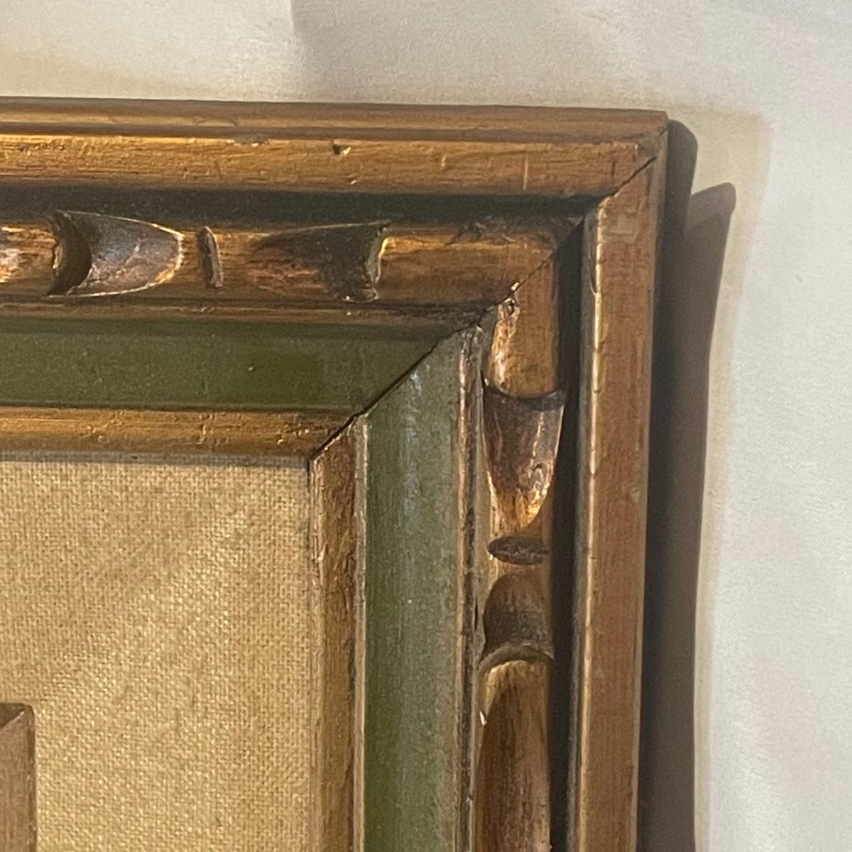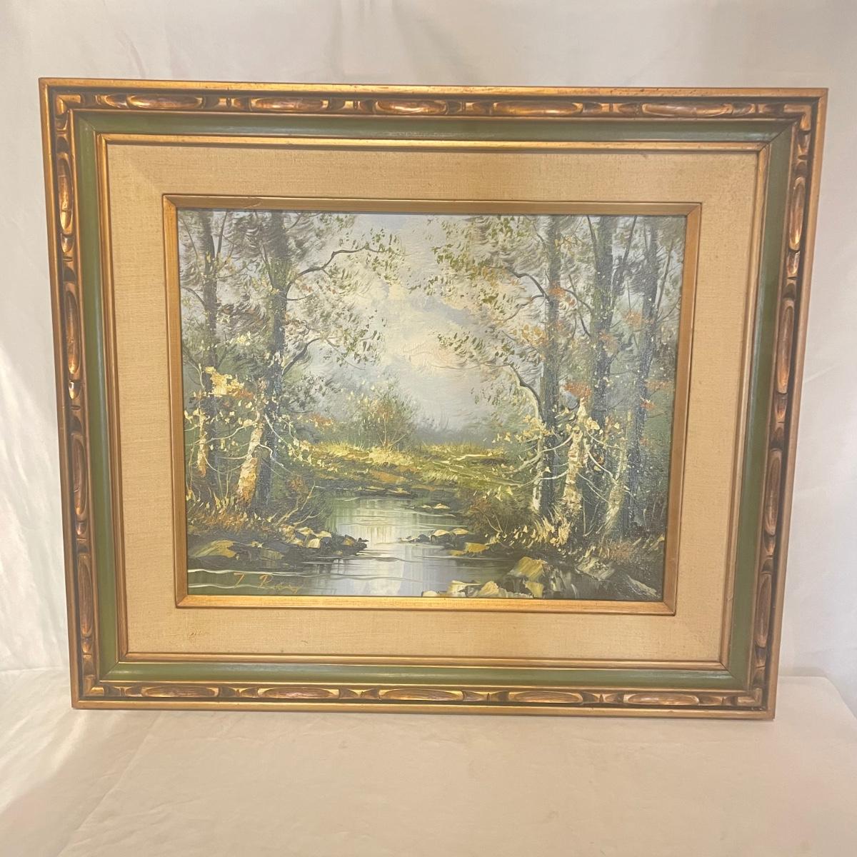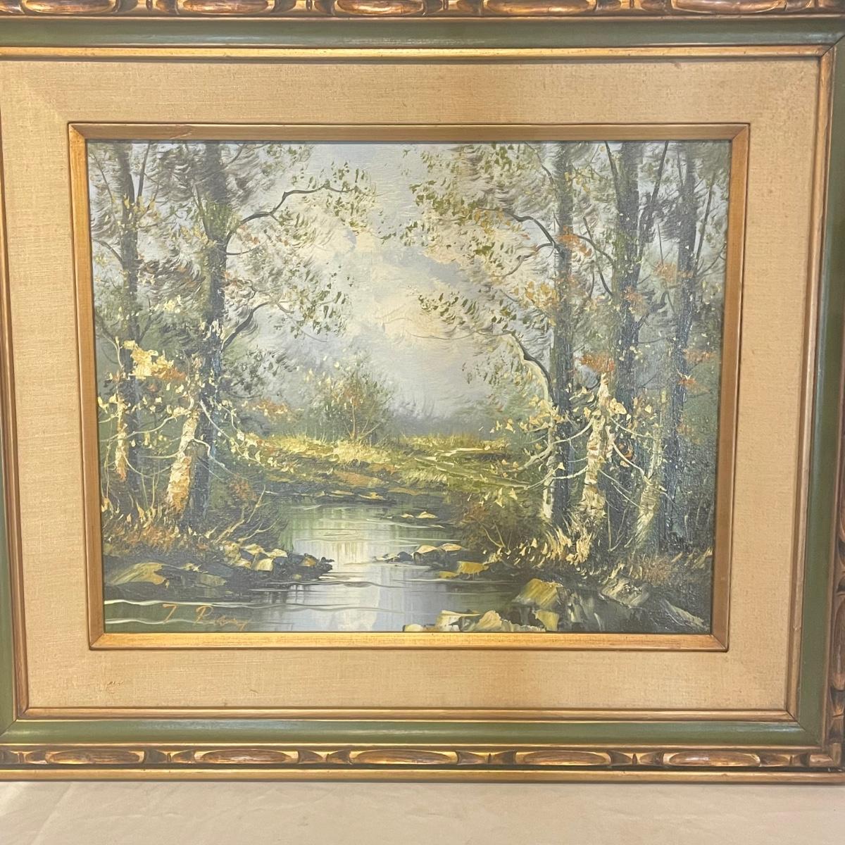 This framed oil on canvas painting has what appears to be an original signature that looks to be T.Ray. It is matted and mounted in a gilded wood frame that measures 28” x 24”. Note there is a small tear in the fabric matting, see images.