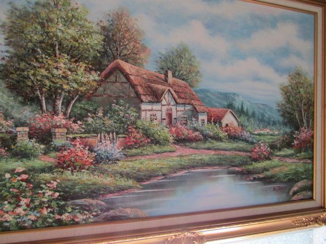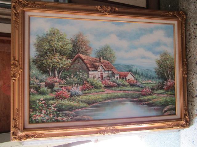 Signed, Framed Wall Art:  English Cottage on Lake (Loc)- 31" x 44 1/4"