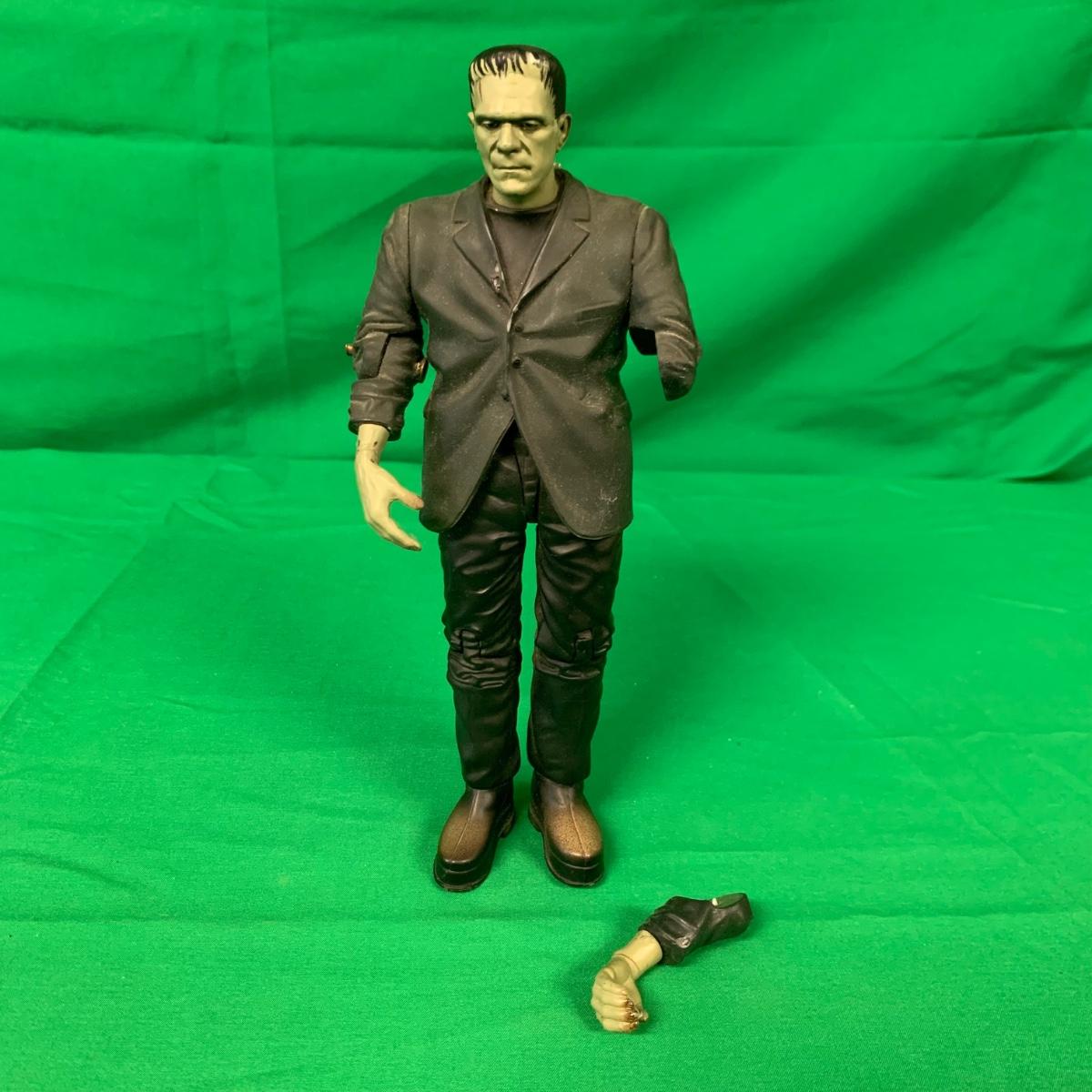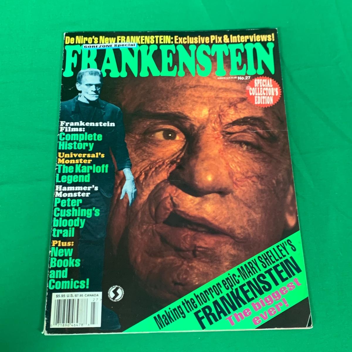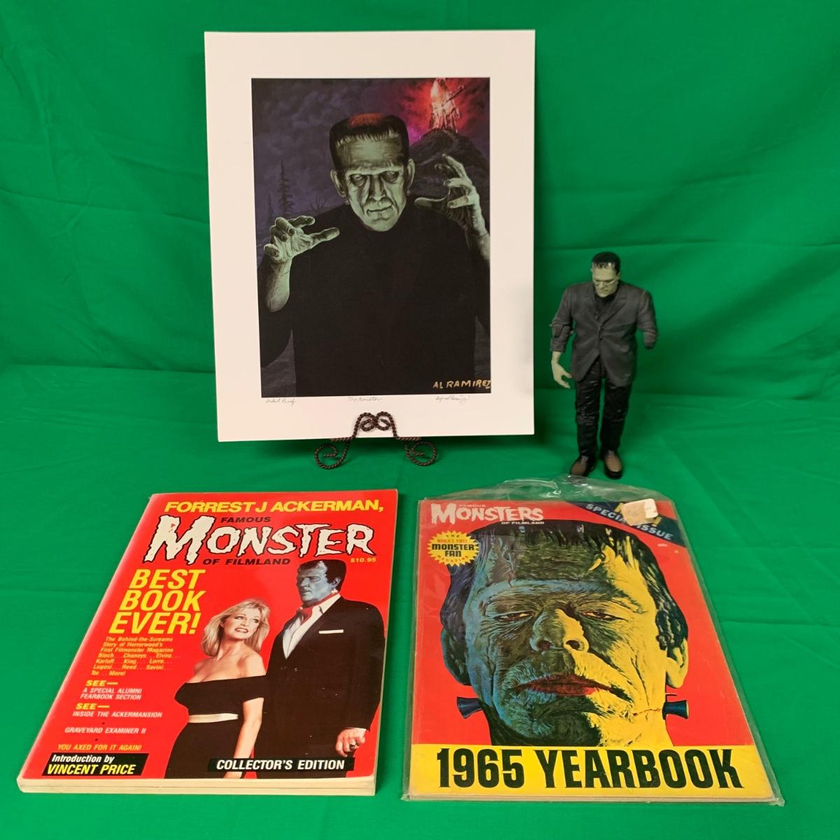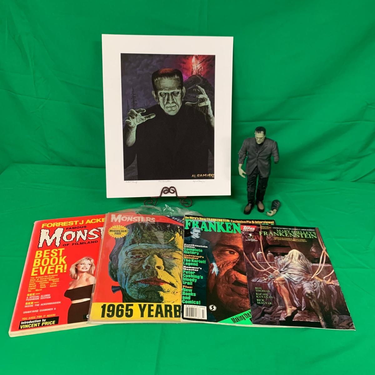 A variety of Frankenstein and other monster related items. Included is a giclee print of original art by Al Ramirez that has been pencil-signed by the artist, as well as a Frankenstein action figure, two issues of “Famous Monsters of Filmland”, a “Mary Shelley’s Frankenstein” by Topps Comics, and “Gorezone Special: Frankenstein”. The giclee print is 11” x 13.5”H. Note the the arm on the action figure is not attached; it could be glued back on.