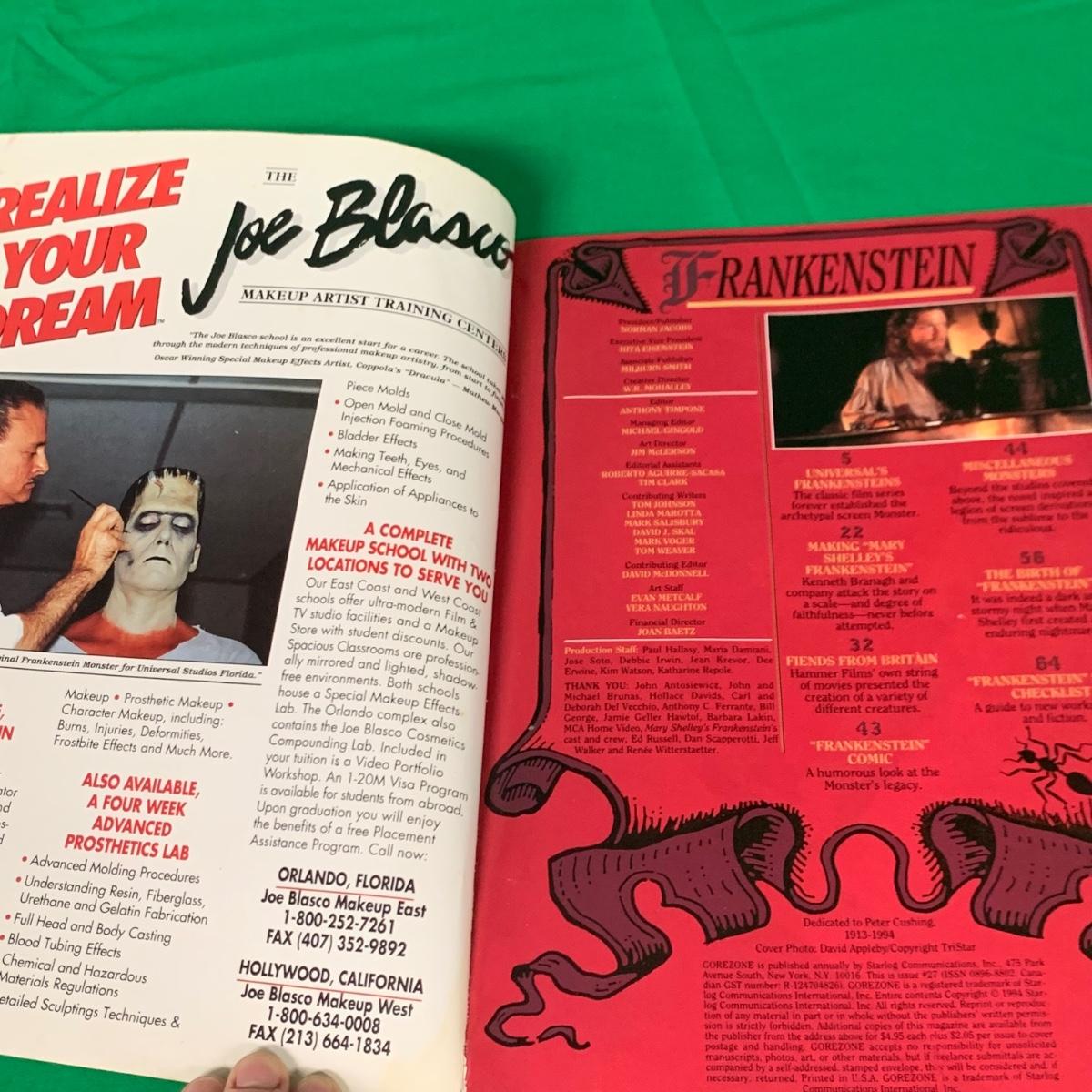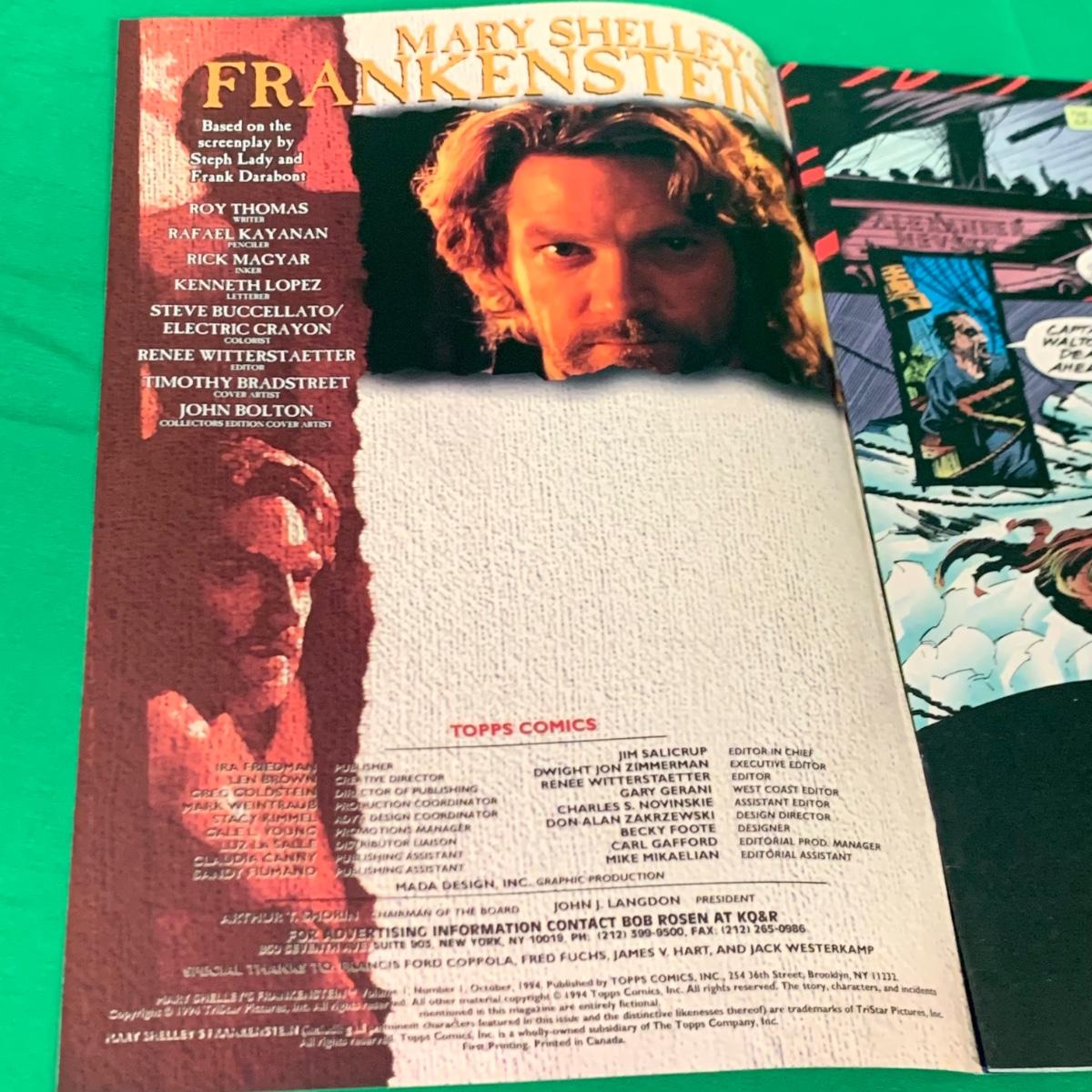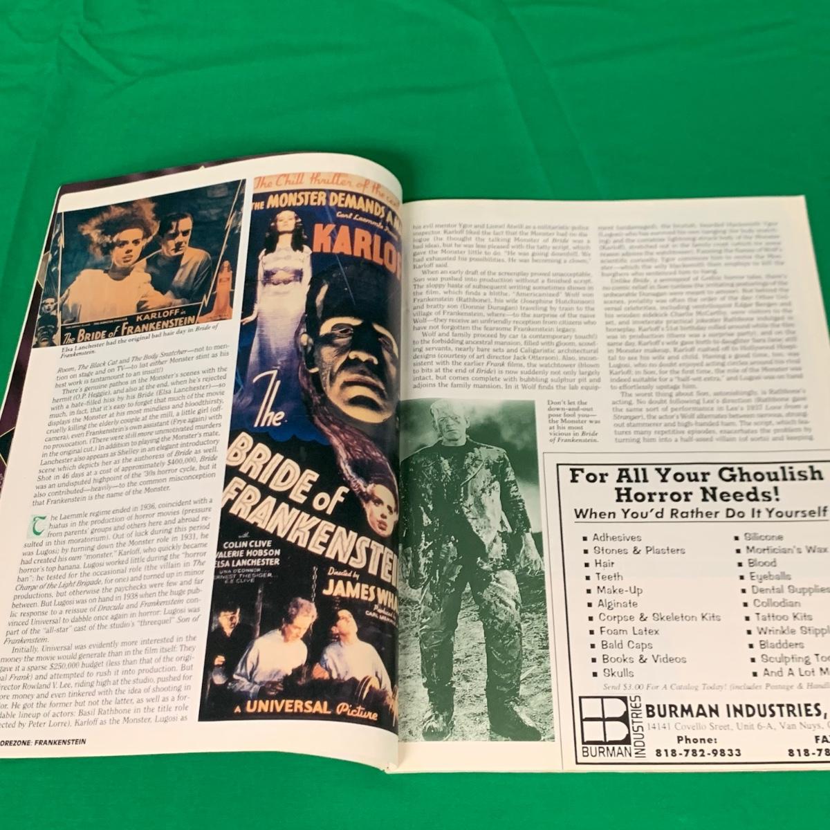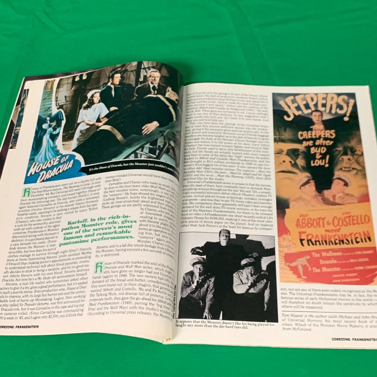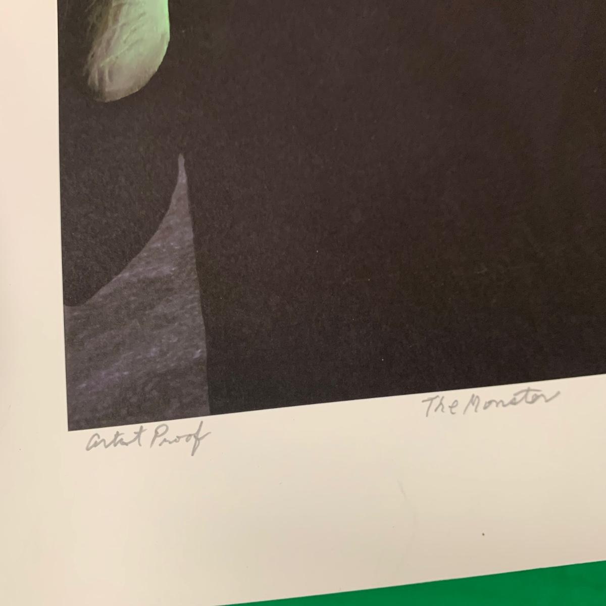 A variety of Frankenstein and other monster related items. Included is a giclee print of original art by Al Ramirez that has been pencil-signed by the artist, as well as a Frankenstein action figure, two issues of “Famous Monsters of Filmland”, a “Mary Shelley’s Frankenstein” by Topps Comics, and “Gorezone Special: Frankenstein”. The giclee print is 11” x 13.5”H. Note the the arm on the action figure is not attached; it could be glued back on.