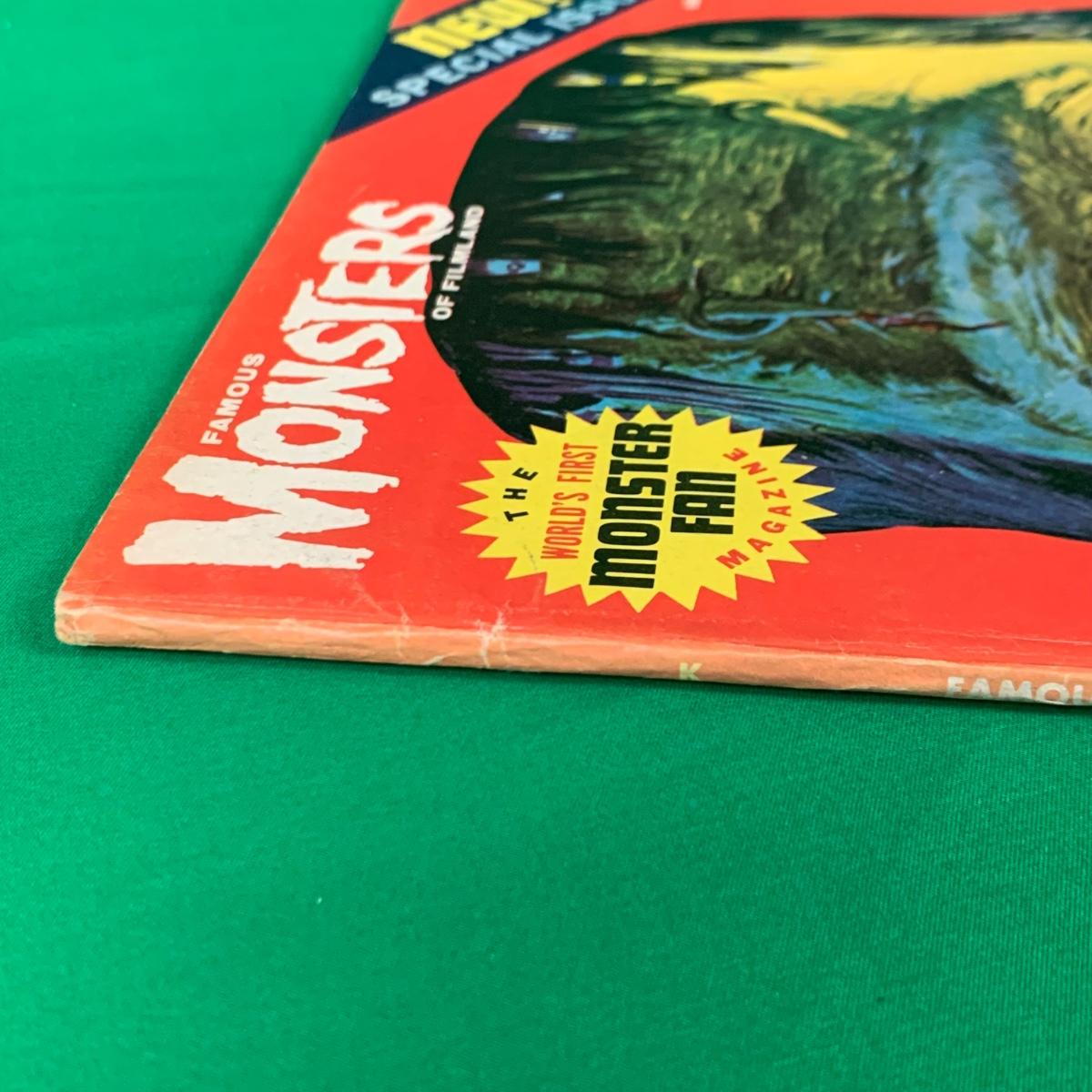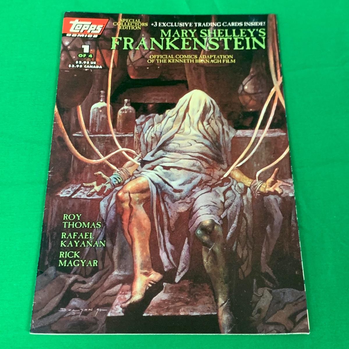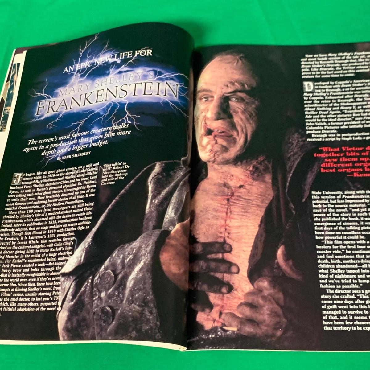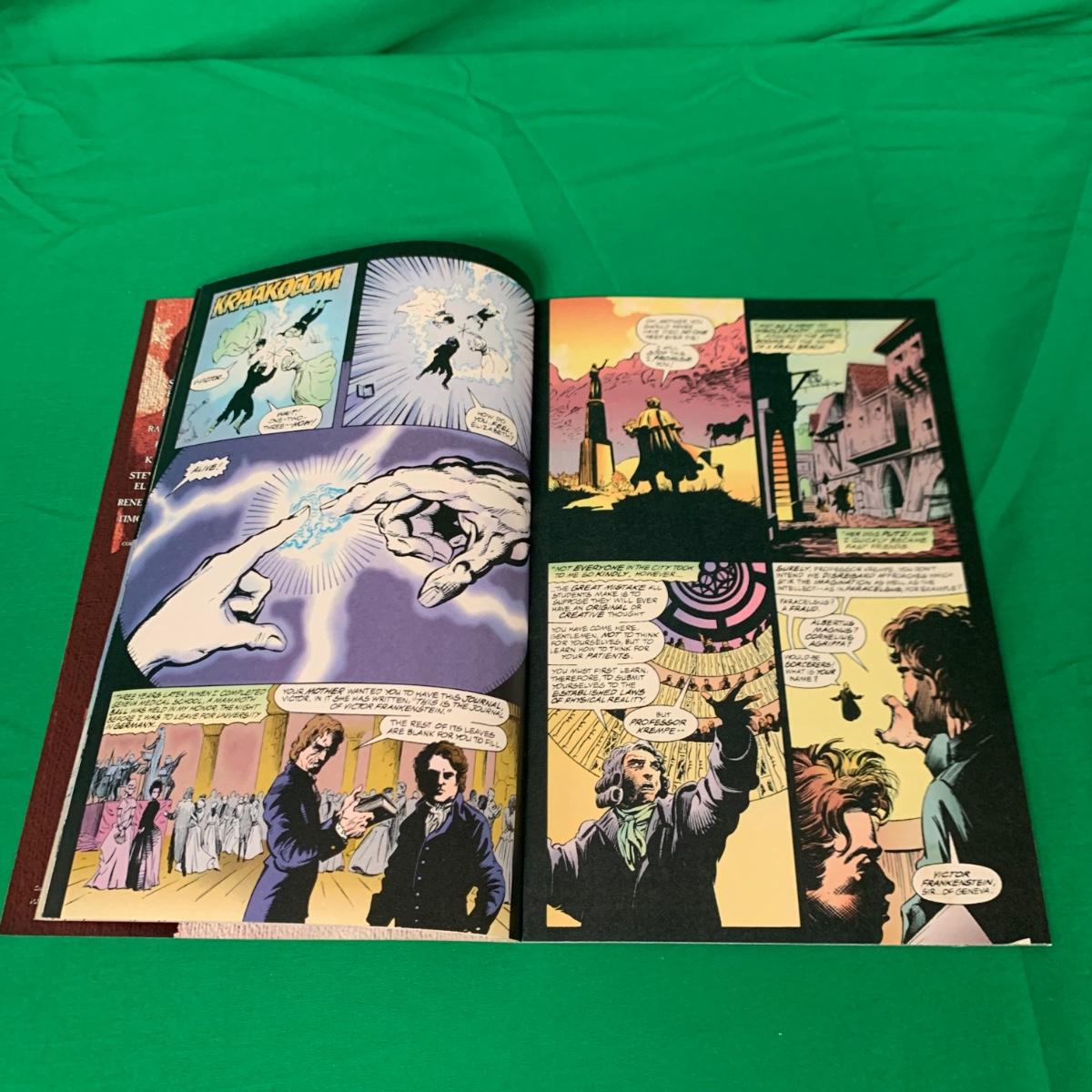 A variety of Frankenstein and other monster related items. Included is a giclee print of original art by Al Ramirez that has been pencil-signed by the artist, as well as a Frankenstein action figure, two issues of “Famous Monsters of Filmland”, a “Mary Shelley’s Frankenstein” by Topps Comics, and “Gorezone Special: Frankenstein”. The giclee print is 11” x 13.5”H. Note the the arm on the action figure is not attached; it could be glued back on.
