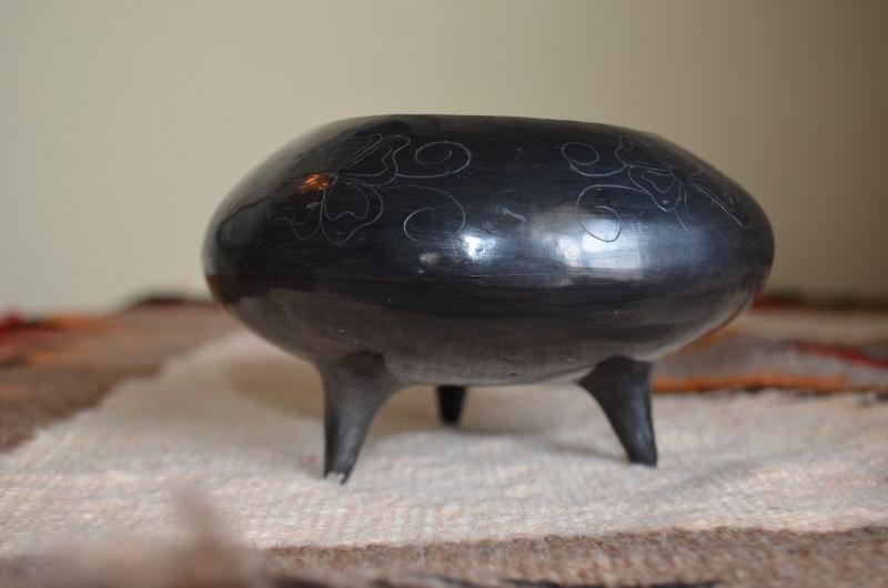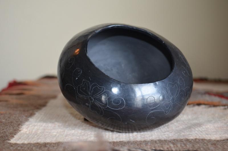 SIGNED GARCIA BLACK 6" DIAMETER FOOTED POT BLACK CLAY DECORATED WITH FLOWERS PRIMITIVE PC.