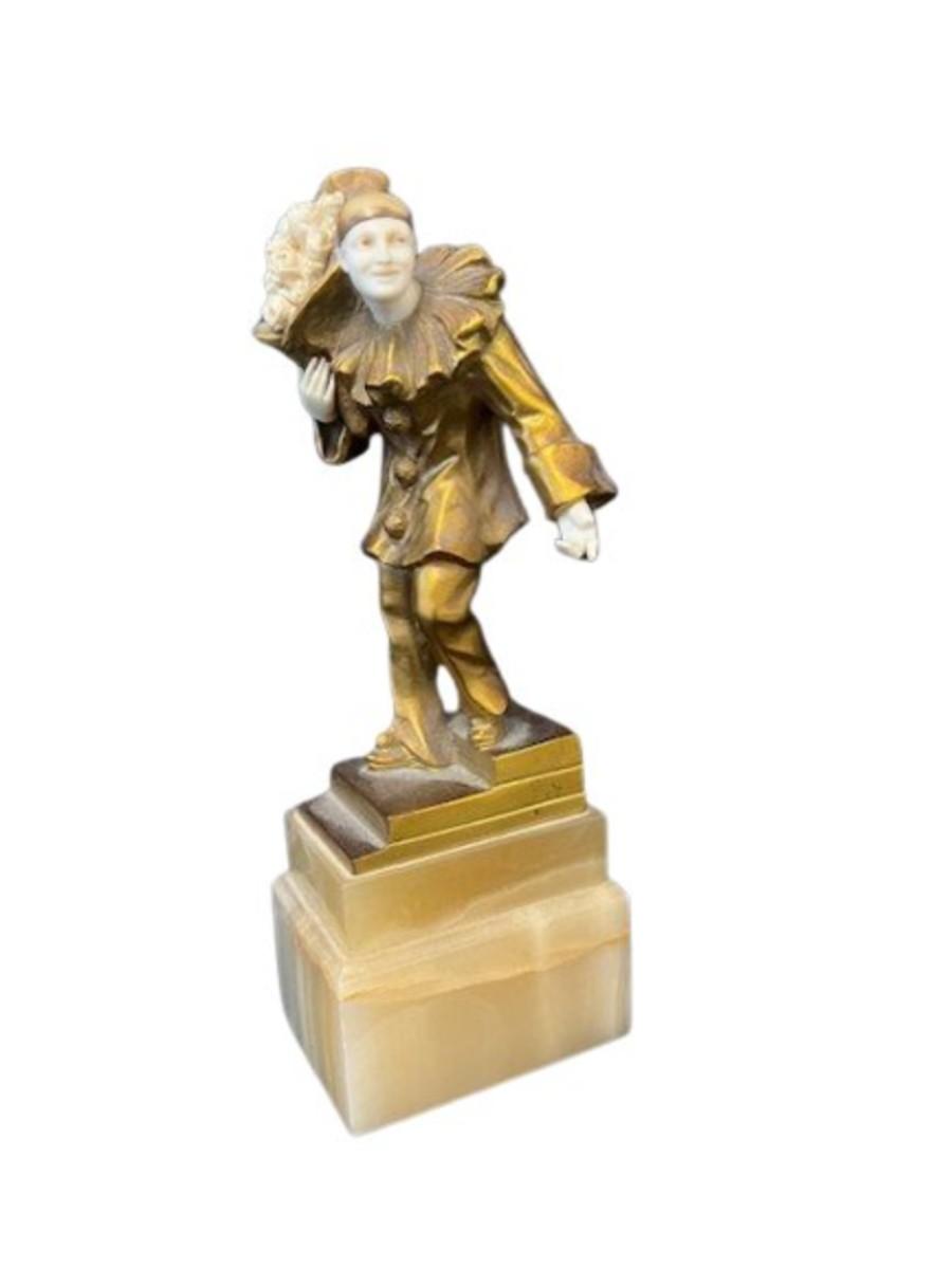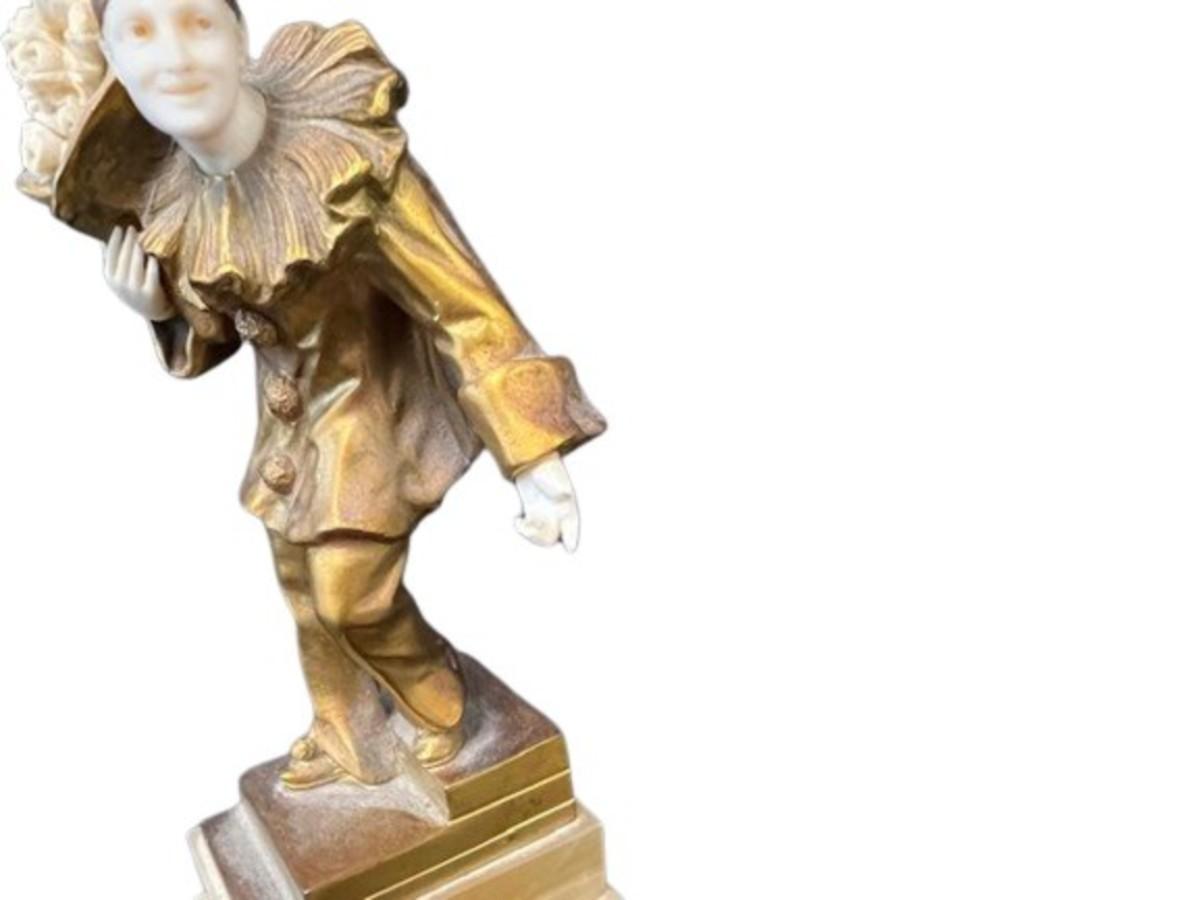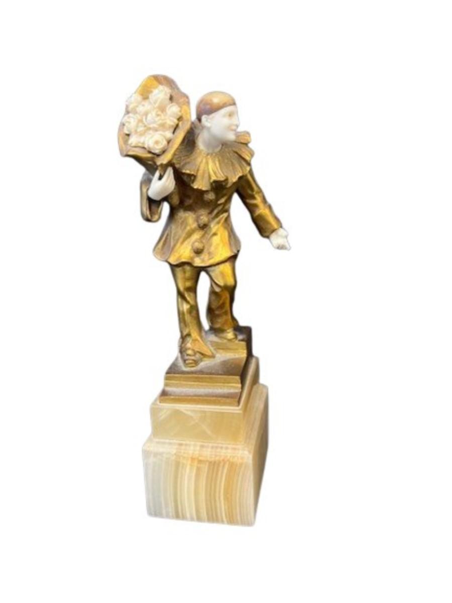 **WINNING BIDDER MUST PRESENT VALID FLORIDA ID AT LOCAL PICKUP.** Pierrot with flowers. Bronze and ivory construction. Has a chipped index finger and thumb (pictured). Measurement: 7.5"H x 4.25"W. Pre-auction estimate: $3,000-4,000. [KA]